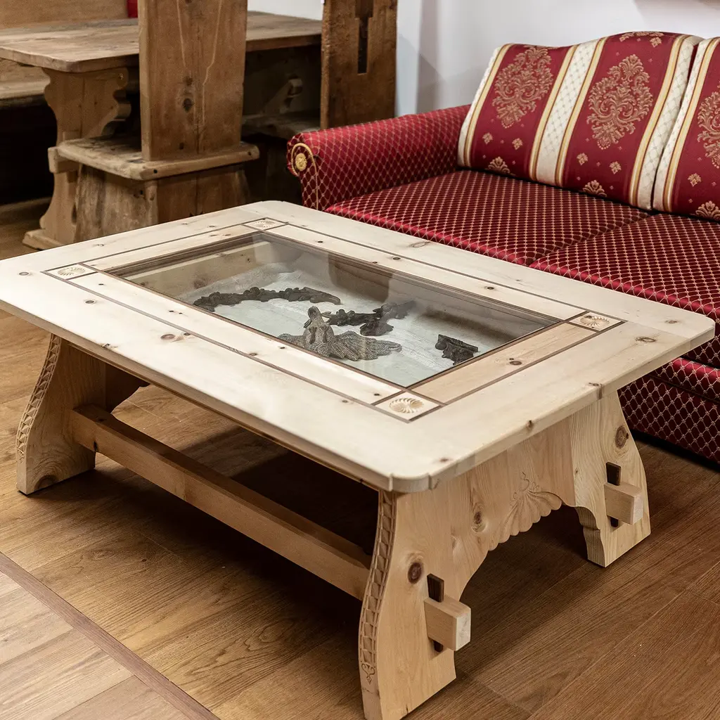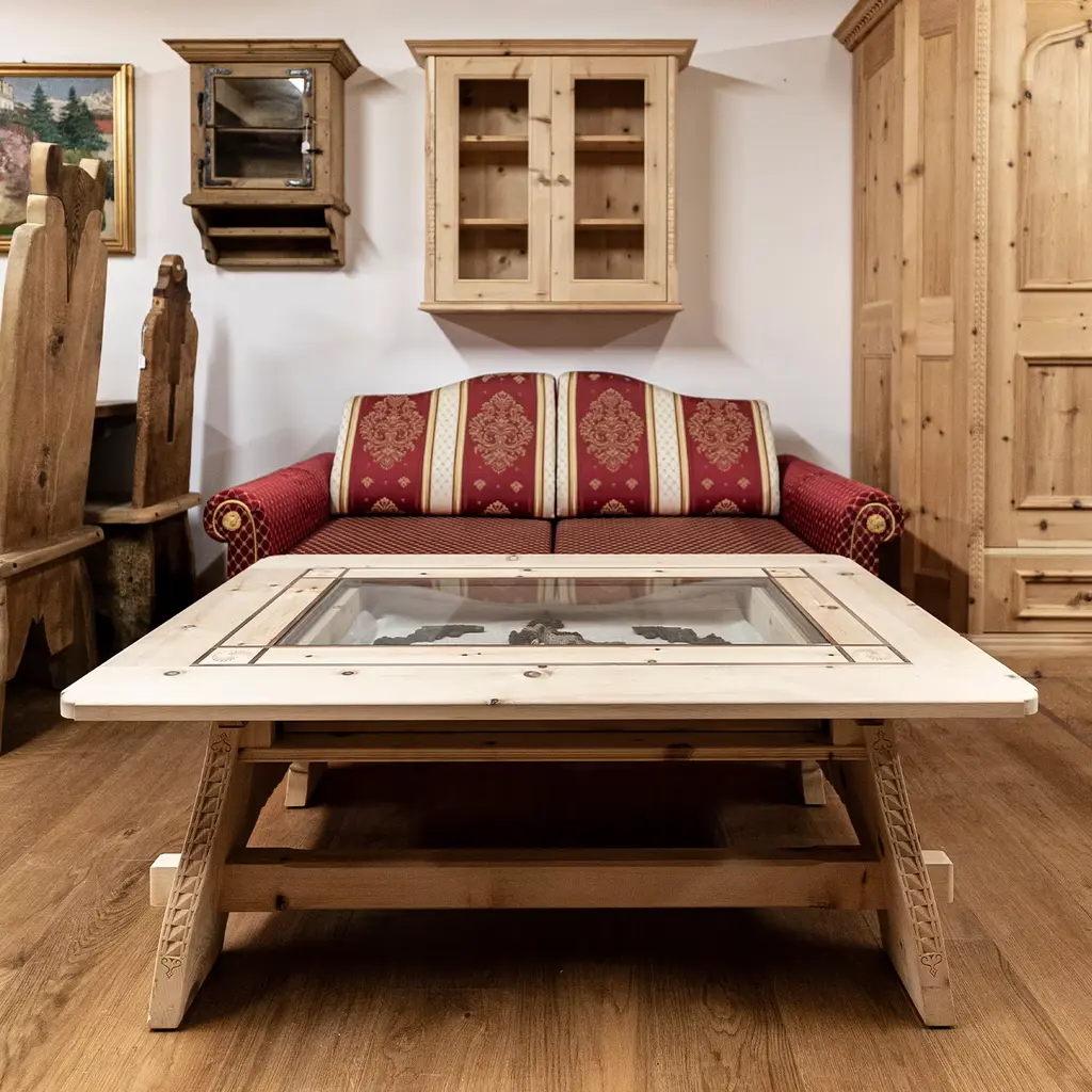 A true work of art to adorn a rustic-chic modern interior of a mountain chalet or a countryside villa, this exquisite coffee table is sculpted by hand in a stunningly sophisticated and detailed design. Handcrafted of pinewood, it features a glass insert showcasing ancient dark larch wood inlay works. Embellished with handmade details, and a drawer that opens up from two sides.