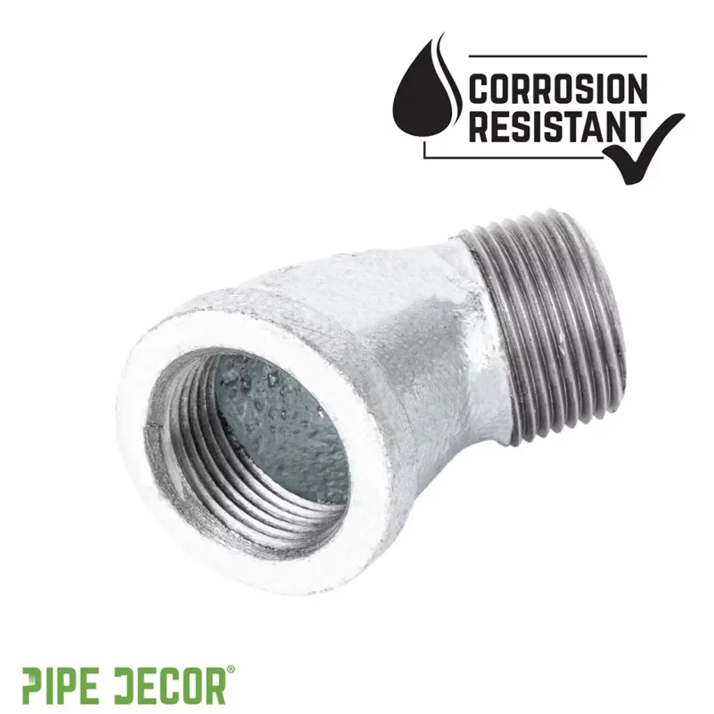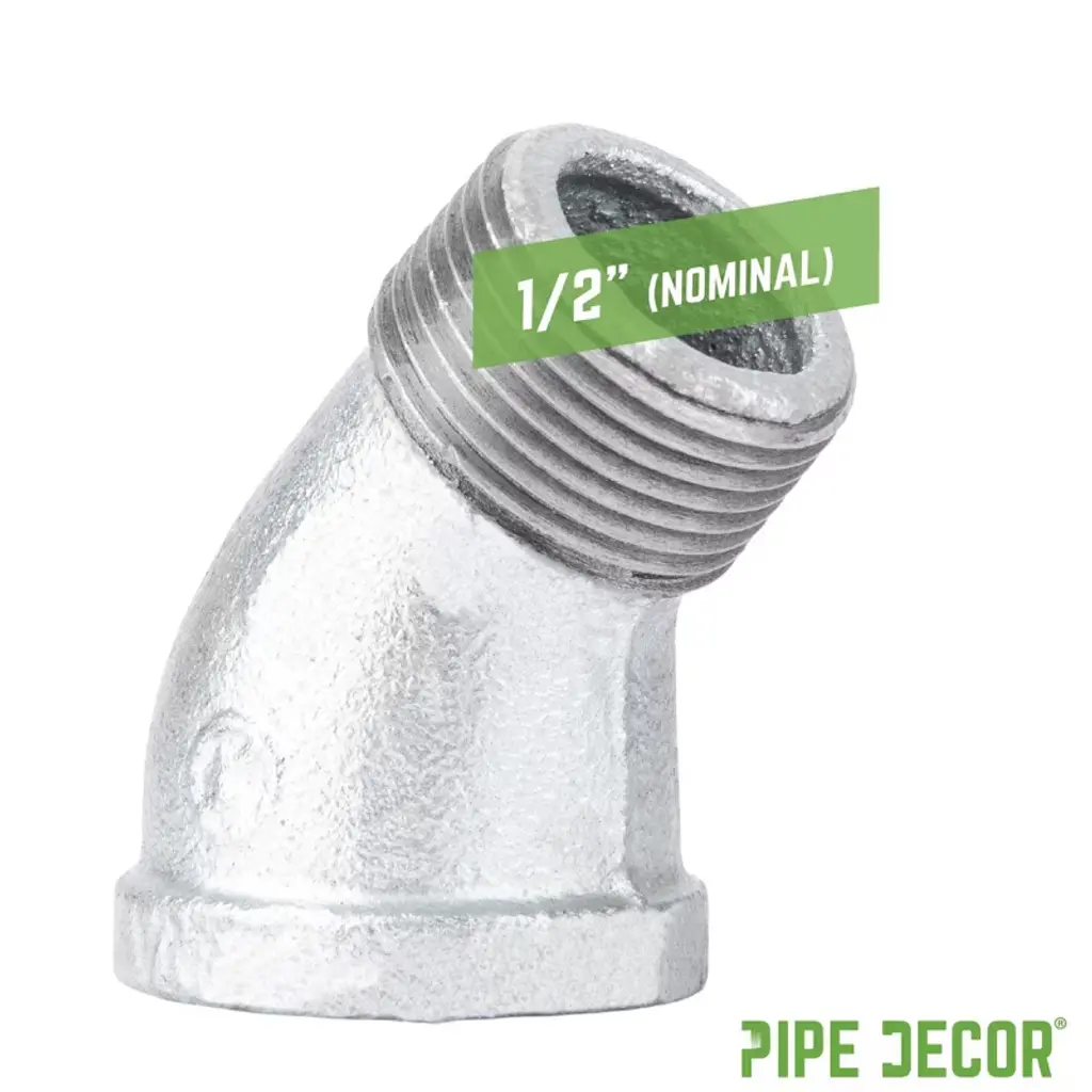 Add a modern look to your DIY projects with galvanized 45-degree angle street elbows. Use them to create a one-of-a-kind desk, coffee table, or piece of art, getting that perfect angle every time. Galvanized fittings feature a silver color with a shiny finish, giving your pipe furniture a clean, polished look. Made from durable, industrial-grade malleable iron, these fittings are 100% authentic and built to stand the test of time. You will recognize PIPE DECOR parts and accessories by their unmistakable combination of beauty and strength—real industrial fittings for your decorations and designs. Accept no substitutes. Extra pieces and accessories are available for custom projects and expansions, allowing you to plug and play as desired. These galvanized pipe fittings are corrosion-resistant and ideal for DIY furniture projects without worrying about rust. They are project-ready and require no cleaning or sealing before use. Iron fittings complement a wide variety of styles and aesthetics, including steampunk lighting, industrial, factory, French country farmhouse, vintage, retro, reclaimed, DIY customized, modern, and more. IPS threads ensure compatibility with other project materials, such as lamp parts, valves, and additional PIPE DECOR furniture kits of the same diameter.