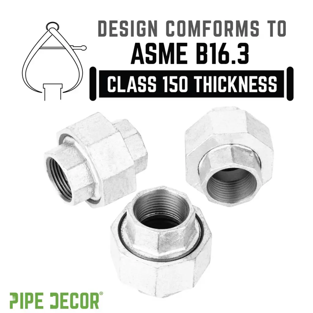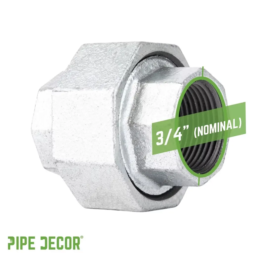 Add an industrial edge to your DIY projects with this galvanized union. Designed for sophisticated pipe designs, it enables you to create a perfect loop, as seen in our Loop coffee table—something that would be impossible without the union. Galvanized fittings feature a silver finish that brings a clean, polished look to your pipe furniture. Made from durable, industrial-grade malleable iron, these fittings are 100% authentic and built to stand the test of time. You will recognize PIPE DECOR parts and accessories by their quality—beauty and beast, strength and style. These are real industrial fittings for your decorations and designs, so accept no substitutes. Extra pieces and accessories are available for custom projects and expansions, allowing you to plug and play as desired. Galvanized pipe fittings are corrosion-resistant, making them ideal for DIY furniture without worrying about rust. They are project-ready, requiring no cleaning or sealing before use, and complement a wide range of aesthetics, including steampunk lighting, industrial, factory, French country farmhouse, vintage, retro, reclamation, DIY customized, modern, and more. IPS threads provide compatibility with other project materials such as lamp parts, valves, and additional pipes, fittings, and PIPE DECOR furniture kits of the same diameter.