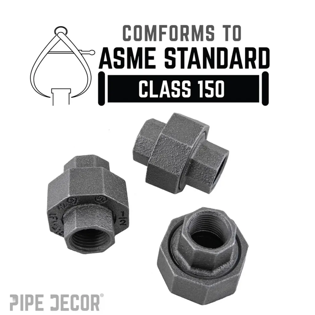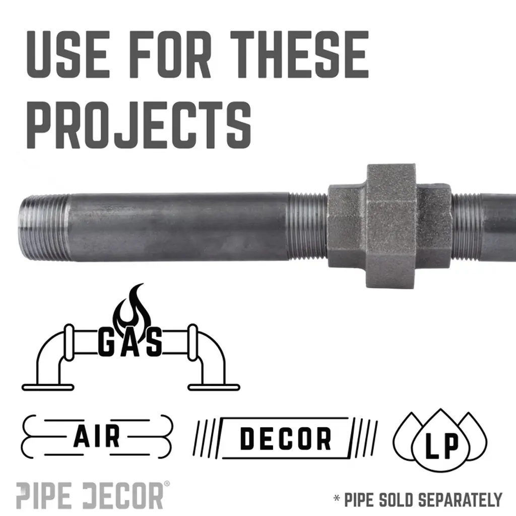 Add an industrial edge to your DIY projects with the union fitting, perfect for creating fully connected loops like those in our Loop coffee table. Without it, completing a pipe loop would be impossible. Made from durable, industrial-grade malleable iron, PIPE DECOR fittings are authentic, built to last, and combine strength with style. Extra pieces and accessories are available for custom projects and expansions. Ideal for any DIY project, these iron fittings complement a variety of aesthetics, including industrial, steampunk, farmhouse, vintage, modern, and more. IPS threads ensure compatibility with lamp parts, valves, and other PIPE DECOR kits. Each fitting should be cleaned and sealed before use.