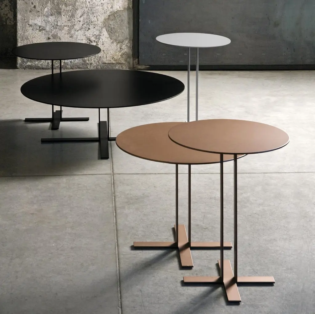 A light, crisp and stylish table with a strong, clean design and an elegant, dainty spirit. Metal base and MDF top. Available in a matt lacquered finish.The designer Giuseppe Viganò is dedicated to the industrial design of furniture products and to the artistic direction of companies in the sector. He also provides graphic consulting for the production of catalogues, getting directly involved in the photography, page layout, communication and advertising pages. He designs trade fair layouts and permanent furniture shops or temporary areas for specific events and personally intervenes by indicating the choice of products and scenery design. In 2007 he started working with Saba Italia by endorsing several projects which embraced the whole company’s identity, he then became the artistic manager of the Company.Additional information:Material: Metal, MDFBase: Metal Top: MDFFinish: Matt lacquered silver Dimensions: Ø 50 x 42 H cmAvailable in other finish options: Matt lacquered white, matt lacquered black, matt lacquered bronzeAvailable in other size options: Small, large