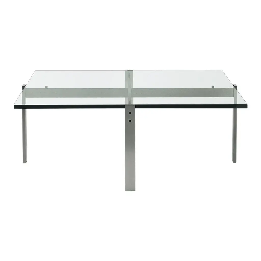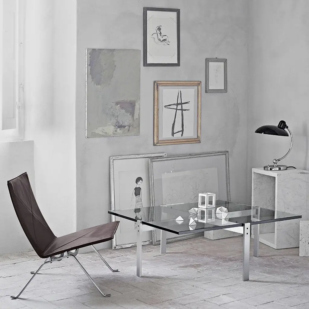 The PK65 coffee table is available in: slate, marble, granite and glass. The base is made of satin brushed stainless steel.