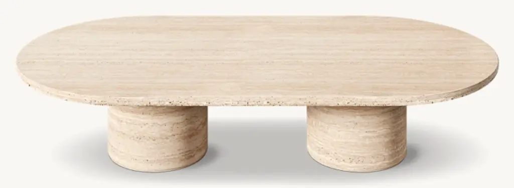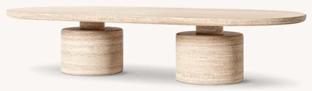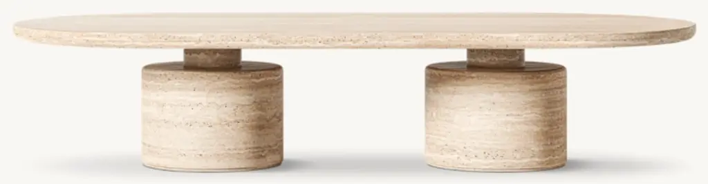 Evoking the expressive designs of 1970s postmodernism, the Ponti coffee table combines a bold geometric silhouette with the beauty of carved stone. Grounded in a pair of pedestal bases that support a slender top, the dynamic form is marked by a cinched midsection. Tonal variations and rich vein patterning make each piece one of a kind. SHOP THE ENTIRE COLLECTION