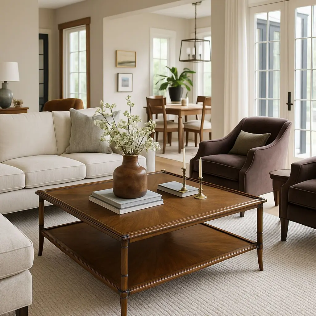This two-tier coffee table is crafted of hardwood solids and expressive prima vera veneers with faux-bamboo legs and leather-wrapped joints, which add strength and durability as well as textural contrast. A warm hazelnut finish completes the design.