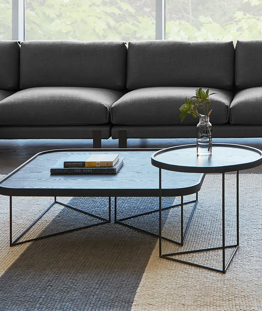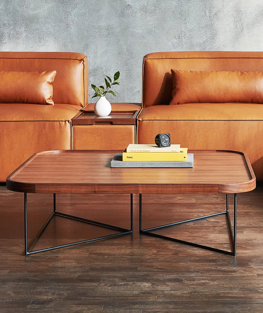 The Square Porter Coffee Table offers an expansive, low-profile surface with refined, modern elements. It features a veneered wood top and a raised, solid wood edge detail with rounded corners. The eye-catching base features an architectural arrangement of two, powder-coated metal triangles. Part of the Porter Series, it is designed to nest with the Porter Side Table.