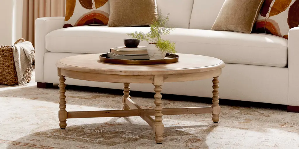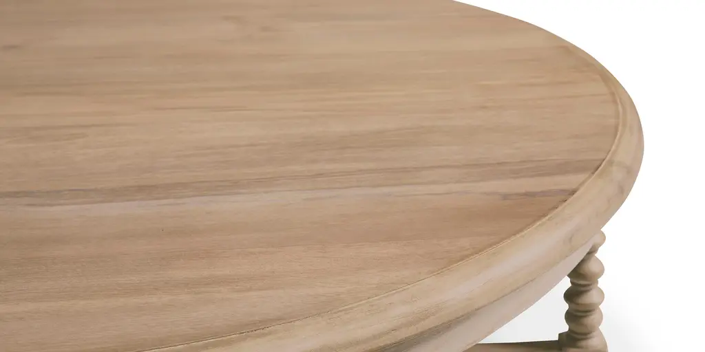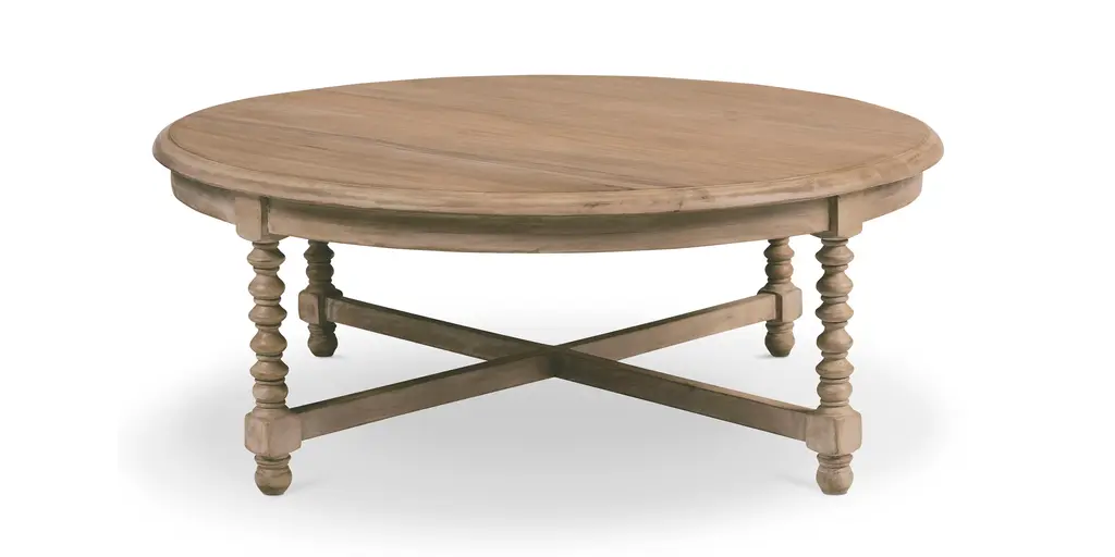 The Portsmouth Round Cocktail Table can utterly transform your room with the artisan look of its intricately turned mango wood legs. The unique turning of the spindles on this round table was inspired by the pinnacles and spires of ancient temples. Thats why, from modern settings to classic, the timeless character of this table will pay a stylish homage to your design intentions. The entire table, spindles included, features a glaze-enhanced, clear-coated finish designed to show off the natural color variation and knots of the wood. The X-base provides the right amount of support with an artfully restrained footprint. Its circular design and just-right sizing give this table a sense of belonging in nearly any space.