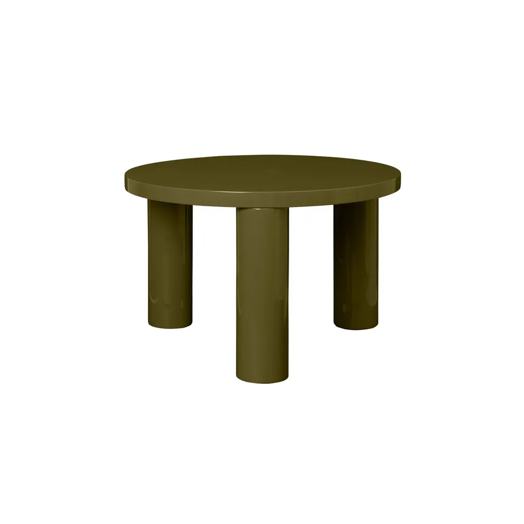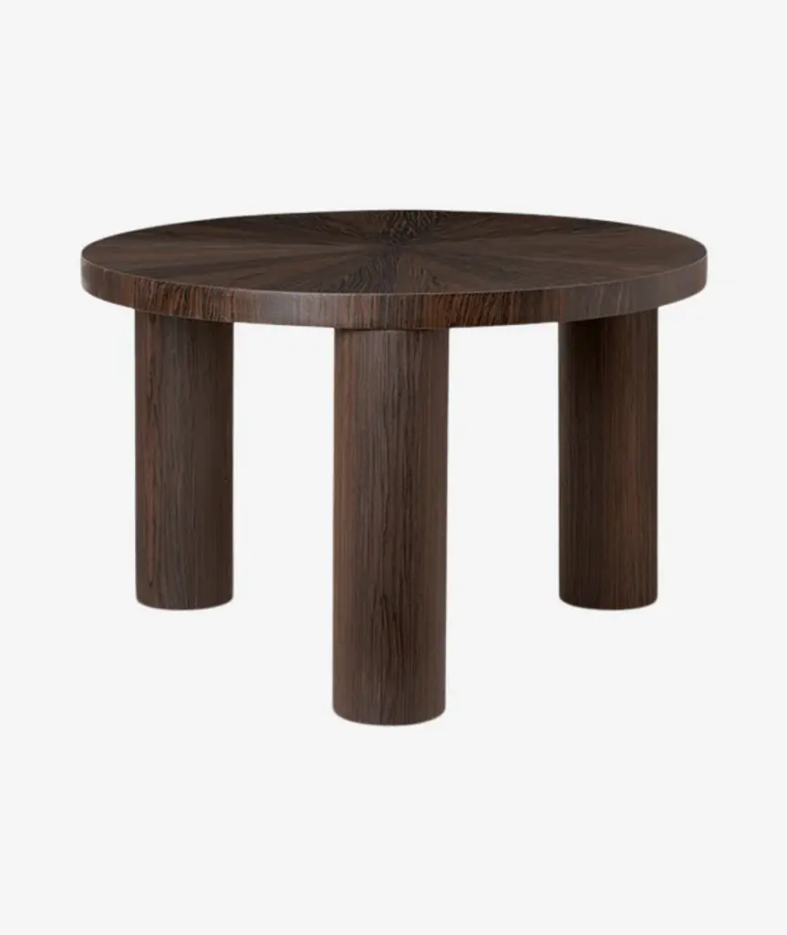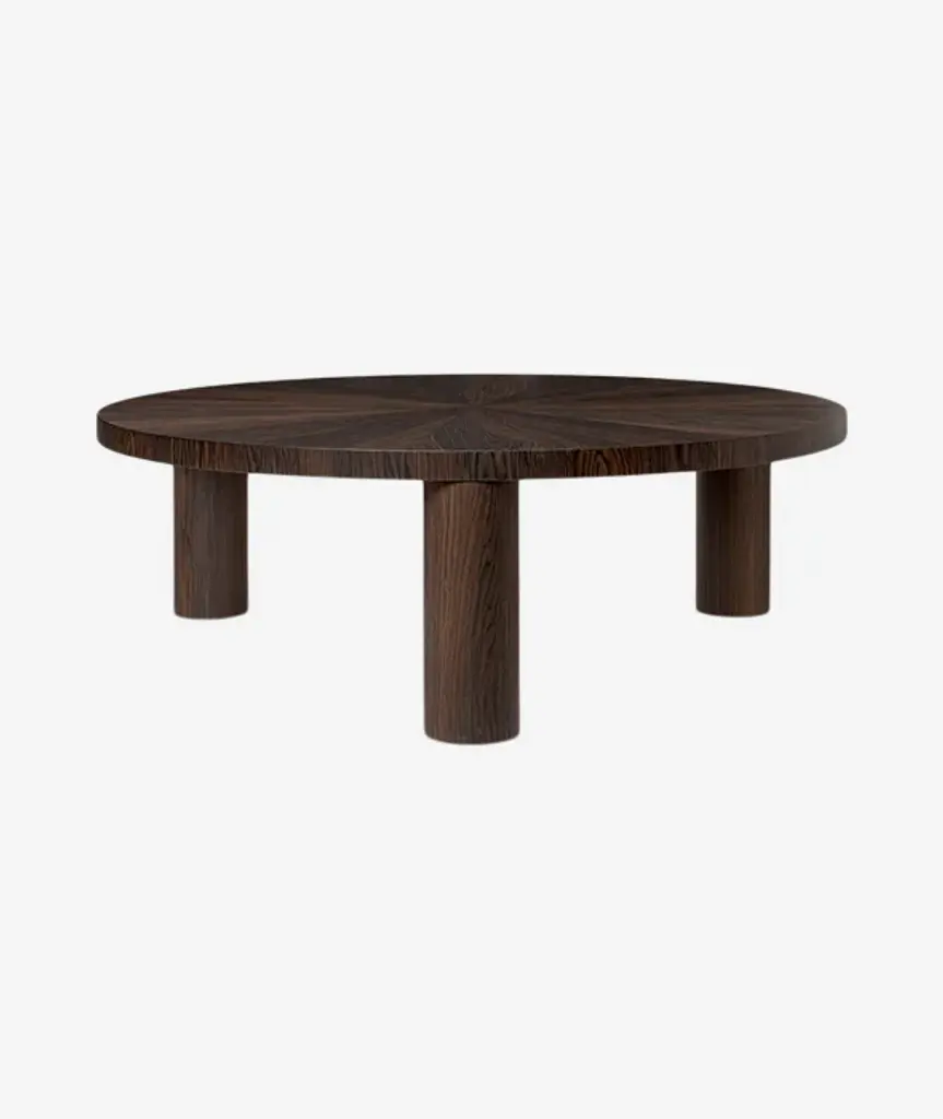 The legacy of Brutalist architecture meets Scandinavian refinement in Ferm Living's solidly proportioned wood coffee table tempered with intricate detailing. Sustainably crafted from FSC-certified timber, Post has three robust cylindrical legs and is embellished with hand-assembled inlaid marquetry. The smaller, higher model features a tabletop with a starburst pattern in spherical sectors while the larger, lower table has striped veneer marquetry legs. Each one is striking on also its own or they can be grouped in an impressive pairing.
