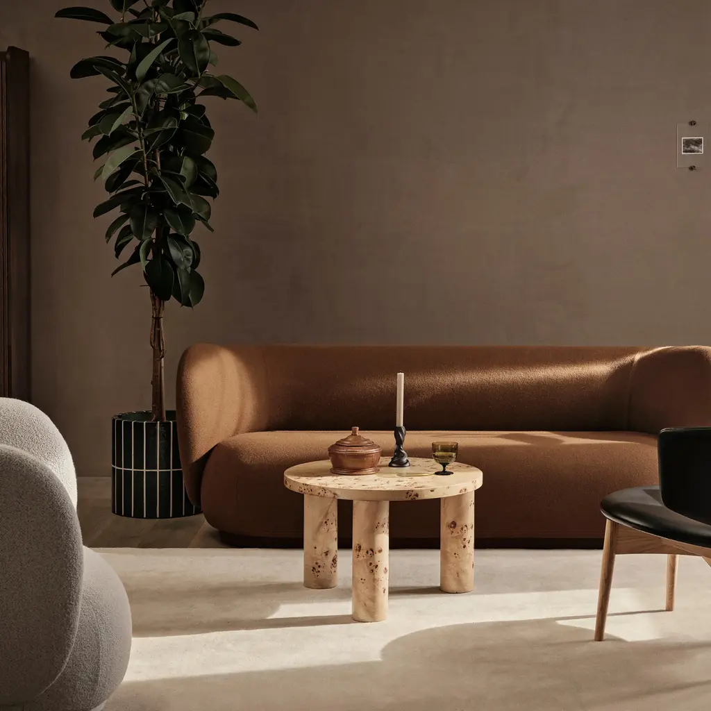 The legacy of Brutalist architecture meets Scandinavian refinement in Ferm Living's solidly proportioned wood coffee table tempered with intricate detailing. Sustainably crafted from FSC-certified timber, Post has three robust cylindrical legs and is embellished with hand-assembled inlaid marquetry. The smaller, higher model features a tabletop with a starburst pattern in spherical sectors while the larger, lower table has striped veneer marquetry legs. Each one is striking on also its own or they can be grouped in an impressive pairing.