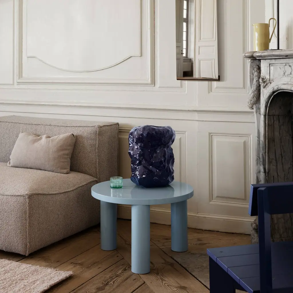 The legacy of Brutalist architecture meets Scandinavian refinement in Ferm Living's solidly proportioned wood coffee table tempered with intricate detailing. Sustainably crafted from FSC-certified timber, Post has three robust cylindrical legs and is embellished with hand-assembled inlaid marquetry. The smaller, higher model features a tabletop with a starburst pattern in spherical sectors while the larger, lower table has striped veneer marquetry legs. Each one is striking on also its own or they can be grouped in an impressive pairing.