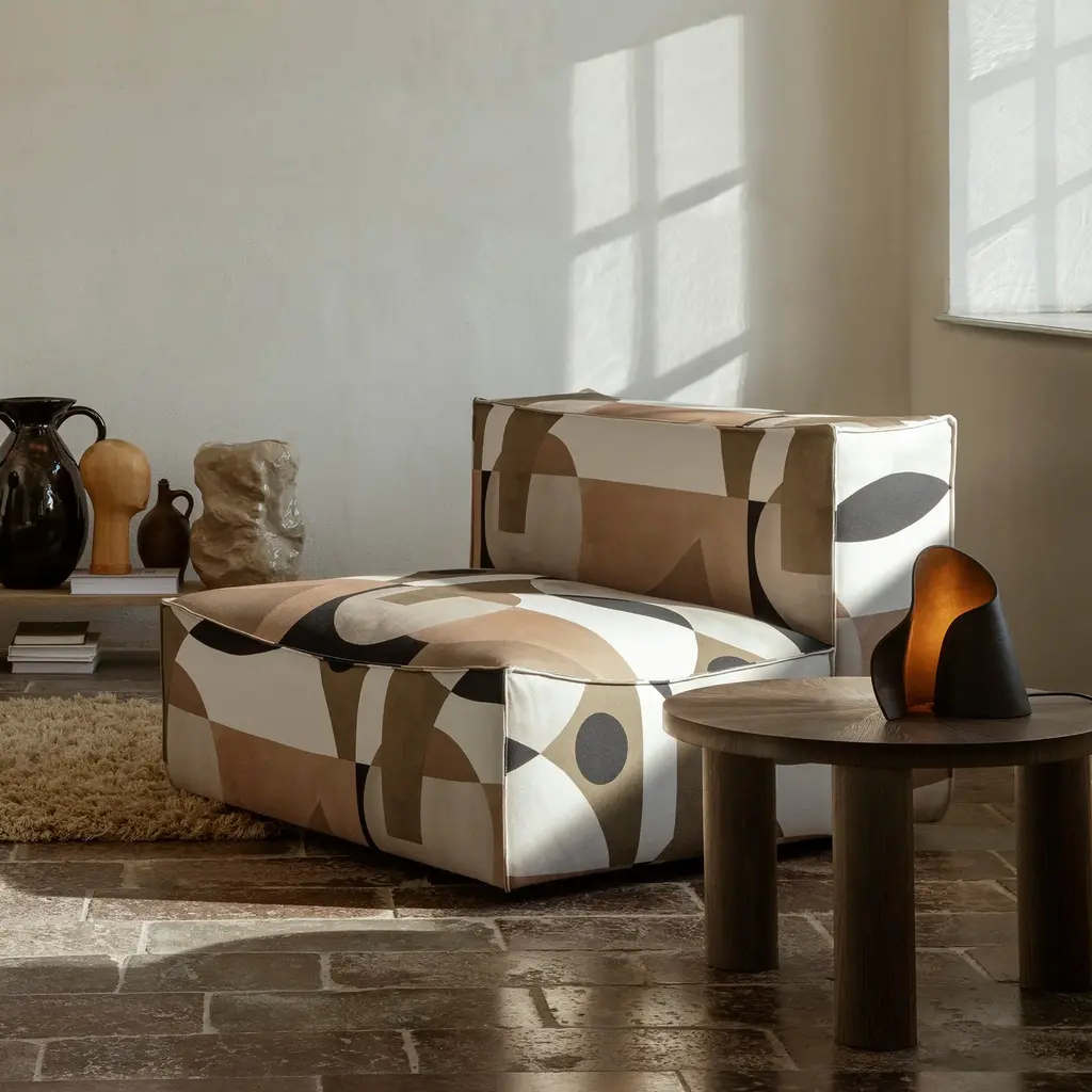 The legacy of Brutalist architecture meets Scandinavian refinement in Ferm Living's solidly proportioned wood coffee table tempered with intricate detailing. Sustainably crafted from FSC-certified timber, Post has three robust cylindrical legs and is embellished with hand-assembled inlaid marquetry. The smaller, higher model features a tabletop with a starburst pattern in spherical sectors while the larger, lower table has striped veneer marquetry legs. Each one is striking on also its own or they can be grouped in an impressive pairing.