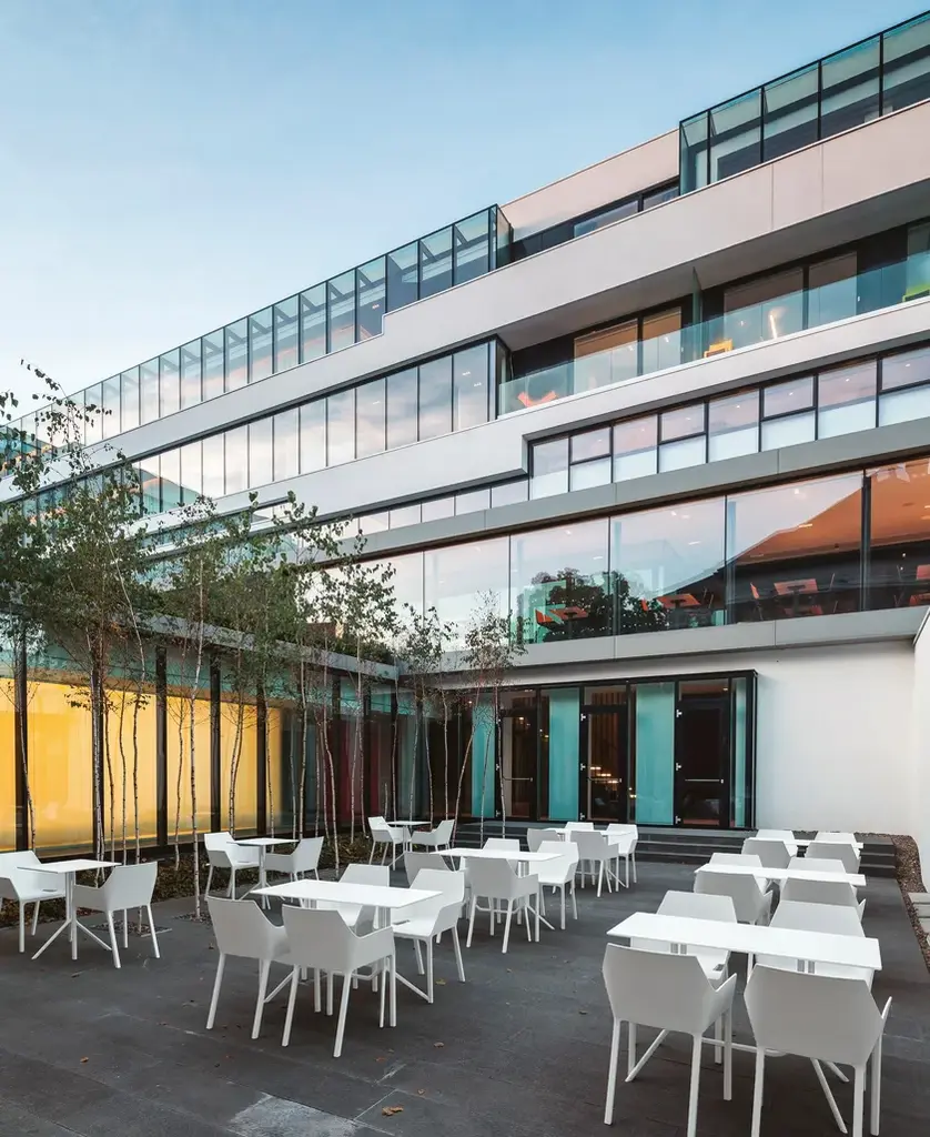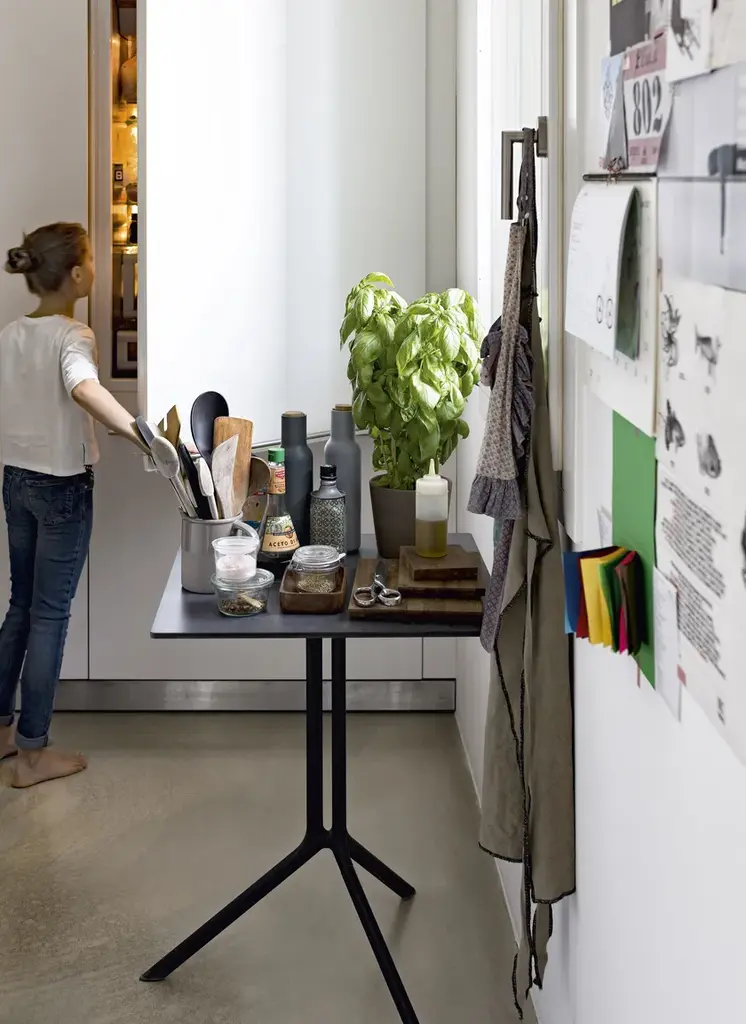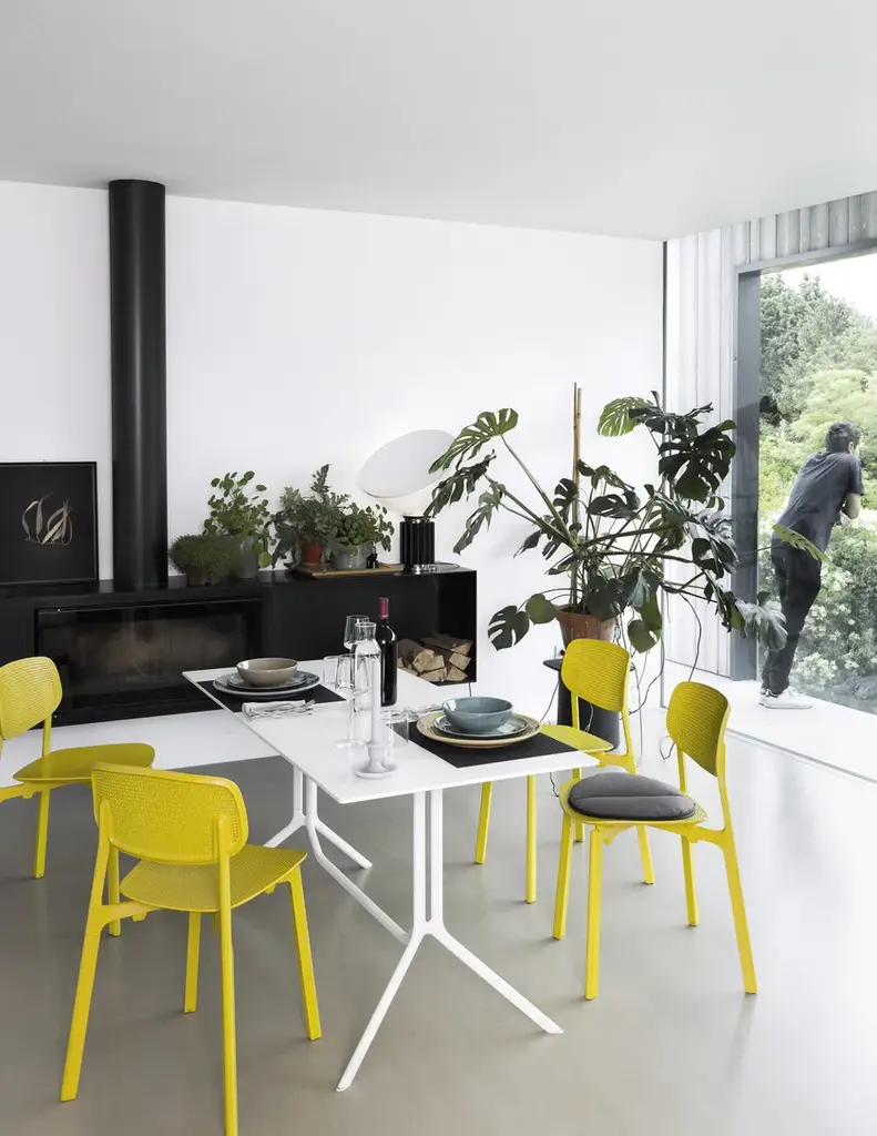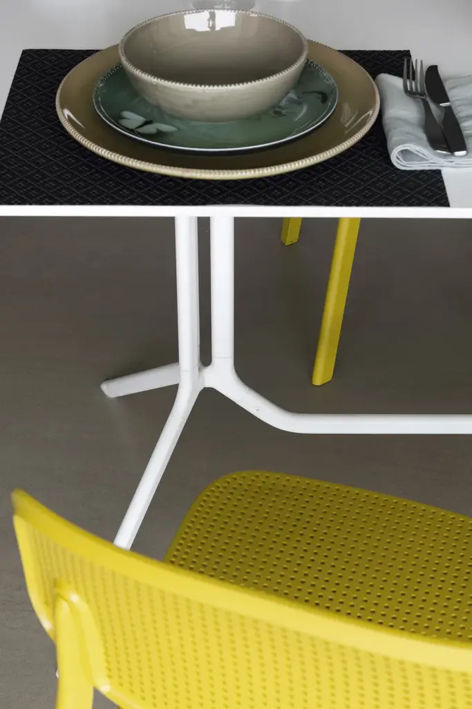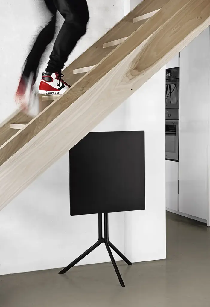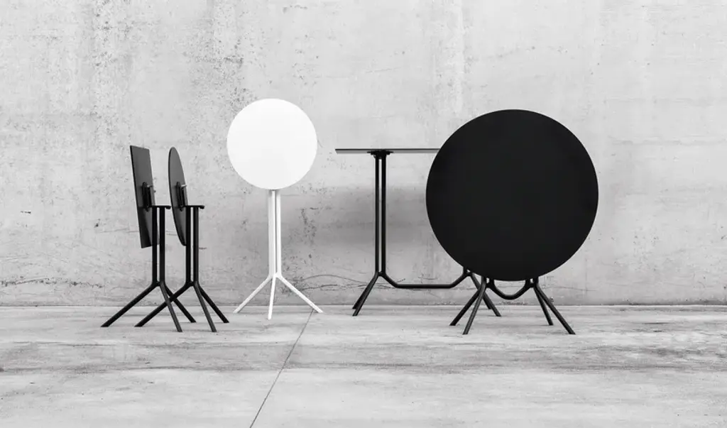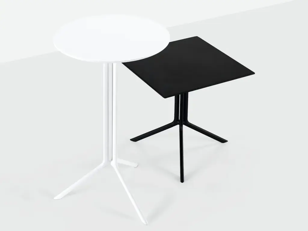 The Poule occasional table has a light and playful appeal, starting with its name inspired by the shape of the pedestal that recalls a hen’s foot. But it is also highly practical: in drawn aluminium with pressure die-cast components in the same resistant material, it has a fold-up top so that it can be stored in limited spaces. Available in two heights, it has an aluminium frame with a black or white epoxy lacquer finish for outdoor use, and a round or square laminate top.