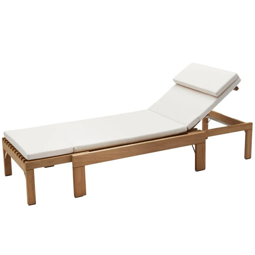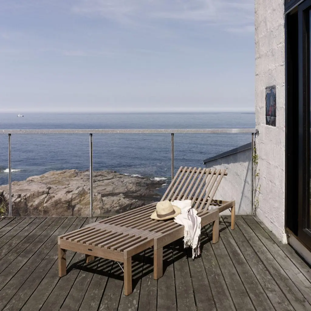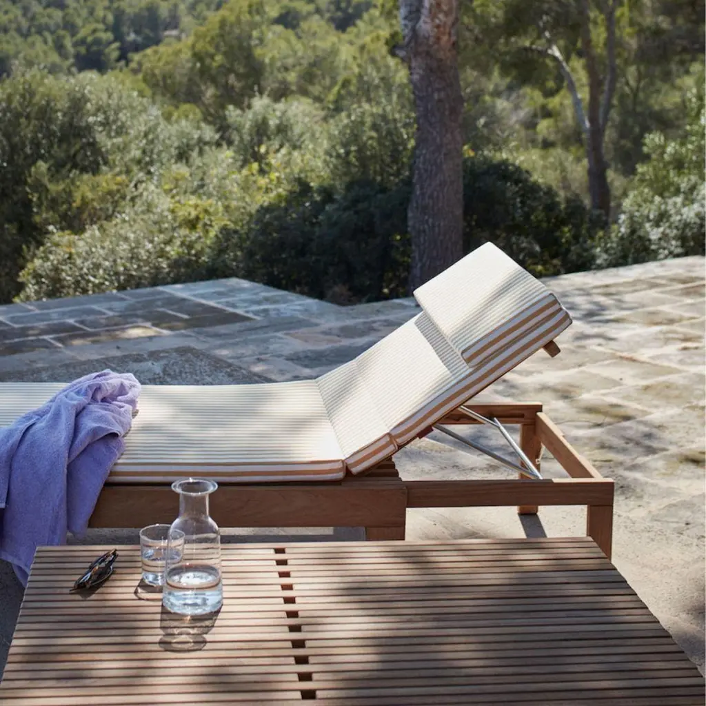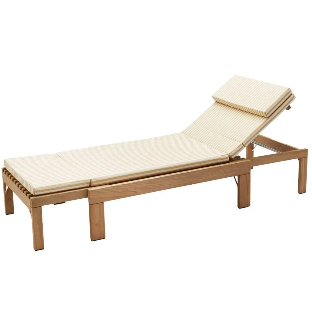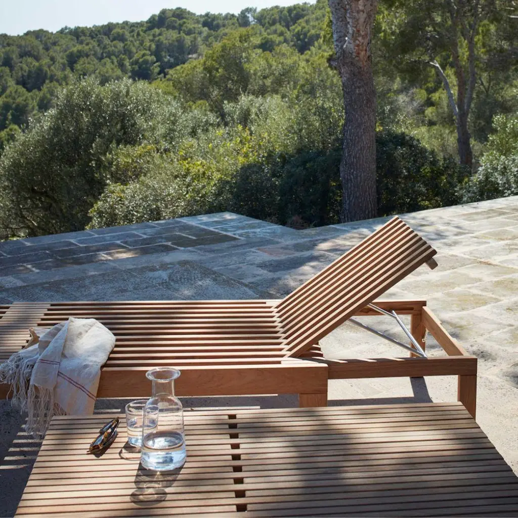 Povl B. Eskildsen outdoor 'Riviera' sunbed in teak for SkagerakSkagerak was founded in 1976 by Jesper and Vibeke Panduro, who took inspiration from their love of Scandinavian design and its rich tradition. The brand emphasizes sustainability by using responsibly sourced materials and production methods that minimize waste and reduce environmental impact. Each piece of handcrafted furniture is designed to age with grace and last for generations.The 'Riviera' has it all. It is a sunbed, a bench, a coffee table and a guest bed. This versatile design has become an outdoor classic, appreciated for its flexibility and straightforward appearance. The slatted teak construction is adjustable in length and can easily be supplemented by a comfortable cushion (available separately). Executed in FSC Certified teak to the exacting standards of Skagerak.Price per item. Available to order in unlimited quantities. Cushions (not included) are available separately in choice of white, papyrus, ash, charcoal, marine, blue stripes and yellow stripes. Please inquire.In stock lead time 2-3 weeks. Out of stock lead time can be an additional 3-4 weeks, or longer. Lead times and stock availability are subject to change at any time and without notice. Please inquire for current lead times prior to placing time sensitive orders.Made to order.All sales final.
