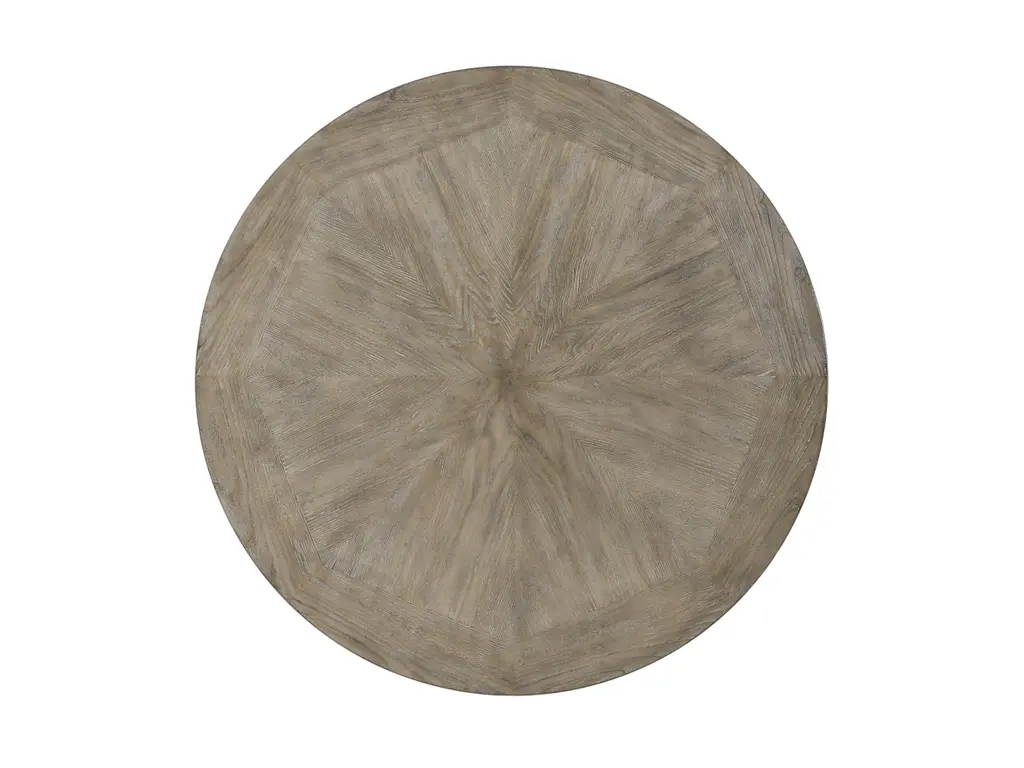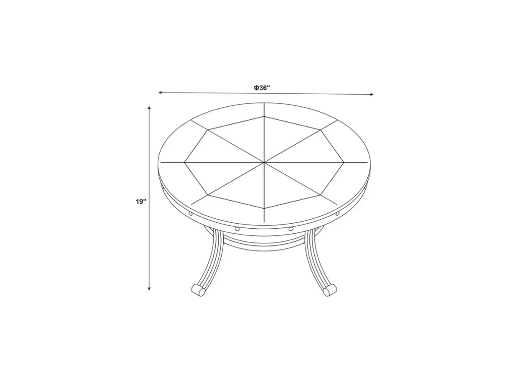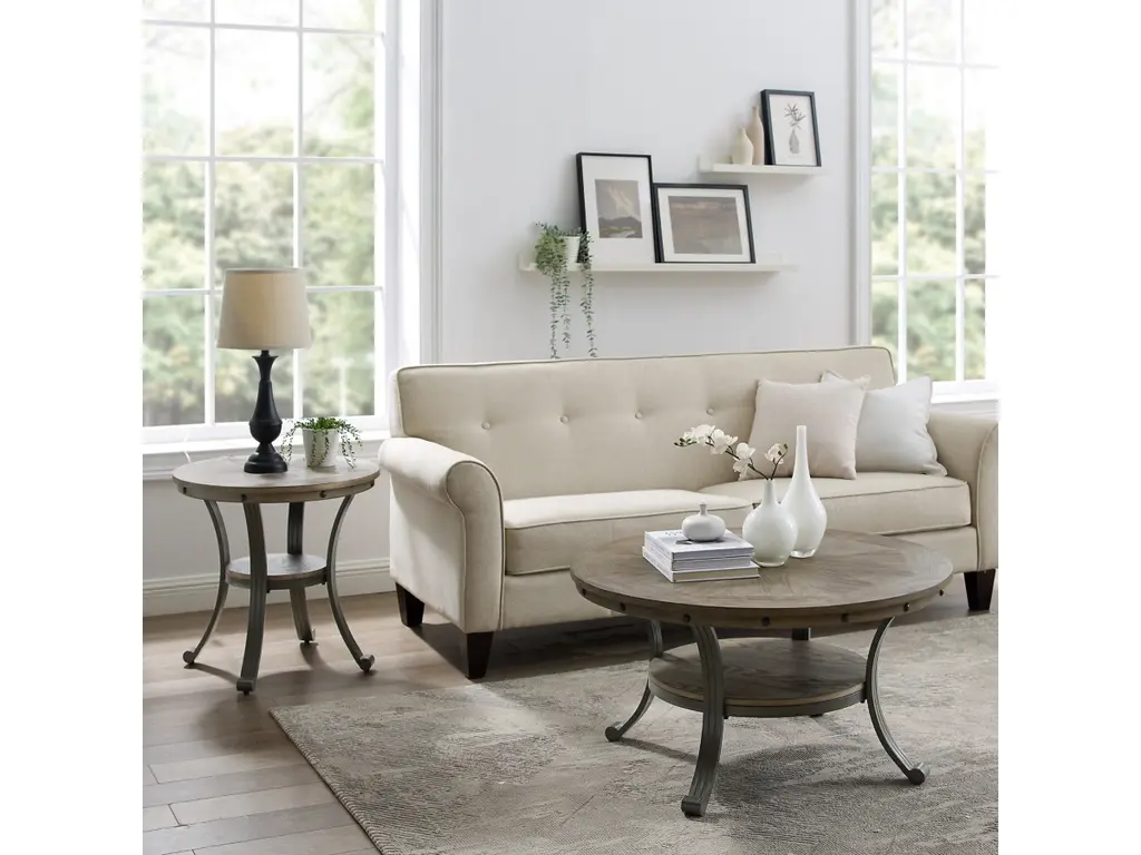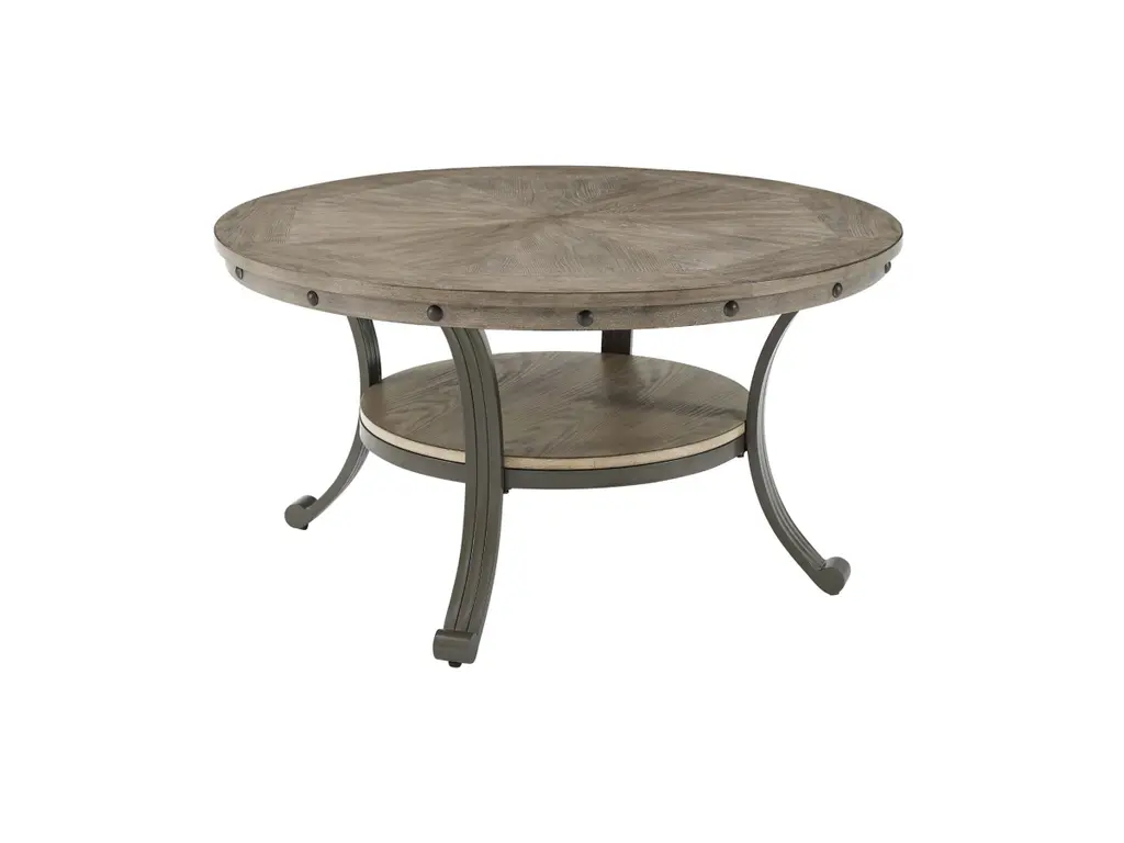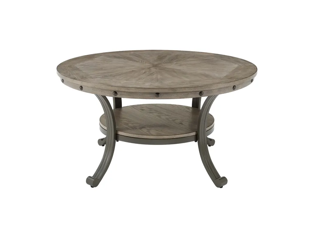 Mixing metal and wood in an updated industrial style provides a unique addition to your home. The round coffee table features an inlay patterned top in ash veneer in a gray finish. Large nail heads adorn the apron. The sturdy metal base is made of curved legs finished in a pewter finish and includes a small circular shelf below. Sturdy enough to take on the busiest of family rooms and sophisticated enough to anchor a formal sitting area.