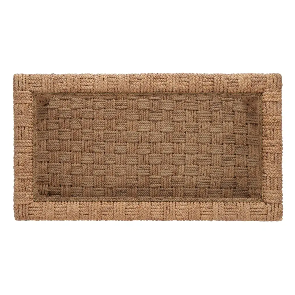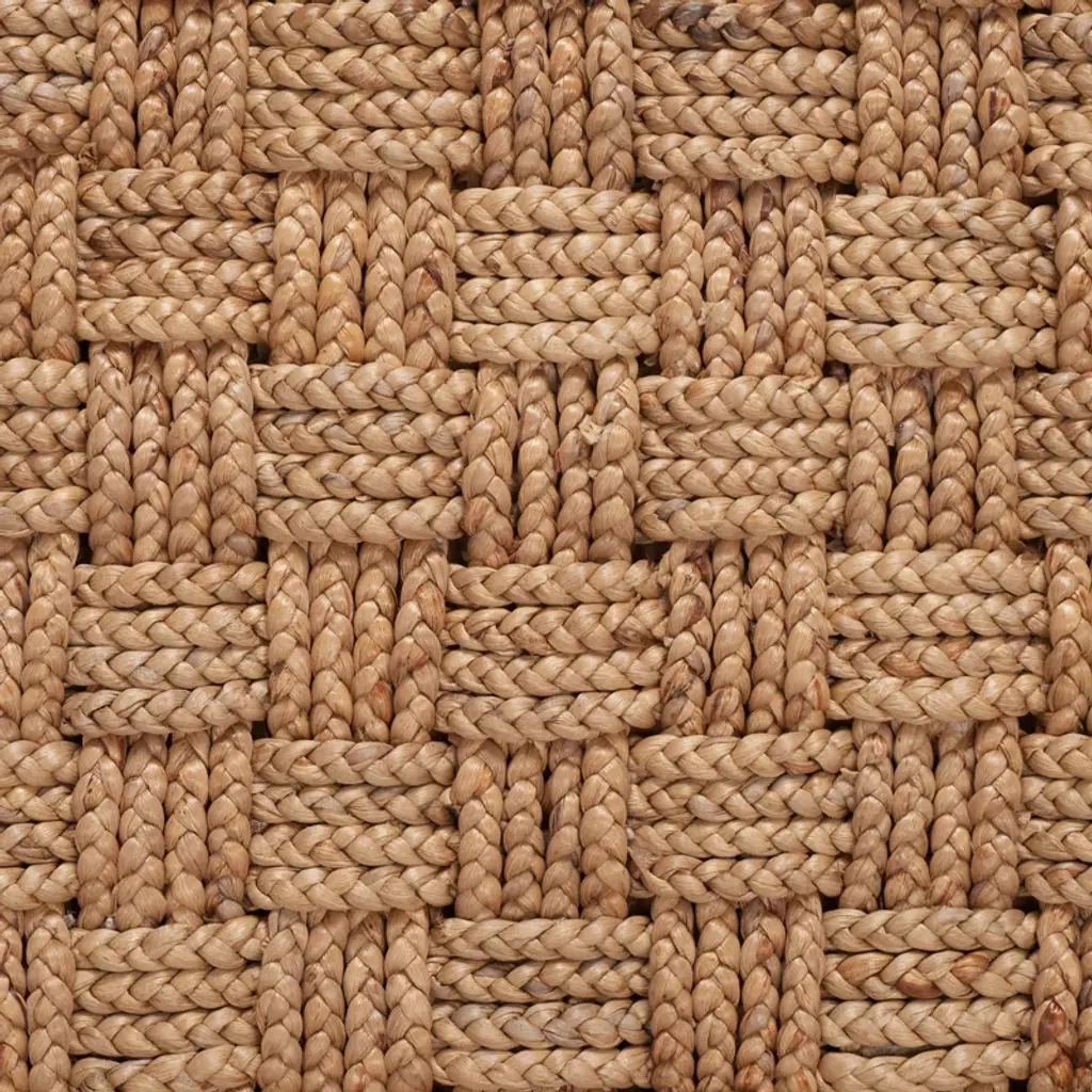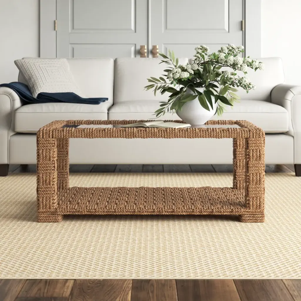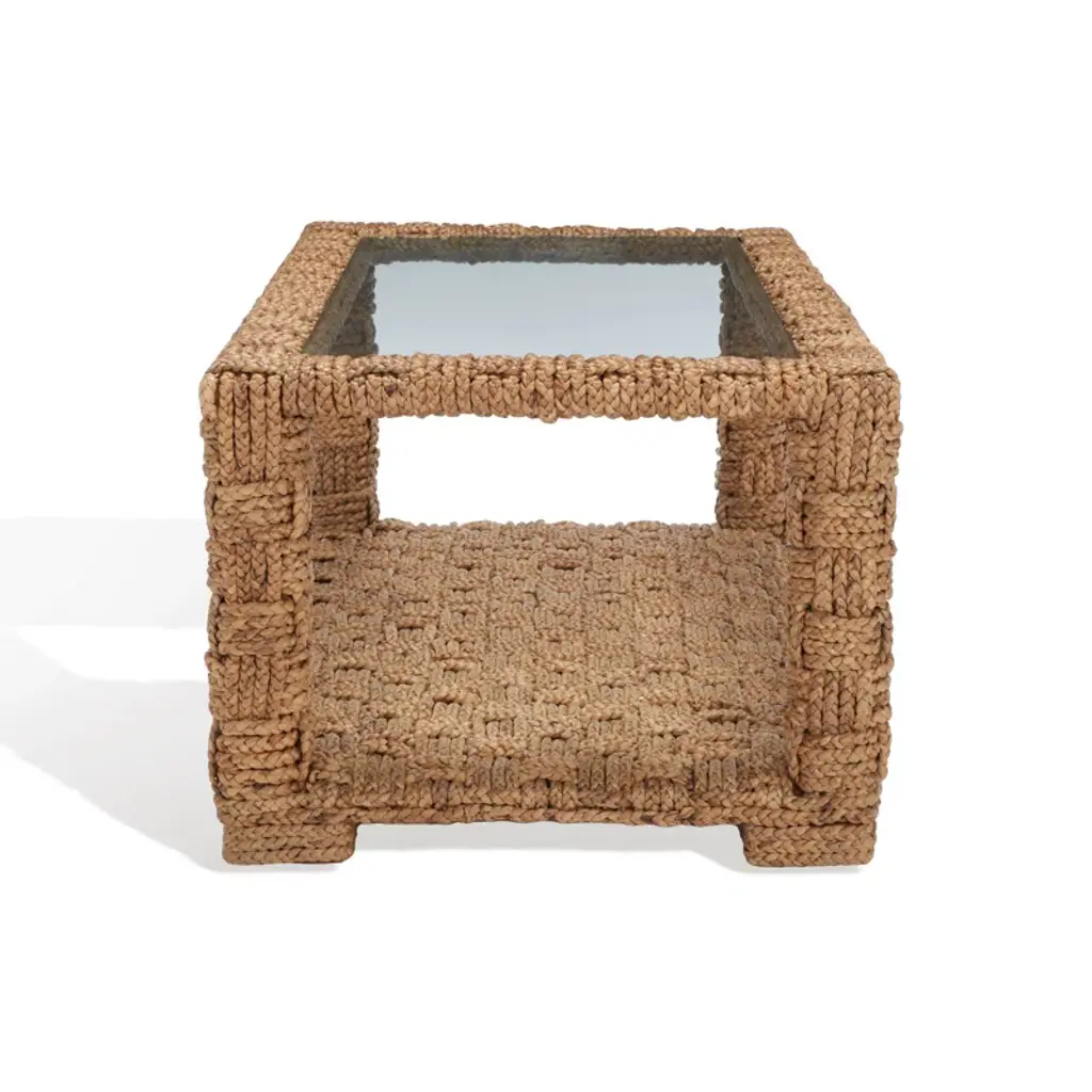 Coastal chic gets a couture upgrade in this captivating Pretoria coffee table. Braided water hyacinth rope in a natural honey finish wrapped around a wood frame in an intricate basket-weave pattern provides unmatched visual intrigue and tantalizing textural appeal, while a clear glass top lightens the look.
