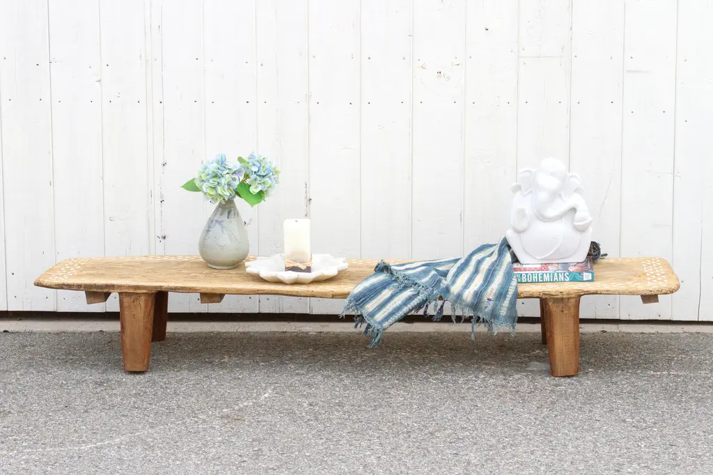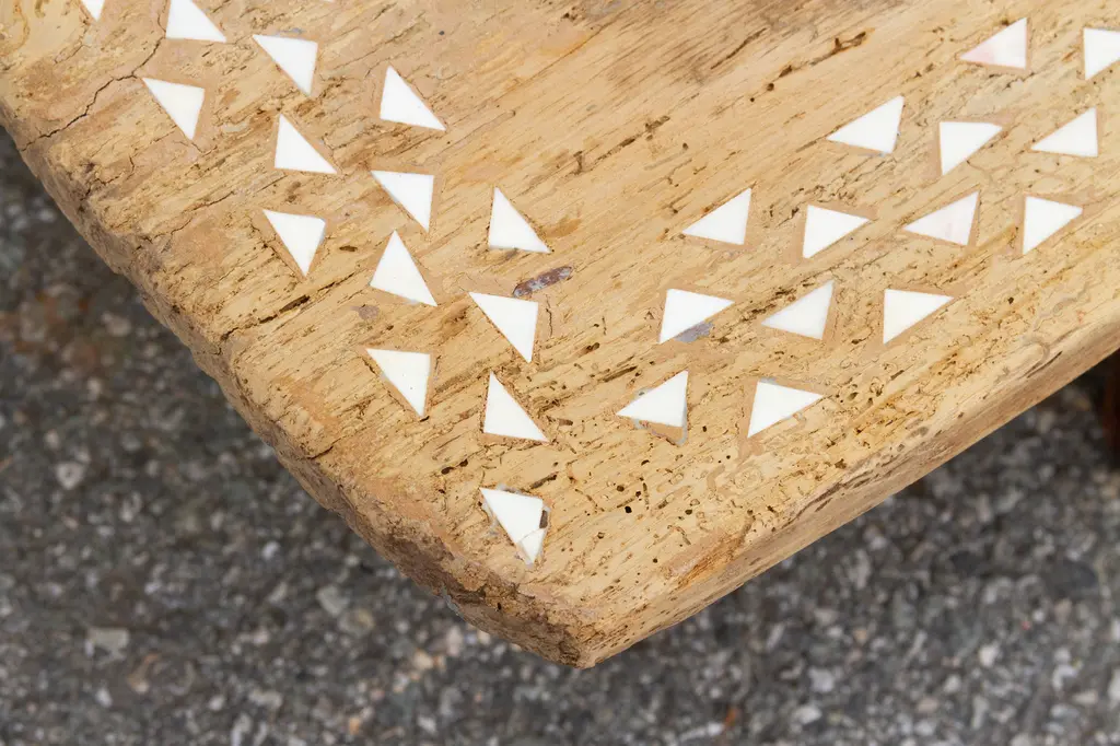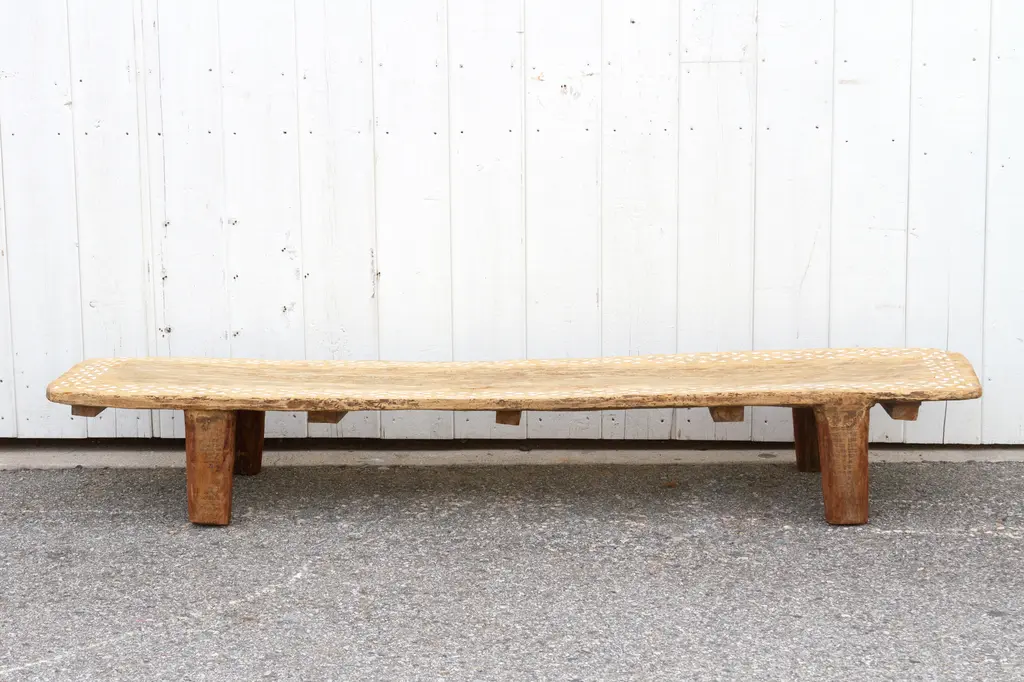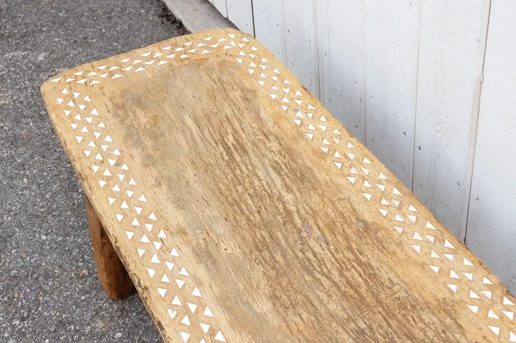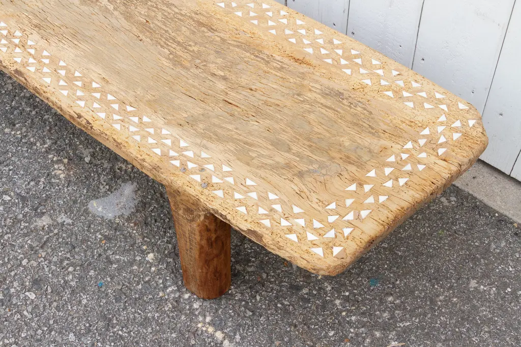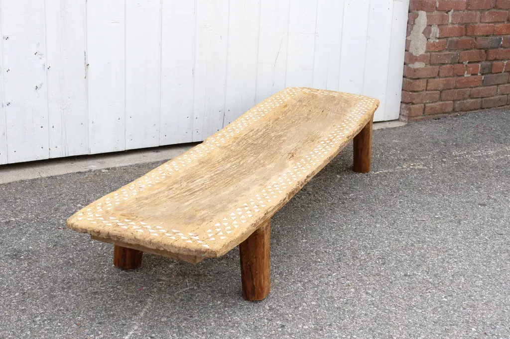 A one-of-a-kind table carved from a single log of wood, a unique feature from the Naga tribe in Nagaland. This antique tribal piece was originally used as a bed but it can work perfectly as a low coffee table or bench. This antique Naga bed has primitive bracket legs and feature a lovely mother of pearl inlay border all around its surface. This coffee table shows normal wear and has an unsealed aged finish.