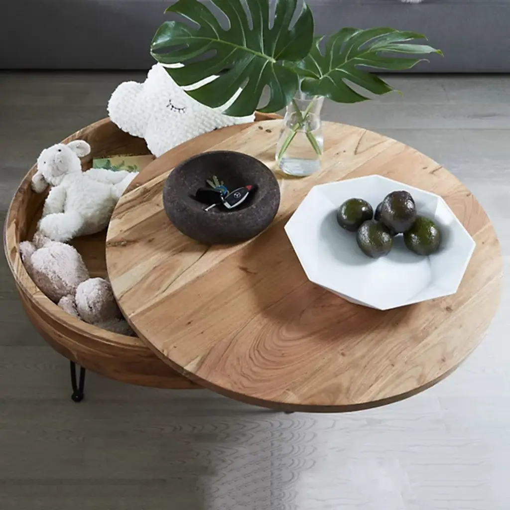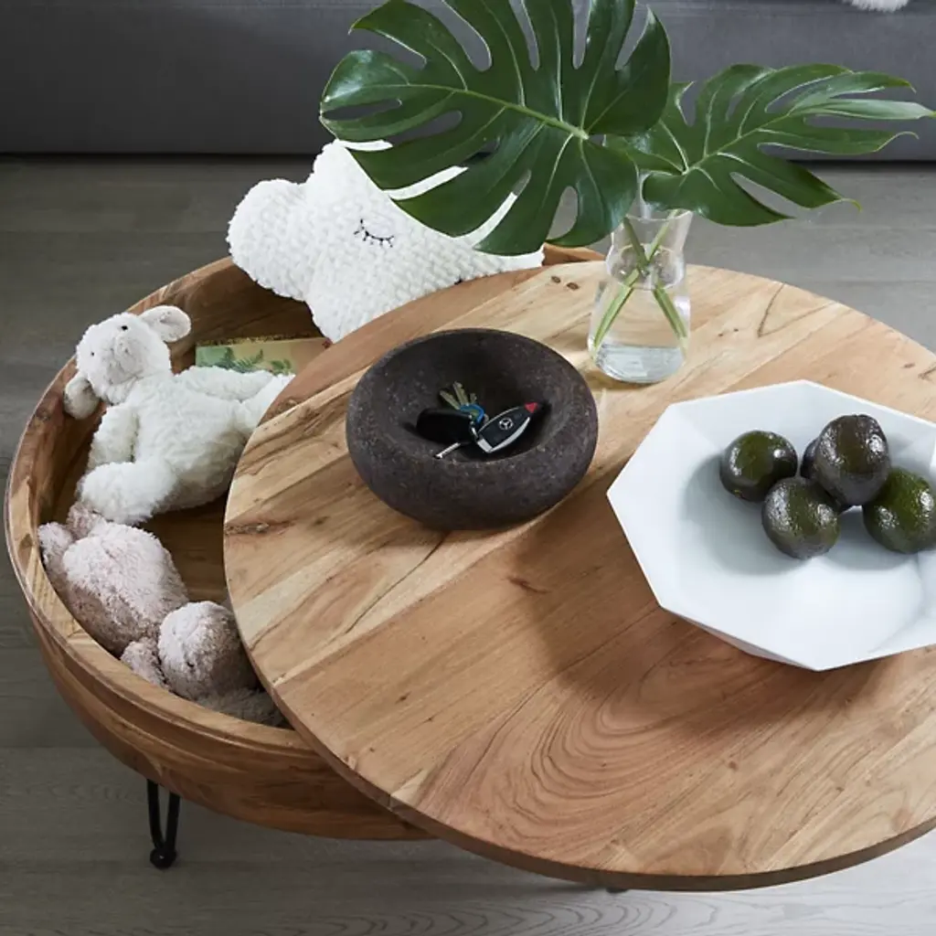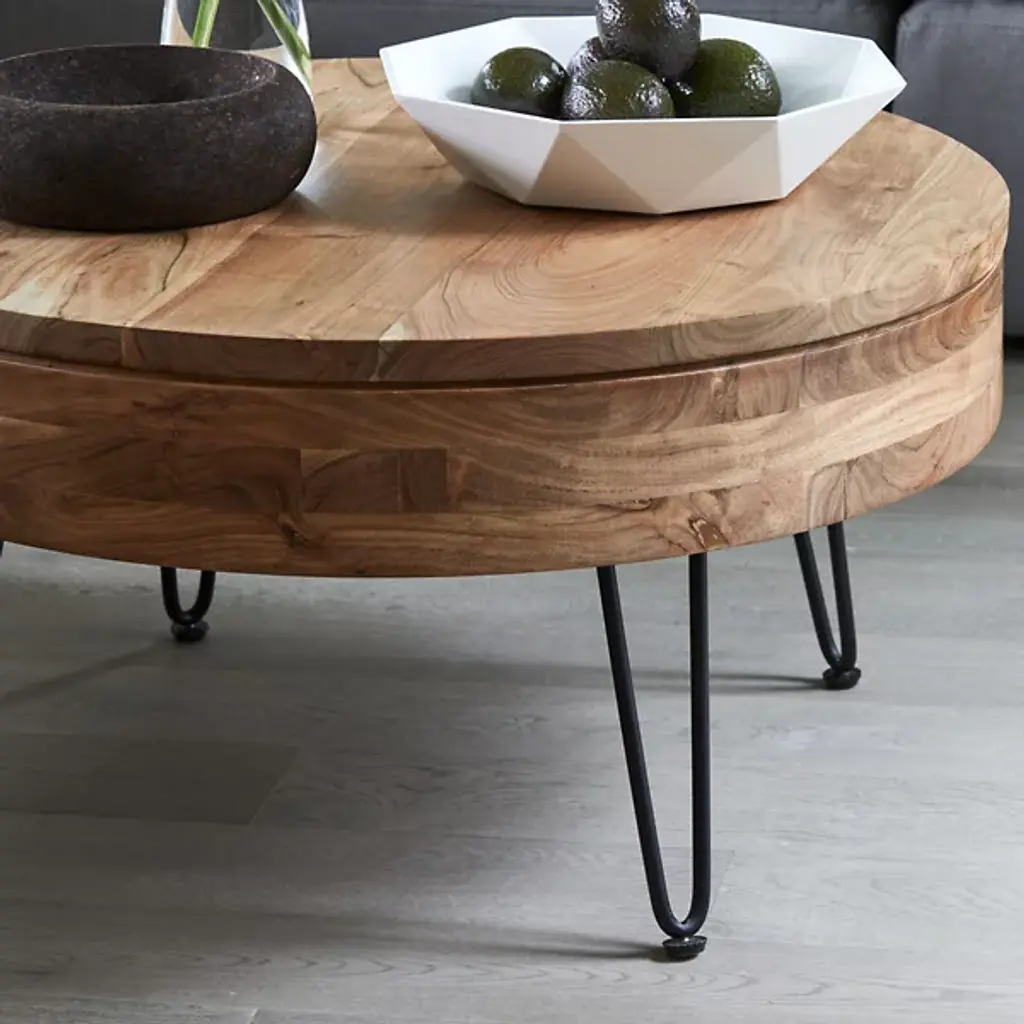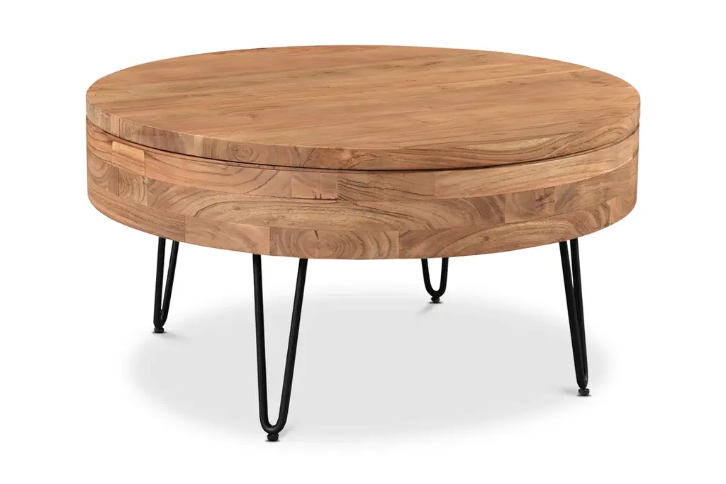 Bring a pleasing natural presence to inside living spaces with the stylish swoop of the Privado Storage Coffee Table from Moe's Home Collection. An artful fusion of rustic appeal and contemporary simplicity, it uses slender iron legs with small feet to support a circular container with a disc top that pivots outward to reveal storage within. The inner storage is ideal for small accessories, while the top can hold more, the natural grain of solid acacia wood contrasting well with the metal underneath.