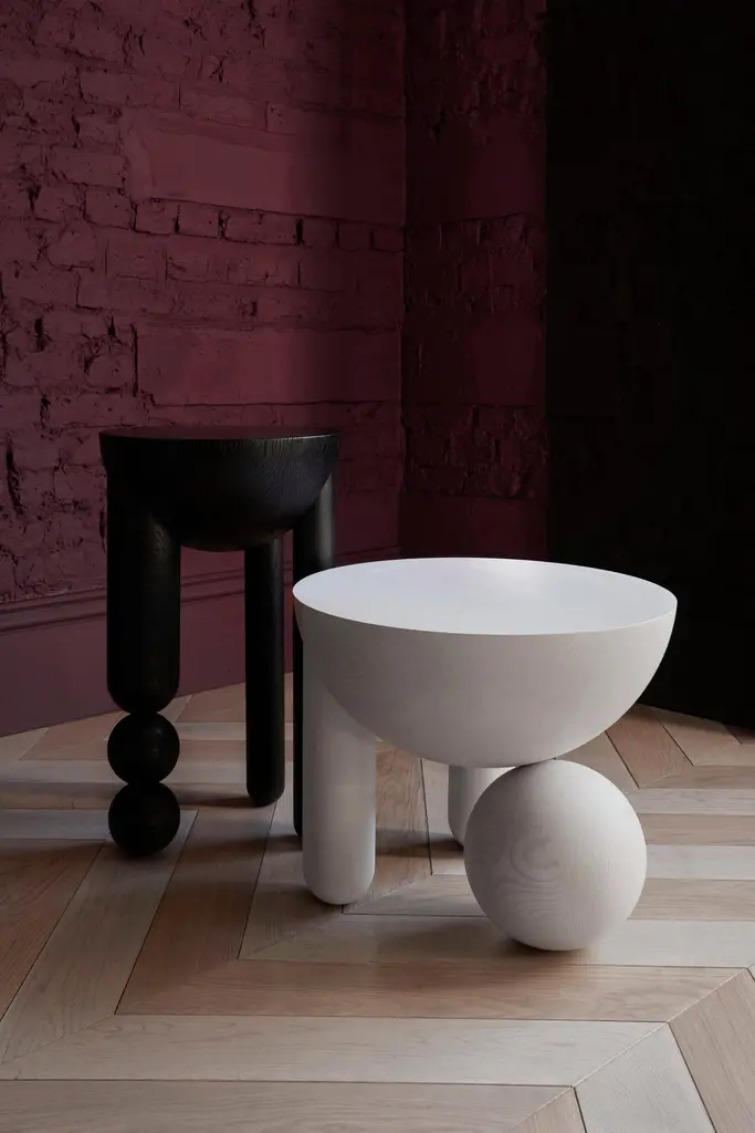 Profiterole small coffee table and Profiterole occasional table are in marble and wood respectively, supported by round dessert-like spheres and semi-cupped legs which support a rounded top. The coffee table comes in nero marquina or white carrara marble. The wood side table is 3D milled and presented in both white, black stained or natural finish ash.