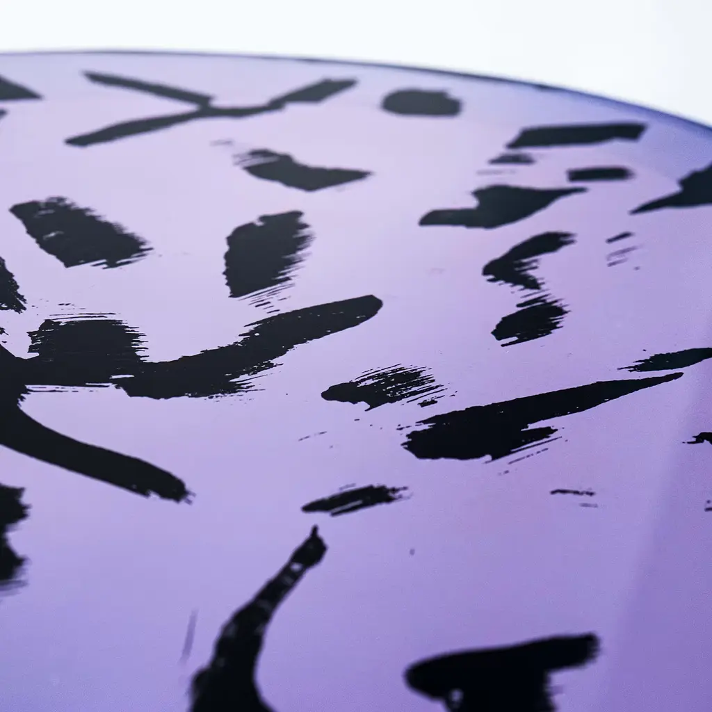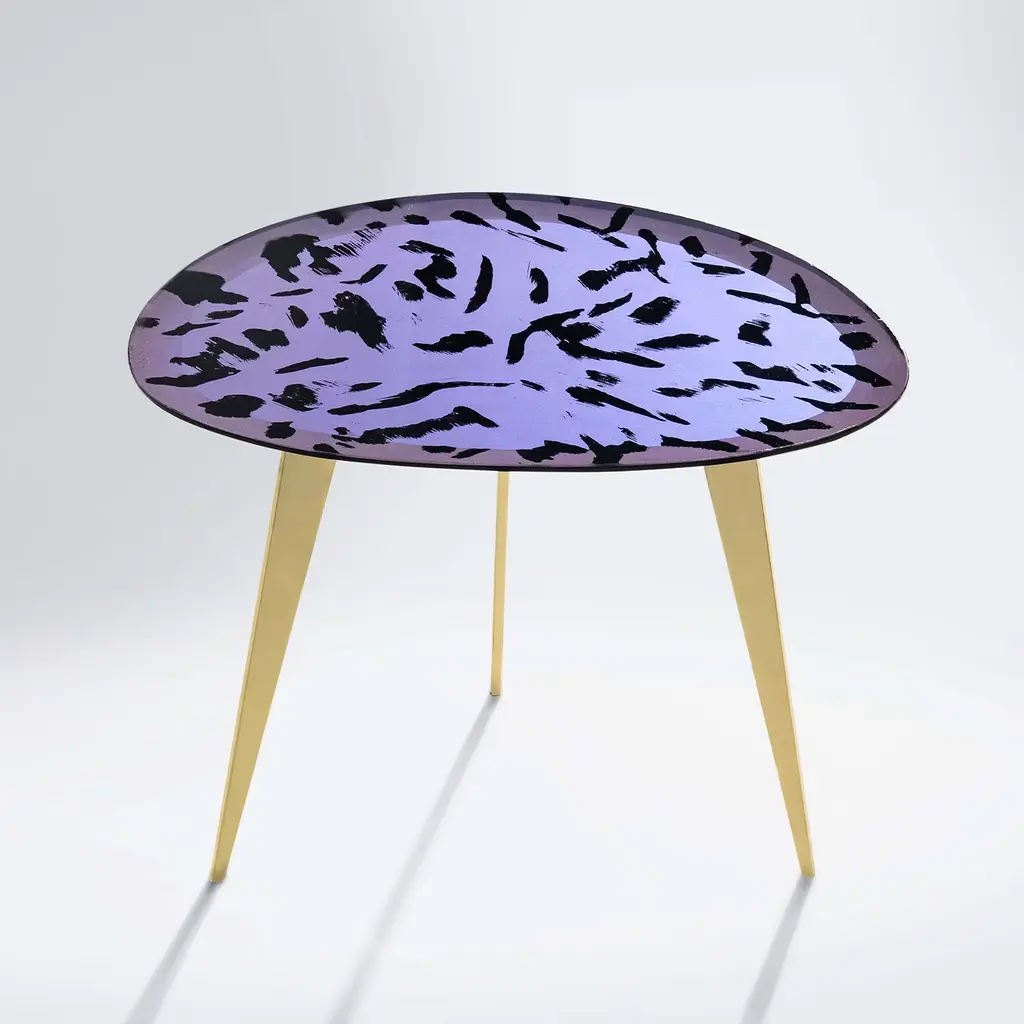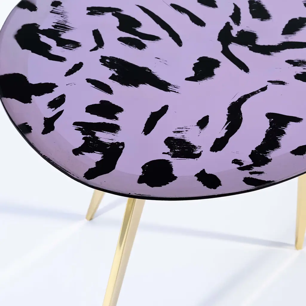 The coffee table Puà is born from instinct, from the artist’s desire to create an eye-catching coffee table, out of the box and extremely contemporary. The entire support structure is made of brass. The underplate is matt black color while the legs have a polished brass finish. The irregular black ‘stains’ engraved by hand at the bottom emerge from the pink finish rich in iridescent blue reflections of the crystal. Every piece is unique and due to handcrafting, slight changes may occur.