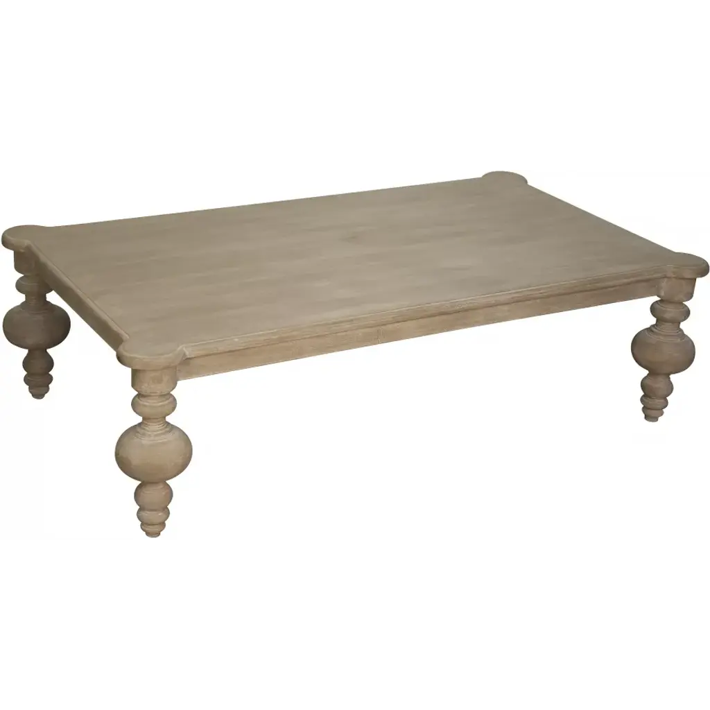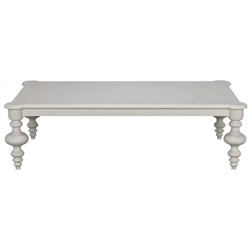 This sophisticatedly symmetrical coffee table features a rectangular mahogany top with rounded embellished corners that mirror its turned spool legs. Hand-carved, it is available in three hand-applied finishes that were each selected to enhance the beauty of the hardwood.