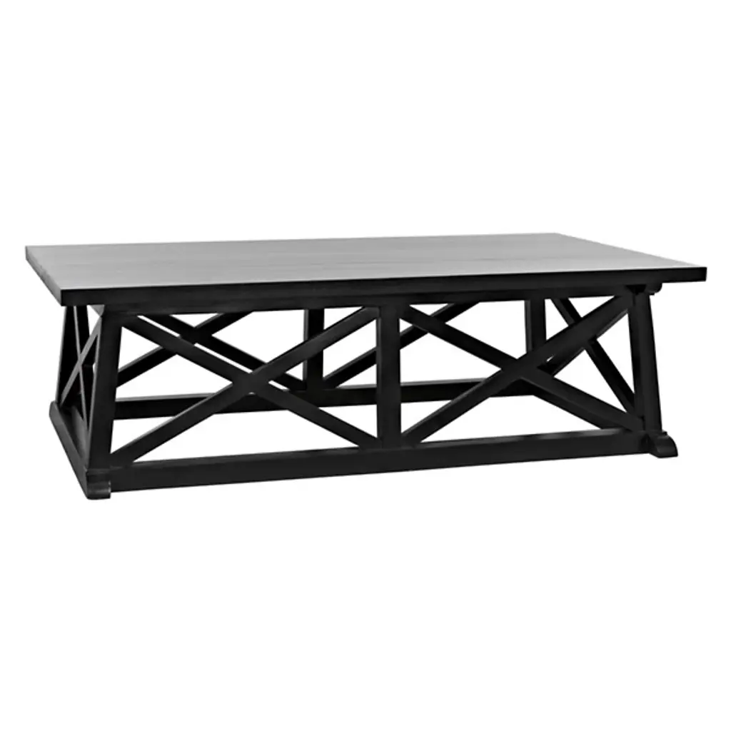 This generously sized coffee table has been hand-carved of solid mahogany enhanced with a hand -rubbed black finish, finish, and features striking carved "X" embellishments on the base.
