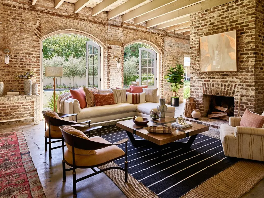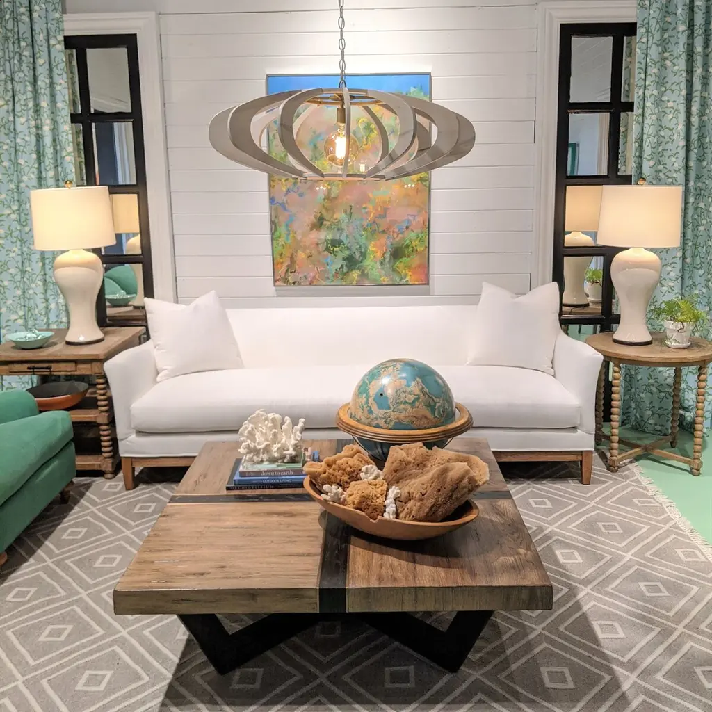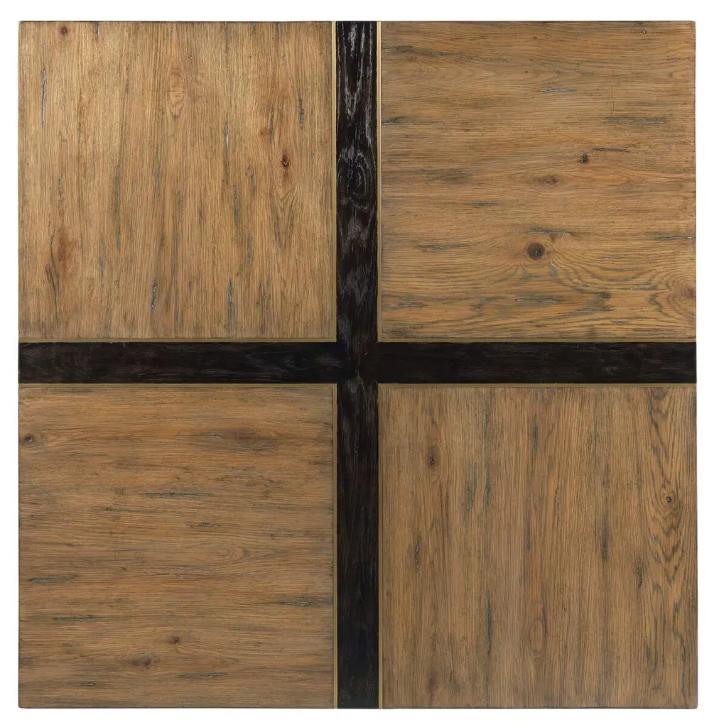 The top of this coffee table consists of four oak squares, their distinctive grain laid in alternating directions, bound with strips of wood in a darker finish; brass inlays differentiate the borders of the pieces. The geometric base brings a bit of Mid-Century Modern flair to the otherwise rustic sensibility.