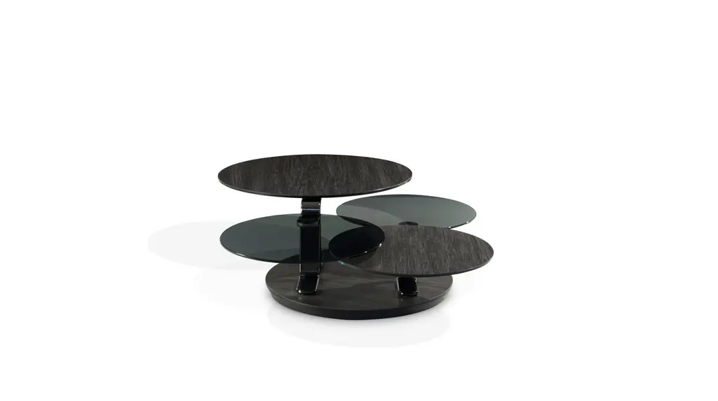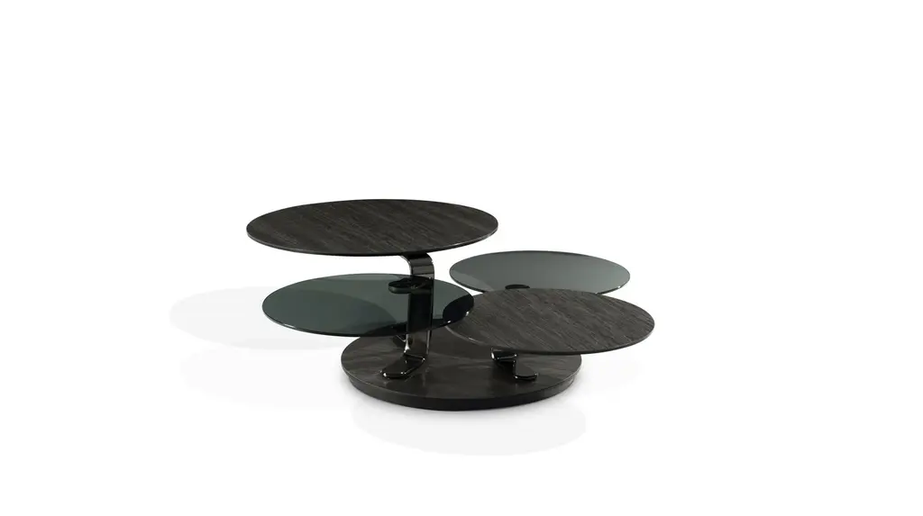 Quartet est une table basse qui swingue ! Dès que l'un est mis en mouvement, ses quatre plateaux ronds dansent simultanément, permettant à son diamètre de passer de 85 à 140 cm selon les besoins. Elle présente 2 plateaux en verre et deux autres en composite céramique sur verre, à choisir parmi un choix nombreux.