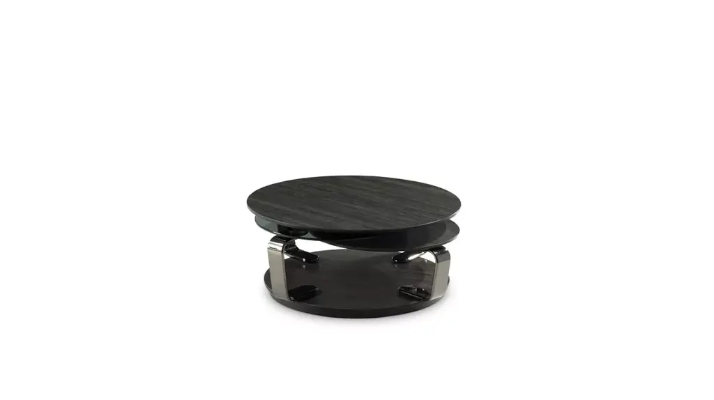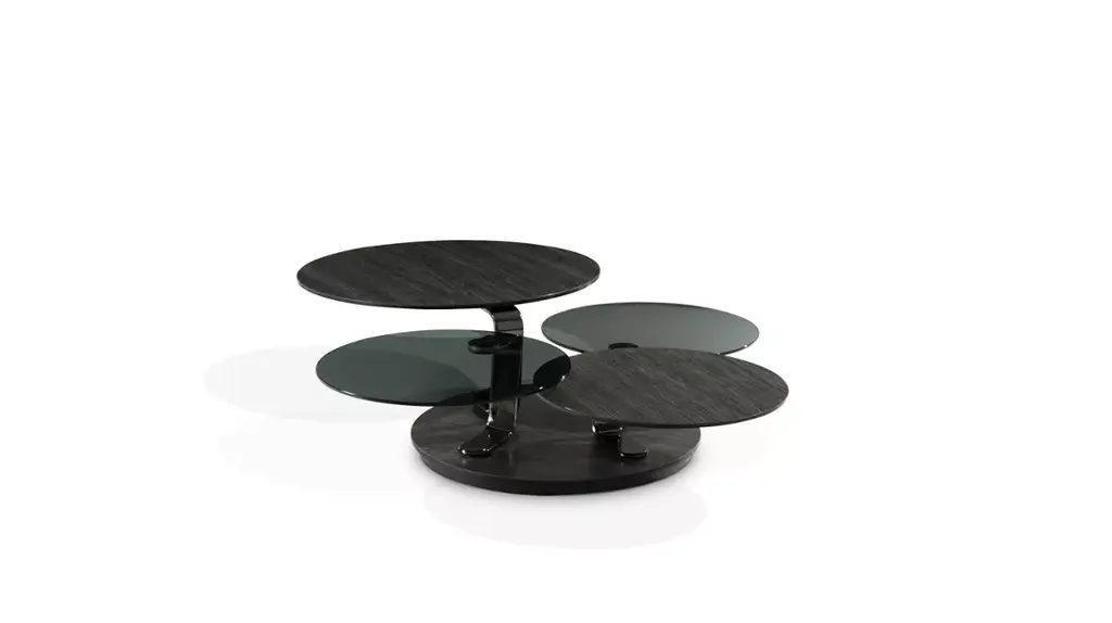 The Quartet cocktail table has got that swing! The moment one top moves, all four tops dance around in unison, increasing the diameter from 85 to 140 cm, as required. Two tops are made of glass, and two of composite ceramic on glass, with a wide range of options.