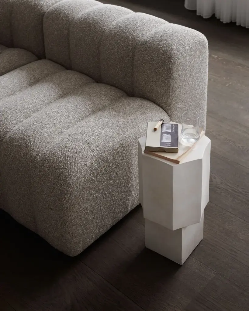 Inspired by the natural crystal shape of the Quartz stone, Quartz changes its appearance when seen from different angles. Quartz is a versatile stone-like object, suitable as a side table, podium or sculpture. Quartz is cast in lightweight fiber concrete with a unique and tactile surface texture, availble in four different colour finishes. Pads for table legs included.