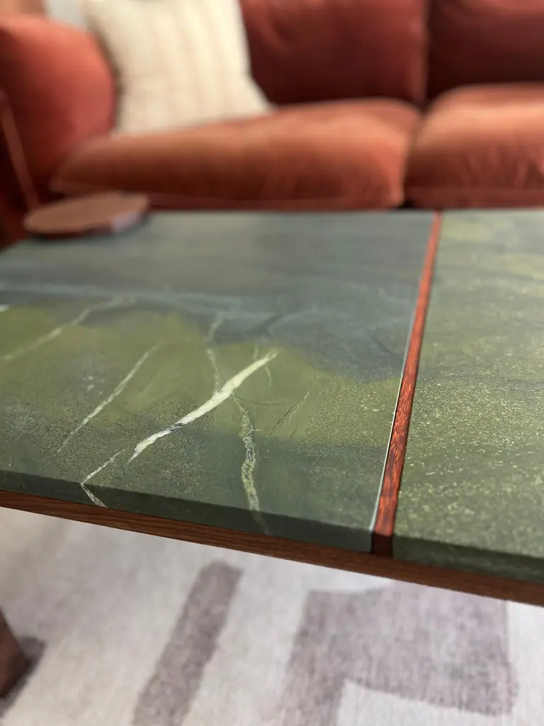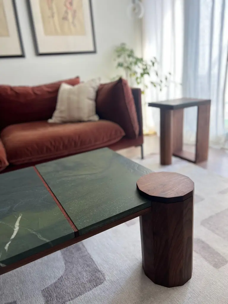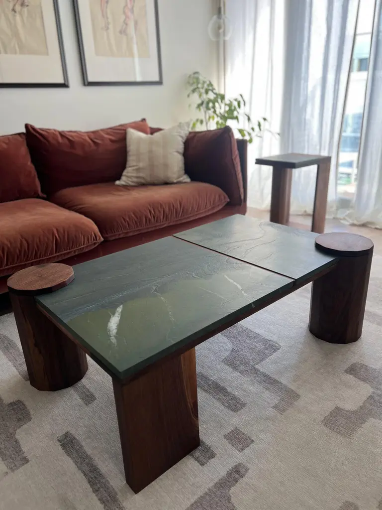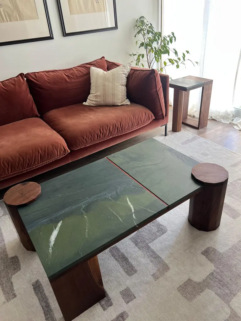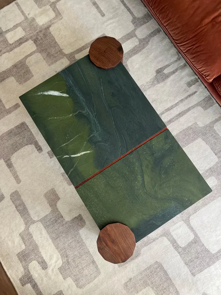 A striking balance of organic materials and architectural form, this handcrafted cocktail table by Redline Design Collective showcases the rich interplay of solid walnut and Avocatus quartzite. The deep, earthy green hues of the stone are streaked with dramatic veins of white, while the warmth of the walnut base provides a grounding contrast.A signature redline of padauk slices through the continuous quartzite surface, drawing the eye along the seamless grain of the stone while subtly marking the transition between the two slabs. The sculptural column legs—cylindrical at one end, flat at the other—anchor the piece with a bold yet refined stance, adding a sense of movement and asymmetry. The integrated oversized coasters, magnetically attached to the columns, introduce a functional and tactile element that seamlessly blends into the table’s geometric composition.Designed for those who appreciate the fusion of nature and craftsmanship, this piece transforms any space with its raw elegance and commanding presence.