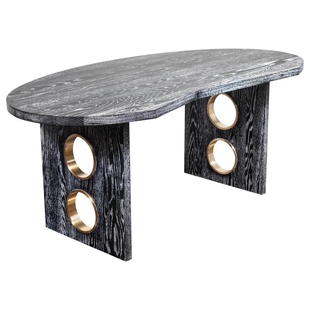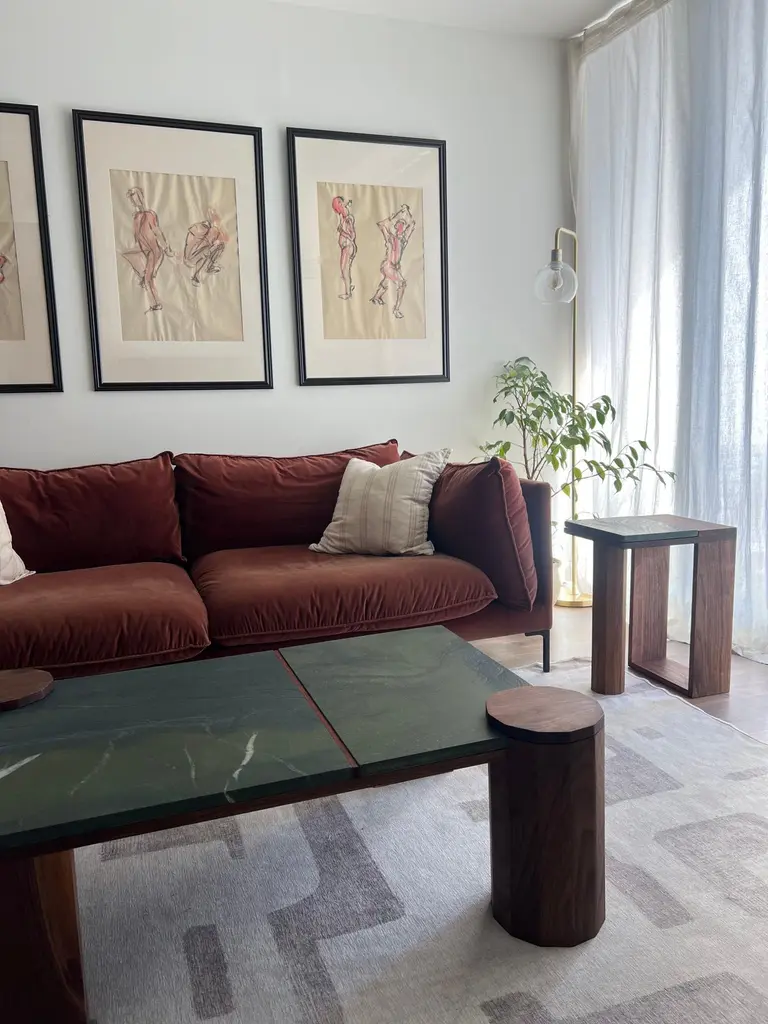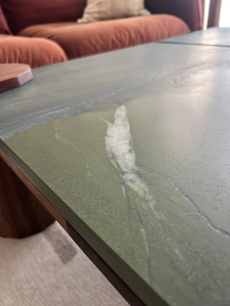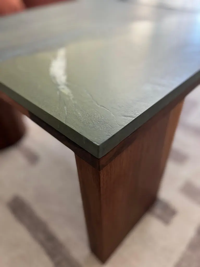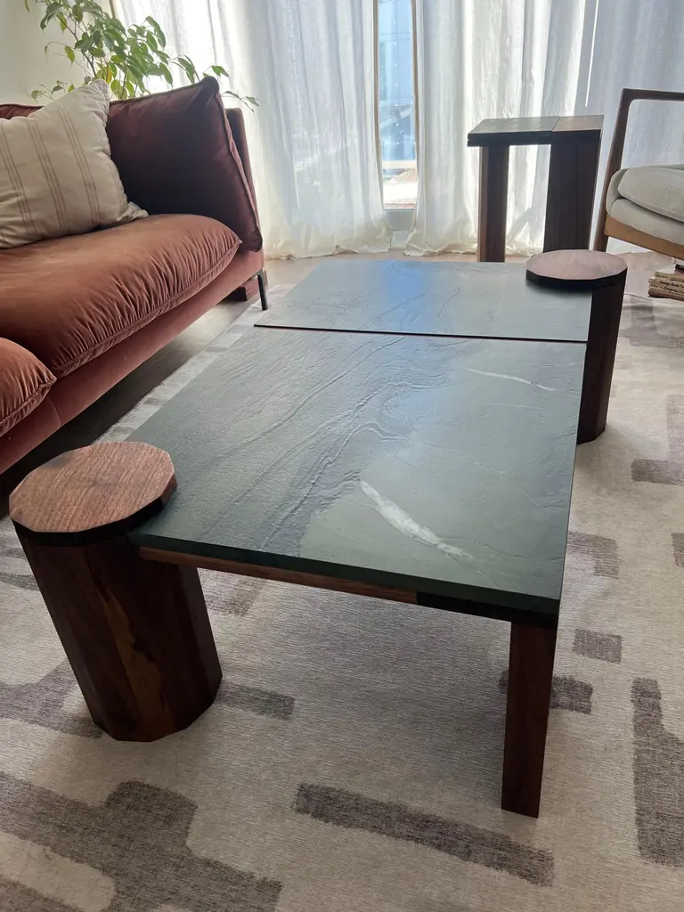A striking balance of organic materials and architectural form, this handcrafted cocktail table by Redline Design Collective showcases the rich interplay of solid walnut and Avocatus quartzite. The deep, earthy green hues of the stone are streaked with dramatic veins of white, while the warmth of the walnut base provides a grounding contrast.A signature redline of padauk slices through the continuous quartzite surface, drawing the eye along the seamless grain of the stone while subtly marking the transition between the two slabs. The sculptural column legs—cylindrical at one end, flat at the other—anchor the piece with a bold yet refined stance, adding a sense of movement and asymmetry. The integrated oversized coasters, magnetically attached to the columns, introduce a functional and tactile element that seamlessly blends into the table’s geometric composition.Designed for those who appreciate the fusion of nature and craftsmanship, this piece transforms any space with its raw elegance and commanding presence.