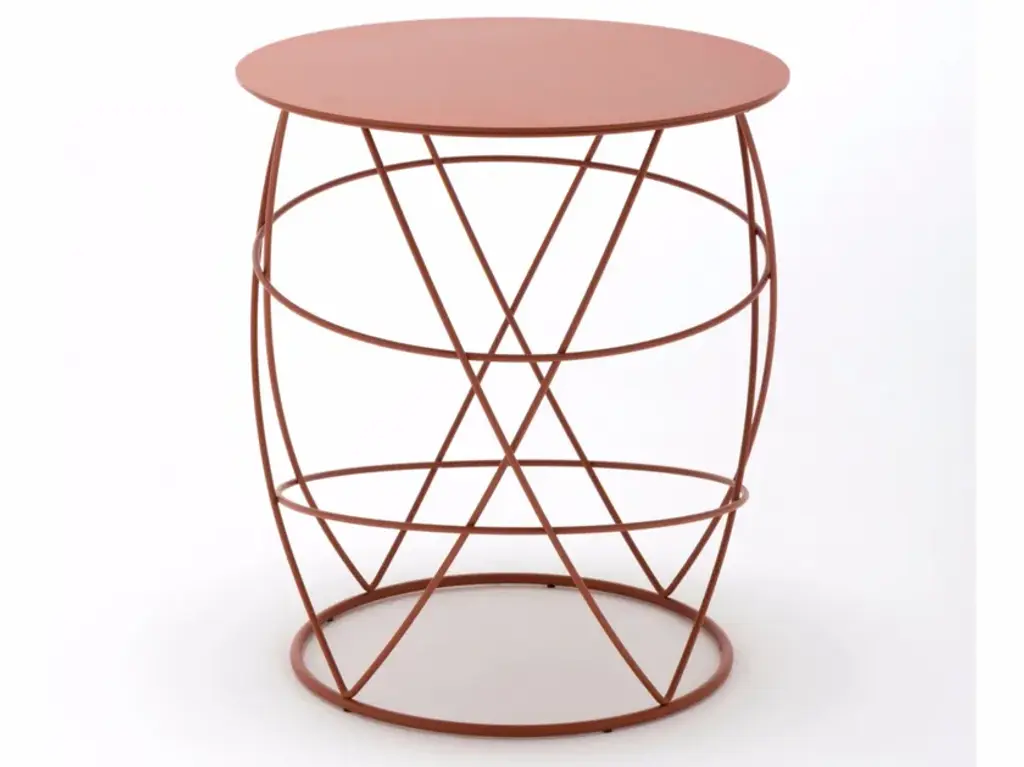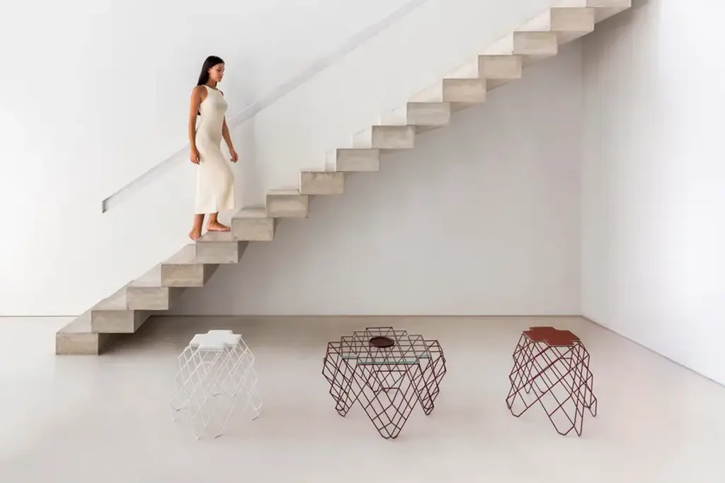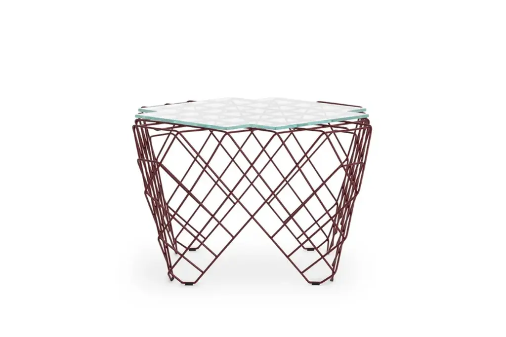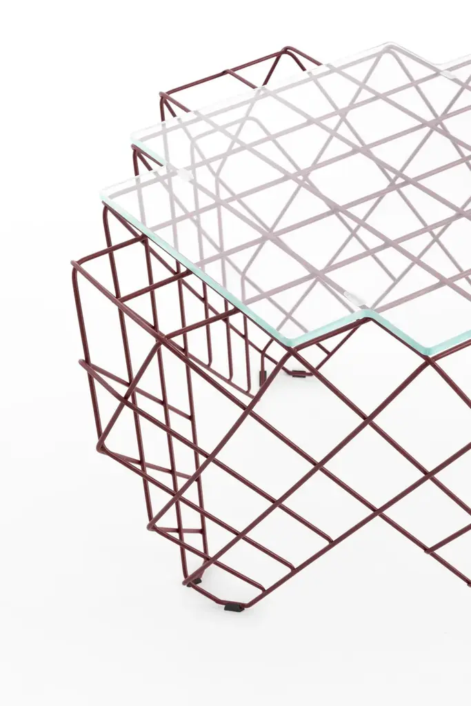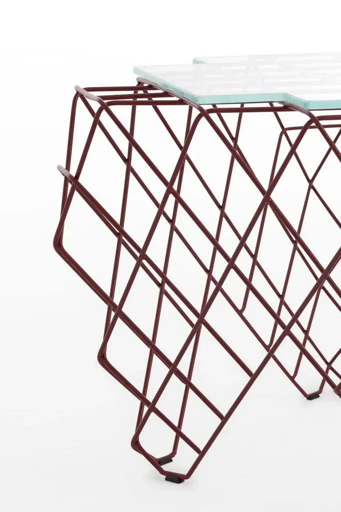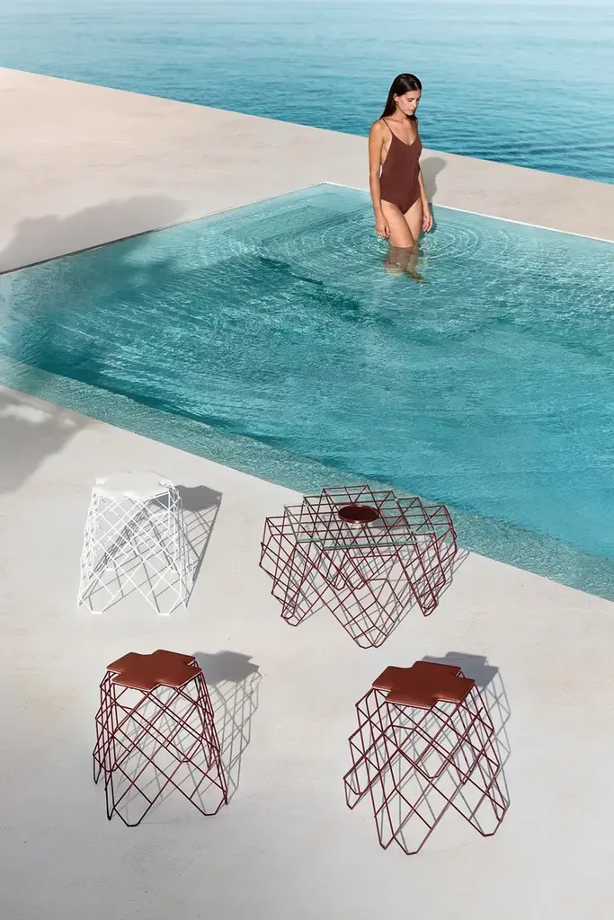 R24 is a powder coated steel coffee table with clear glass top.Colors: White, Agate grey, Sand, Gold, Bronze, Wine red, Blue grey, Grey blue, Night blue, Cement grey, Bottle green, Quartz grey, Anthracite, Black.R24 is a collection designed by Argentinian architect Paula Valentini, created in the course of an exchange with the Museum of Contemporary Art of Buenos Aires and its collection of geometric abstraction. These pieces, which are now included in the Gandiablasco outdoor furniture catalogue with only two elements, respond to the challenge of creating low stools and side tables that are as light as they are resistant. R24 contributes with its versatility to create spaces to enjoy the outdoor environment accompanying from the subtlety of its fabric in a single material. R24 designs are handcrafted in India. Using 5 mm diameter stainless steel rods bent, intertwined and arranged, in a structured pattern, a weave is used to create a firm structure into a continuous skin. The innovation of R24 lies in its ethereal support, achieved by dematerializing edges and substructures and avoiding the bracing rings to achieve continuity. The result is pieces that generate degrees of opacity and, in the particular case of the stools, emulate a kaleidoscopic and sculptural image when stacked. As far as finishes are concerned, the R24 elements can be thermo-lacquered in all the standard tones of the Gandiablasco colour chart. On the one hand, the stool functions as a support commodity and is available with or without an upholstered cushion -also handmade in India-, composed of a base of Gravidry® filtering polyurethane foam and a layer of wadding on the surface, so as to achieve a tactile and comfortable feel when sitting while at the same time obtaining breathability and quick-drying properties without the need to remove the covers. On the other hand, the side table comes from the expansion of the support surface and the consequent inversion of the geometric volume of the original stool. This element has an extra-clear tempered glass top that is attached to the structure by means of Velcro. Valentini's vision of design fuses her training as an architect and an extensive background in fields such as art and urban planning. In R24 she investigates the possibility of constructing a textile architecture on a sall scale.