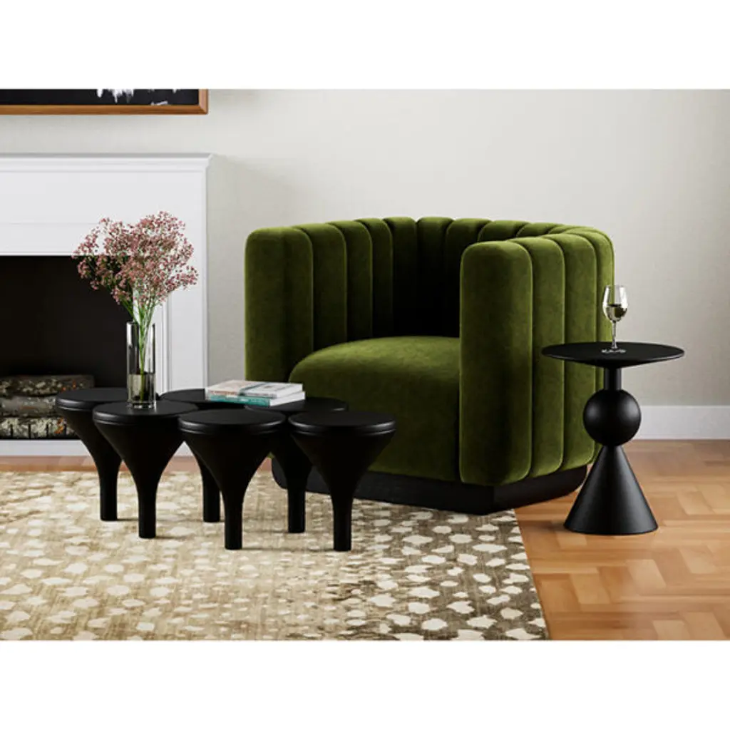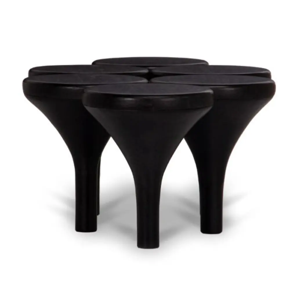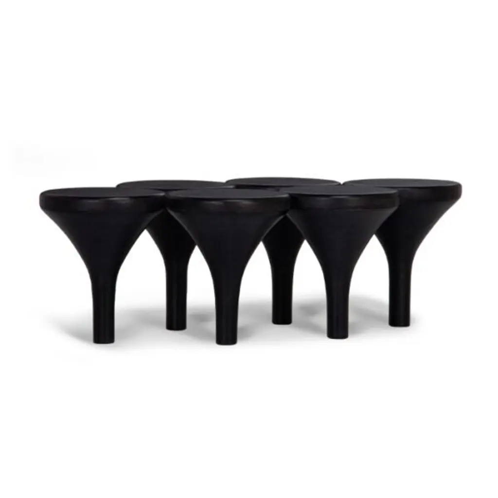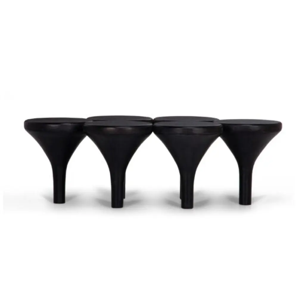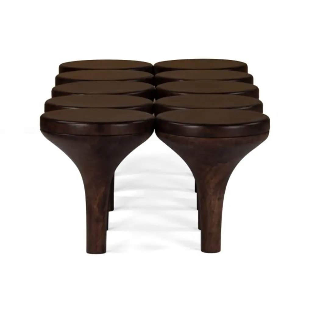 The Racine tables are an homage to the spectacular colonnade of the Johnson Wax building, designed by Frank Llloyd Wright. Identical, turned solid wood columns extend upwards and coalesce to create a tabletop of conjoined circual forms, finished by hand with a textured, wire brushed finish.