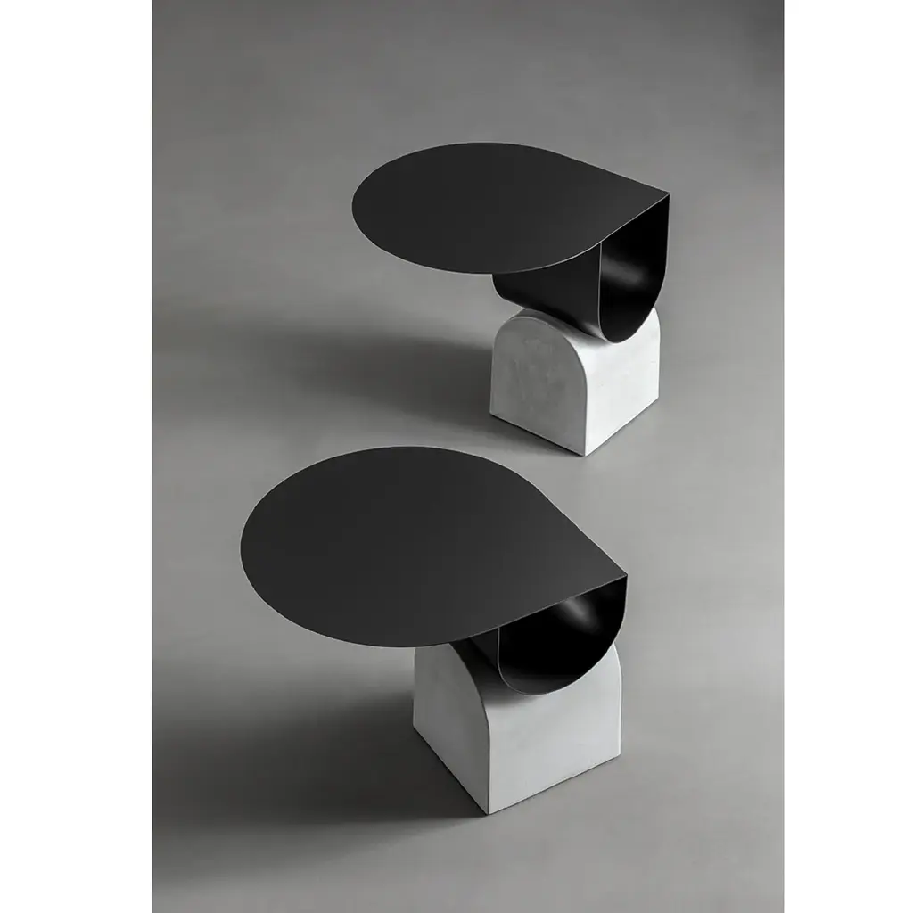 The Vague coffee table is a sculptural element that enriches the living area. The concrete base raises the metal upper section, which is available in different colors, in both a physical and figurative sense. The support top, with a curved and flowing shape that is similar to a raindrop, is ideal for placing near the sofa. The proportions of the tops make the tables pleasantly decorative as well as functional island elements within the living space.