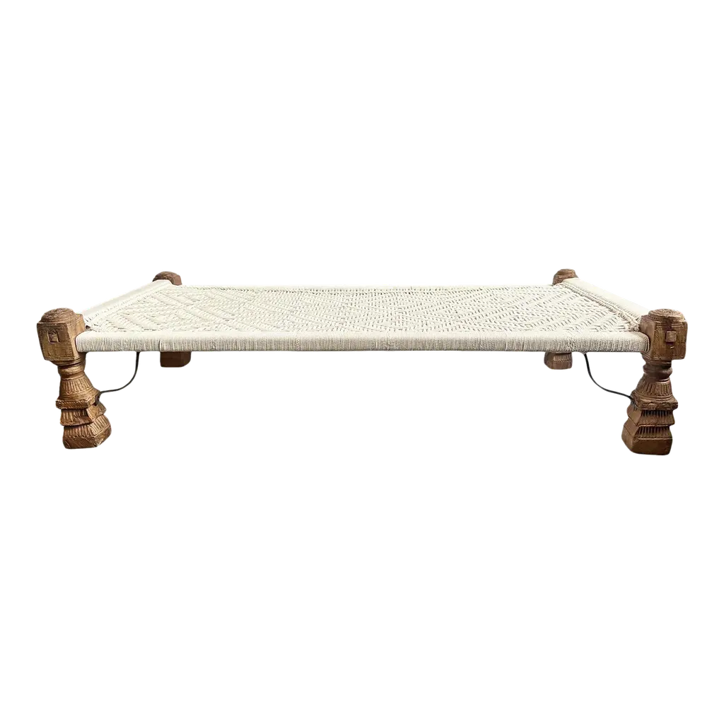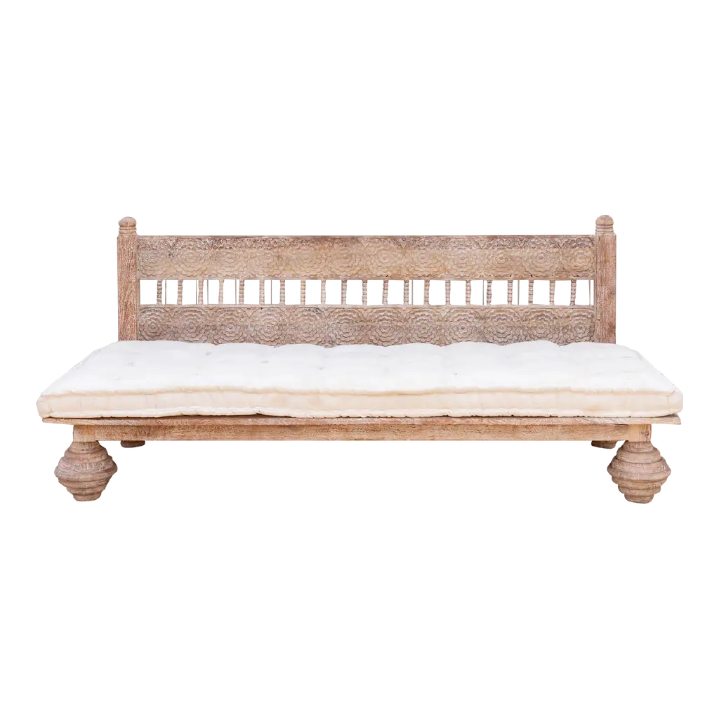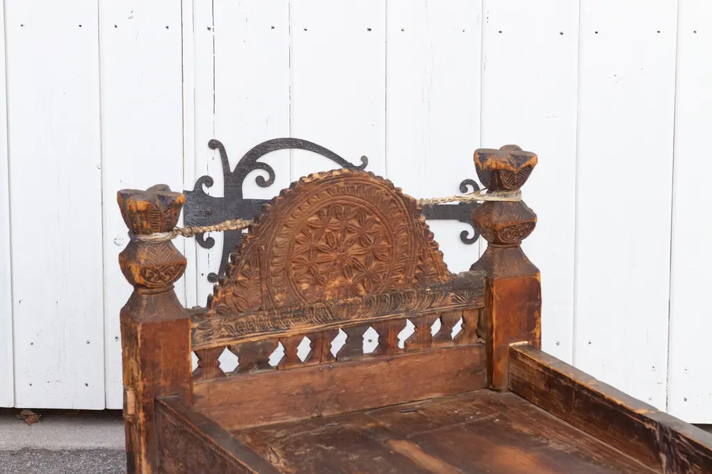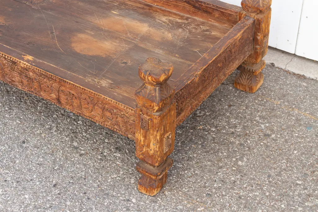 This charming antique bed from Swat Valley features finely carved details all around. This antique rustic child's bed is made from cedar wood and stands on square carved legs with a beautifully carved apron and headboard. The bed shows oxidation and discoloration normal to its age. Use it as a coffee table with a glass top or as a lovely bench by adding a cushion to it.
