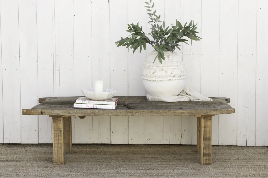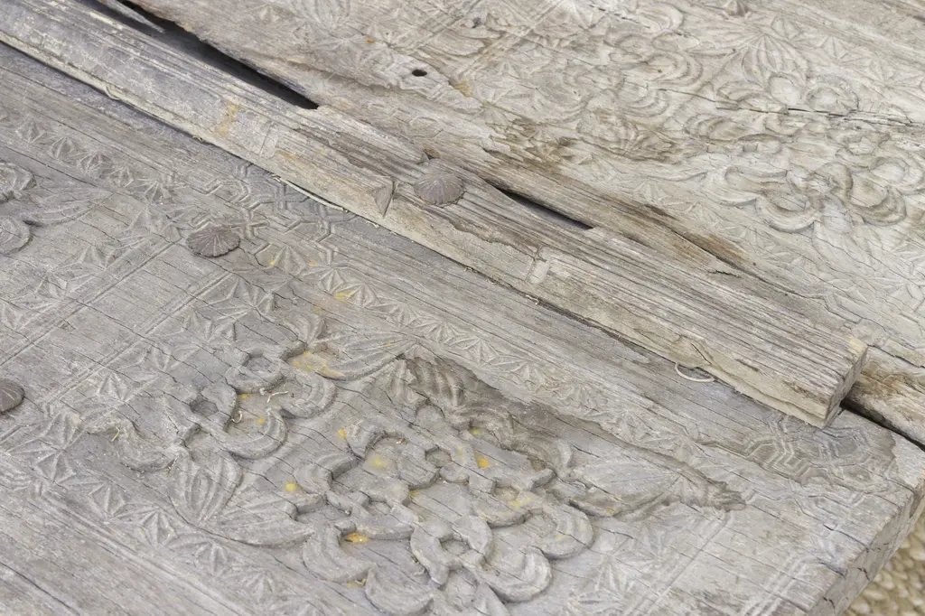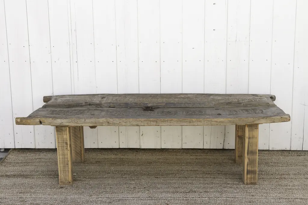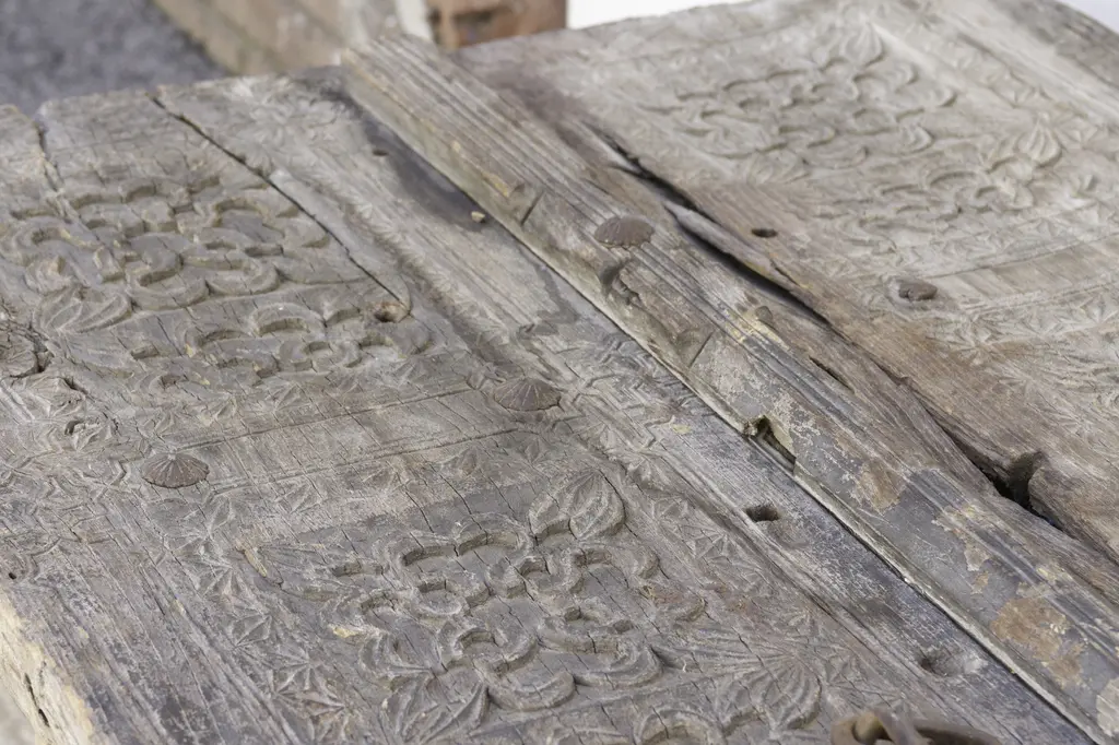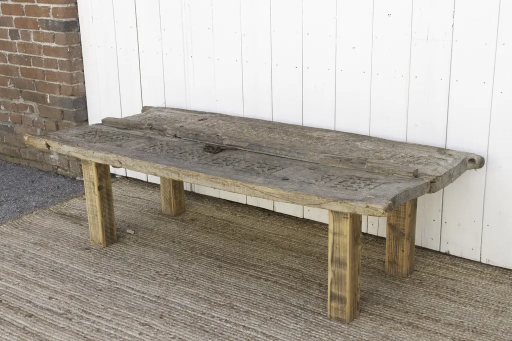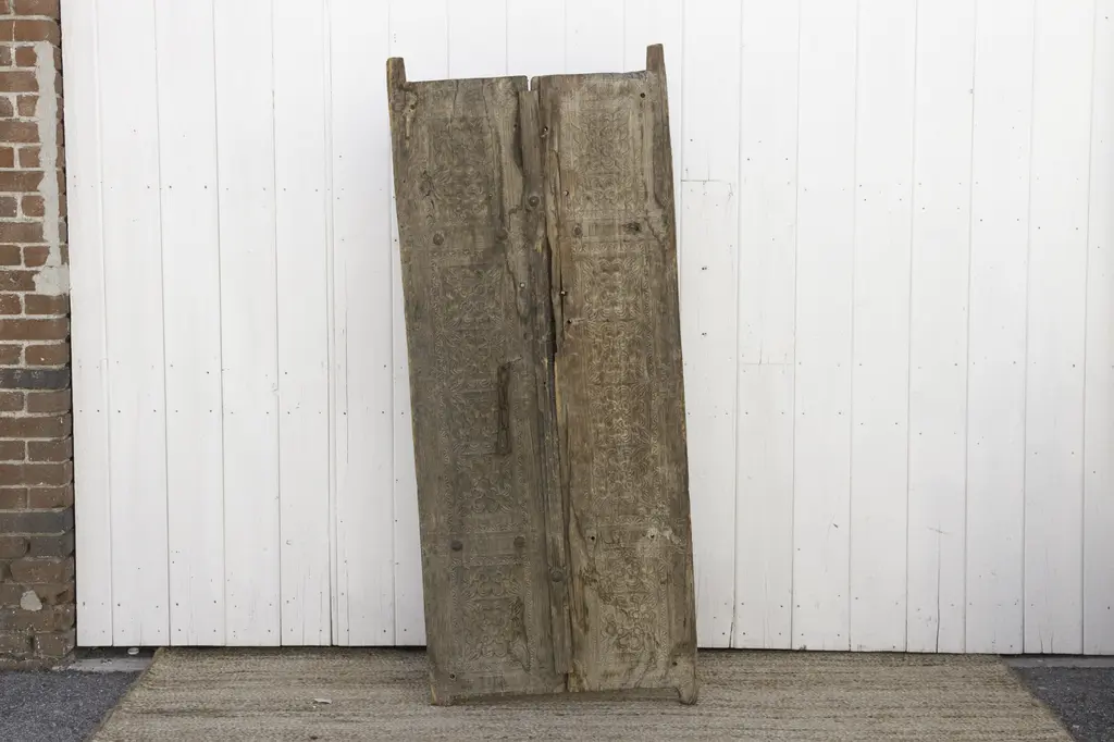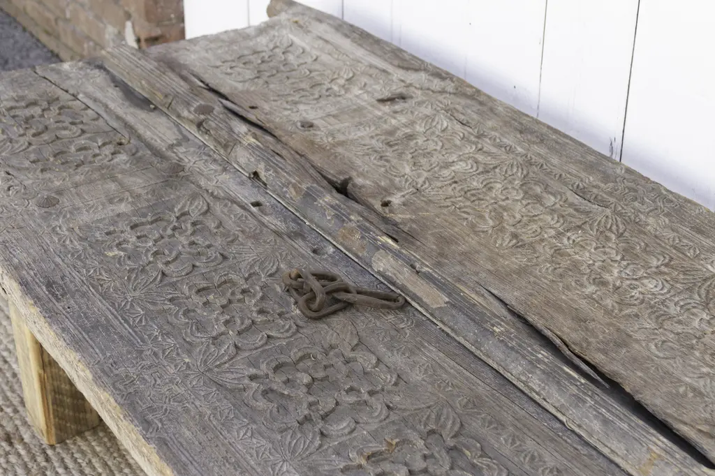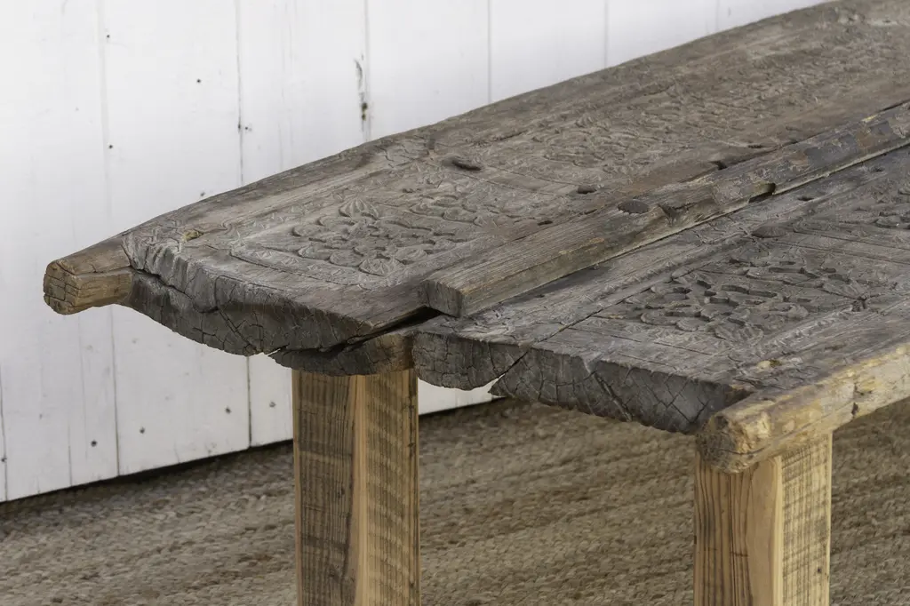 A rare architectural gem, this 18th century pair of doors was found in the Swat Valley and it now makes a wonderful one of a kind coffee table. This antique door coffee table stand on 4 rustic reclaimed wood square legs allowing the door itself to be the main feature. The doors feature a finely carved floral motif on both ends and still preserve their original decorative nailheads and oxidized gray patina. Please note, these doors were exposed to the elements and have warped and cracked.