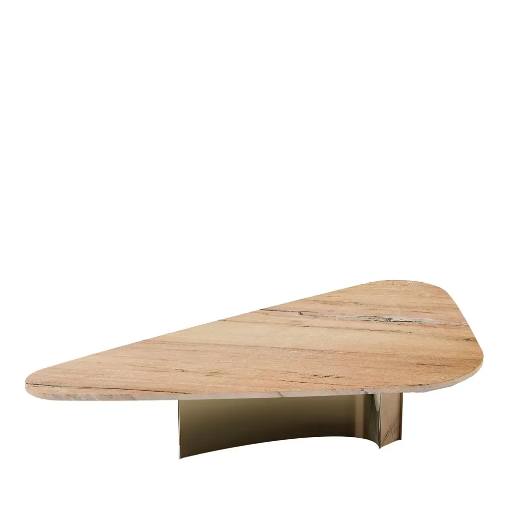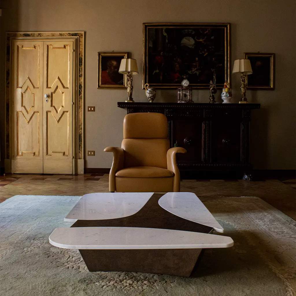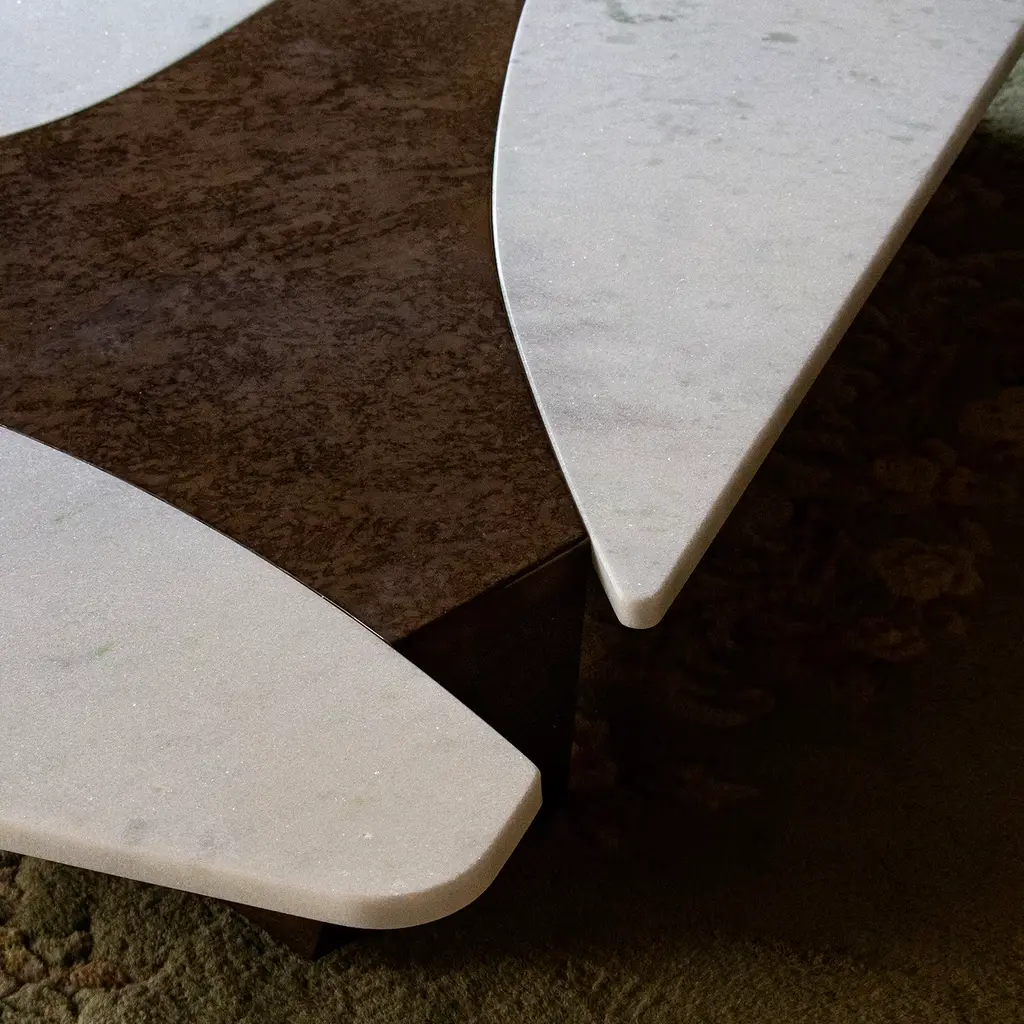 The coffee table is constructed from Pinta Verde marble and features a metal structure with an acid bronze finish. The metal structure has an organic and solid shape, which supports the three different marble slabs as if they were one single element. Customizable and available in different marble and metal finishes. Design by Paolo Ciacci.