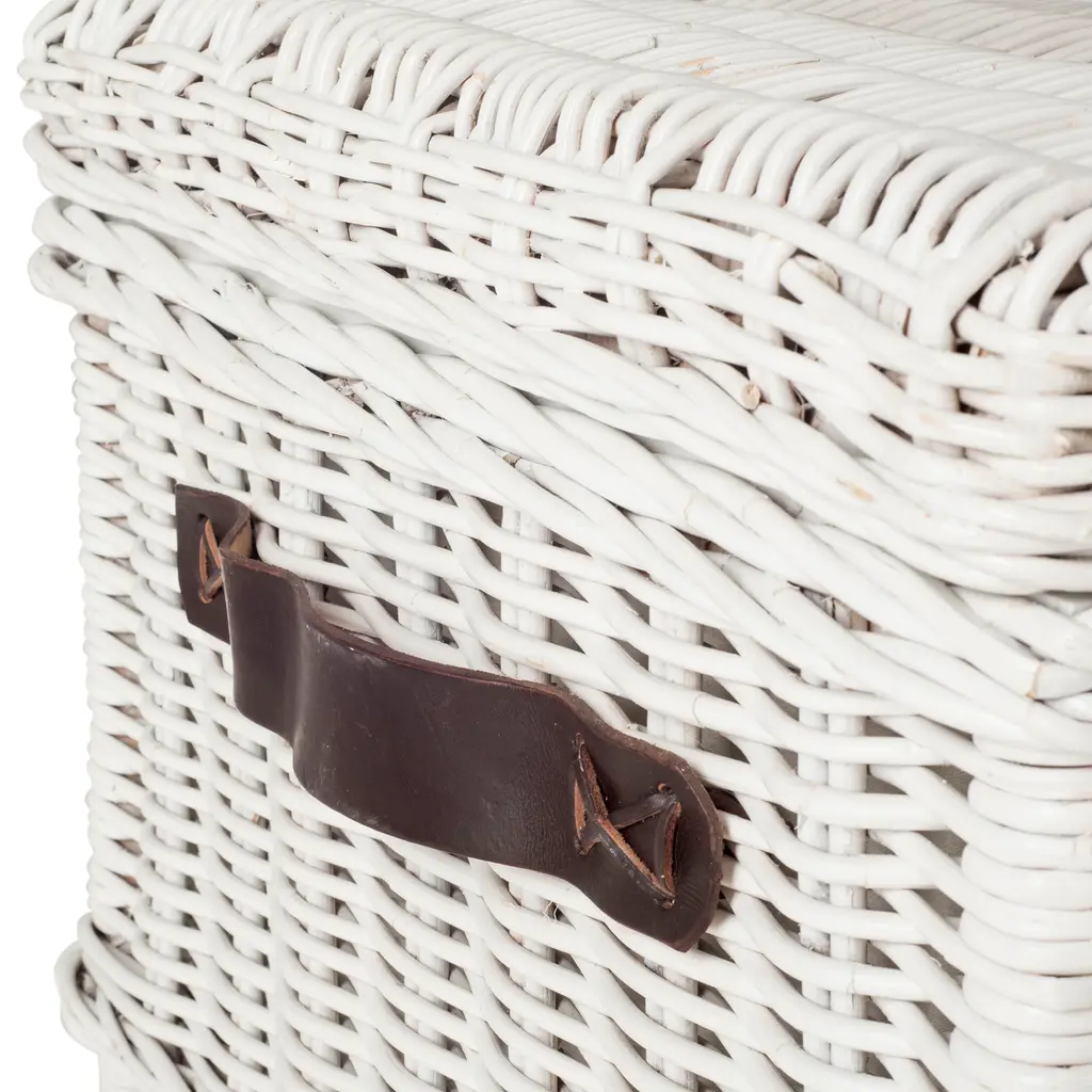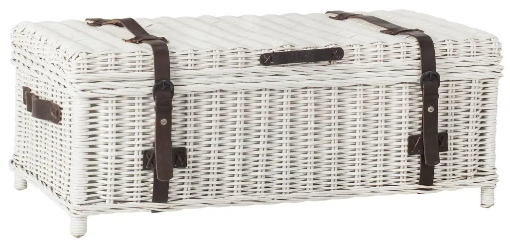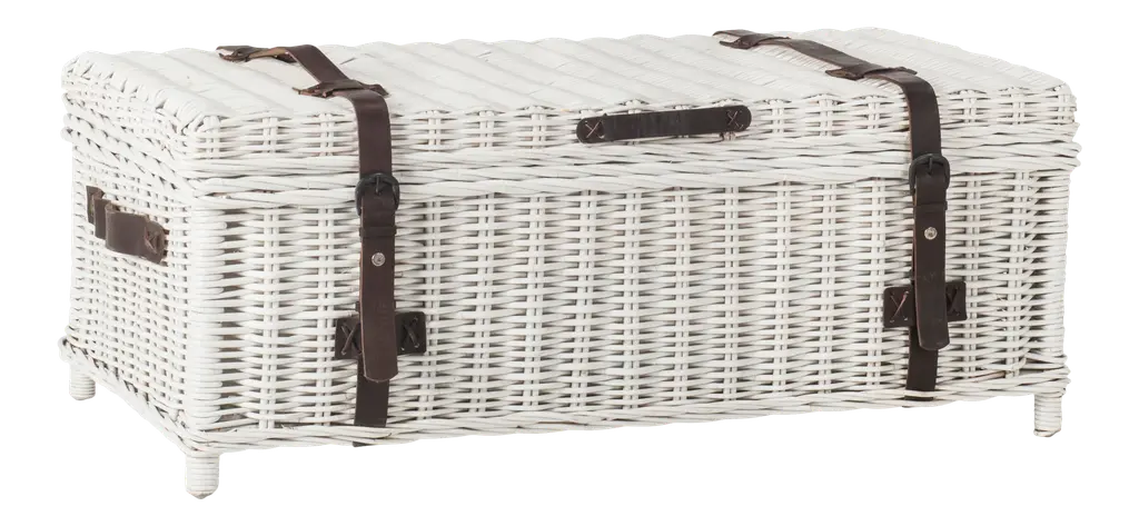 Brim With vintage charm, this white rattan coffee table serves double duty as a pretty piece of furniture. Designed with faux leather straps, cotton lining and hinge top, it it's ample interior holds your choice of blankets, pillows, clothes and more. Dust regularly with a soft, dry cloth. Never use oiled or treated cloths on lacquered finishes. Some finishes can be wiped with a damp (not wet) cloth, followed at once by rubbing with a dry cloth to remove fingerprints and smudges. For persistent spots, gently clean with a soft cloth and a solution of water and mild soap, make sure to wipe dry. Use adhesive felt pads, coasters and placemats to protect your furniture.