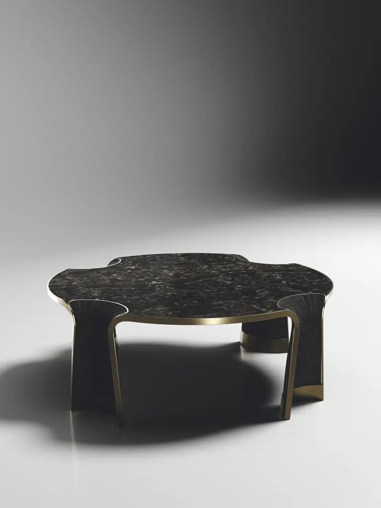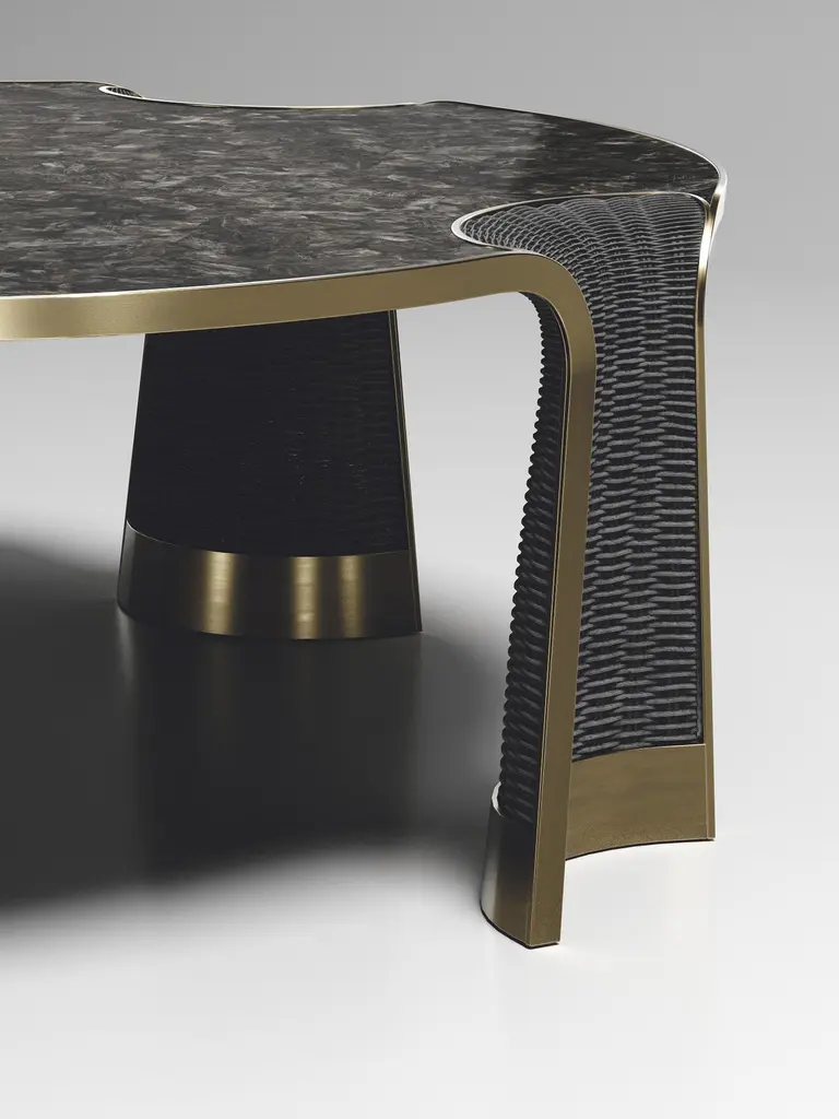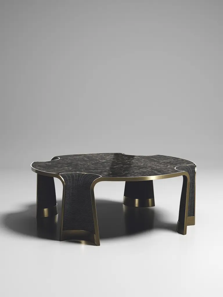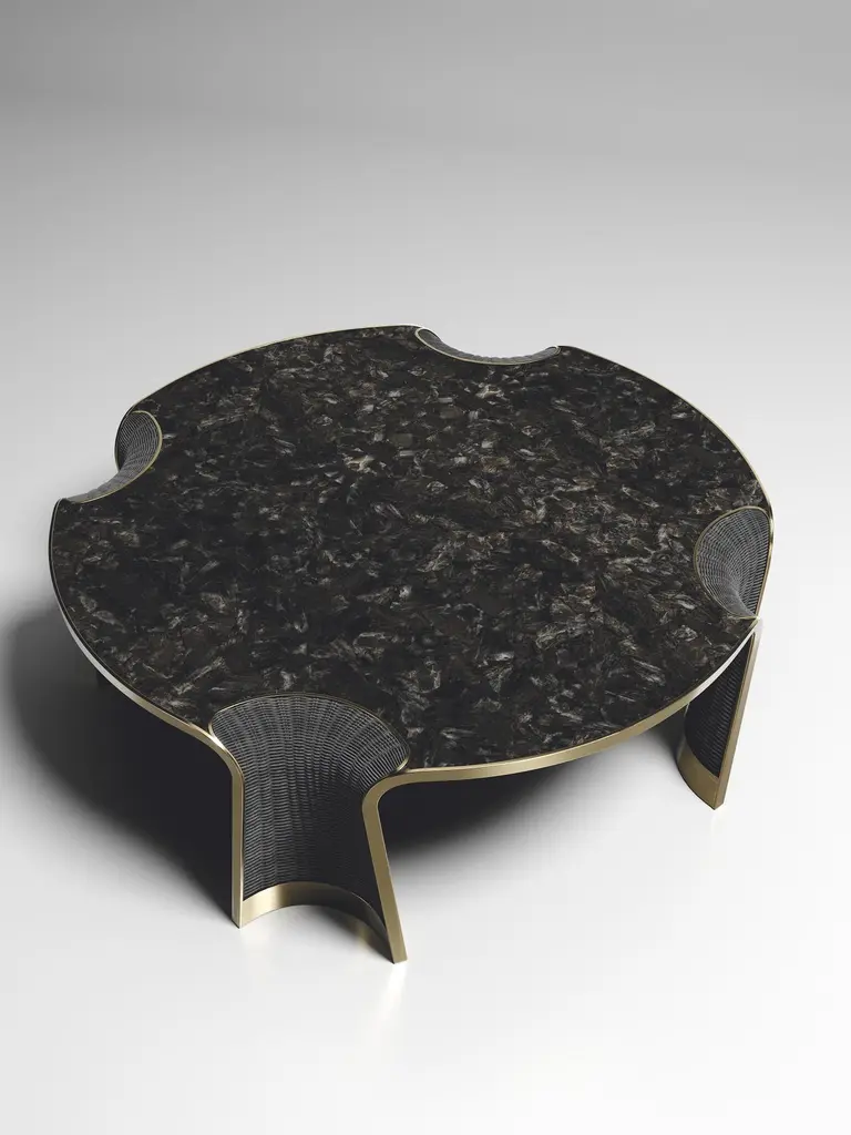 The Paris based label has distinguished themselves since their launch, with their iconic use of shagreen mixed with brass and other exotic materials. All furniture is handcrafted by skilled artisans, ultimately making each piece unique, designed in Paris and produced in the Philippines.The Nymphea round coffee by R & Y Augousti is a part of their new Rattan capsule launch. The piece explores the brand's iconic DNA of bringing old world artisanal craft into a contemporary and utterly luxury feel. This table is done in a black rattan finish, with a smokey black quartz inlaid top and bronze patina brass details. Available in other finishes. Part of the Augousti Rattan capsule, see images of the collection at end of slide. Custom sizing/finishing on request.Design SKU reference: CF53The dimensions of this piece are:111.2 diameter x 40 cmAll R & Y Augousti pieces are handmade by artisans, ultimately making each piece unique.Acclaimed design duo Ria & Yiouri Augousti have established themselves since the 1990s as pioneers of modern-vintage style through their luxurious Art Deco inspired collections.The Paris based label has distinguished themselves since their launch, with their iconic use of shagreen mixed with brass and other exotic materials. All furniture is handcrafted by skilled artisans, ultimately making each piece unique. All shagreen-covered items should be kept out of direct sunlight, color variants may occur on the stingray and other exotic finishes, but this showcases the Parisian label's commitment to creating authentic luxurious products using natural components.Wipe clean with soft dry cloth.