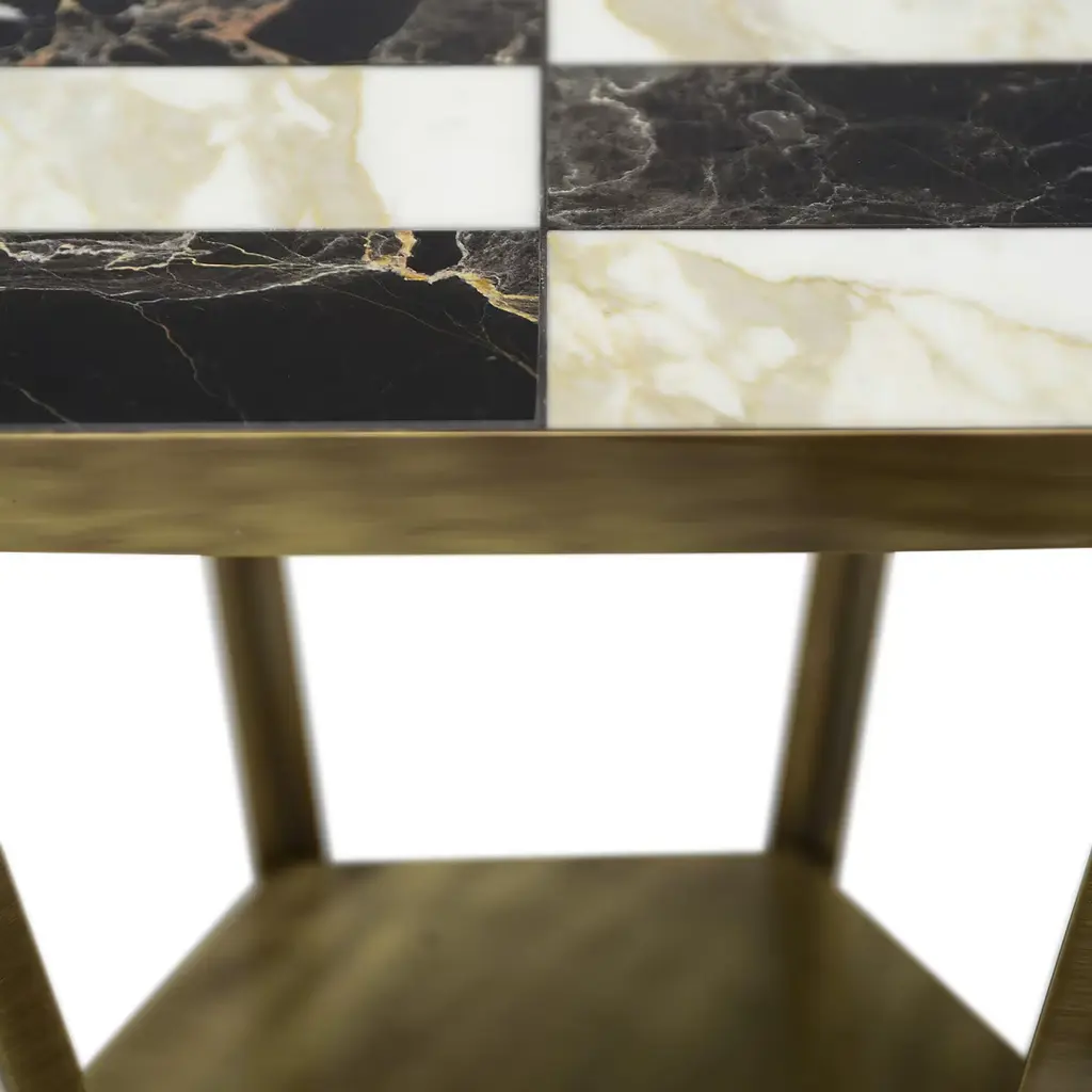The structure of this striking coffee table, designed by Studio 63 for Marioni, is a brass hexagon supporting the marble top with the help of six elegant brass legs. This piece is available in several configurations of finishes and marbles. In this case the brass structure supports a marble top in gold Calacatta and black Saint Laurent.