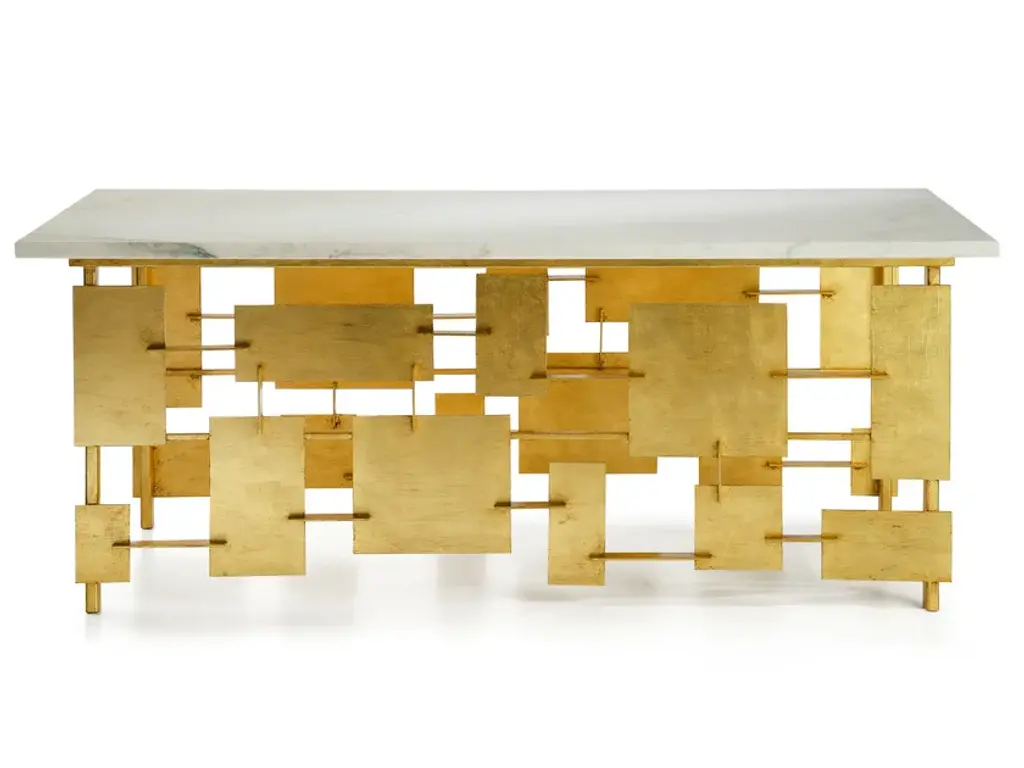 Raymond is a unique coffee table made with welded iron elements. Decorated with the application of gold leaf and provided with marble top of different materials.Raymond is a collection of tables with metal structure and marble tops characterized by geometric elements that create an unusual composition.