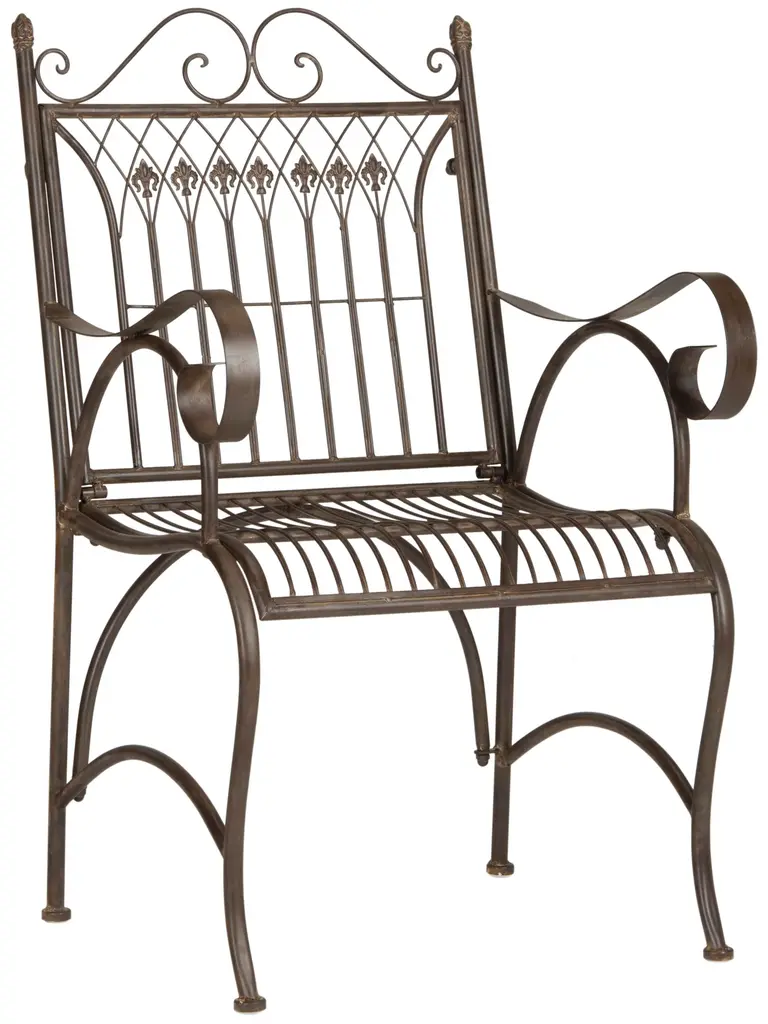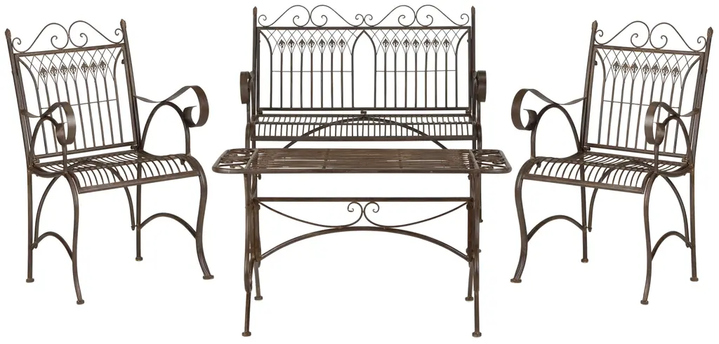 Dripping with turn of the charm, this rustic brown four-piece outdoor set adapts handsomely to Craftsman, Art Nouveau or Victorian settings. Crafted of intricately-worked iron, this romantic set includes a love seat, two chairs and coffee table. Store outdoor furniture indoors or cover well when not in use. Remove wooden furniture from standing water. Dust regularly with small brush or vacuum. Spills should be taken care of immediately before they harden or stain with a slightly dampened sponge. Do not use bleach solutions. Some assembly required. Individual Dimensions: BENCH (1): 44 X 23.5 X 38 CHAIR (2): 23.5 X 23.5 X 38 TABLE (1): 39.25 X 23.5 X 22