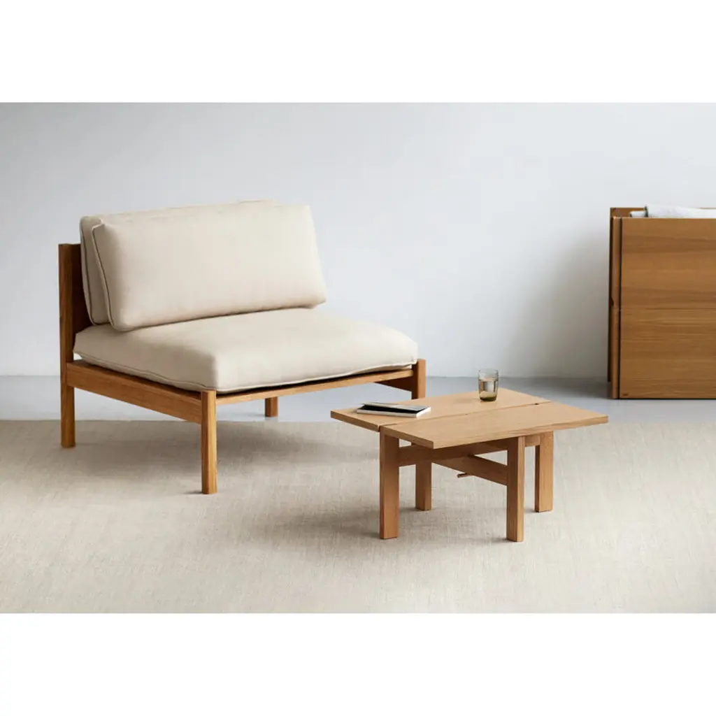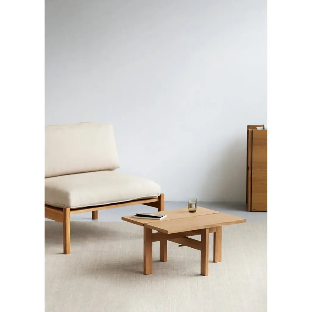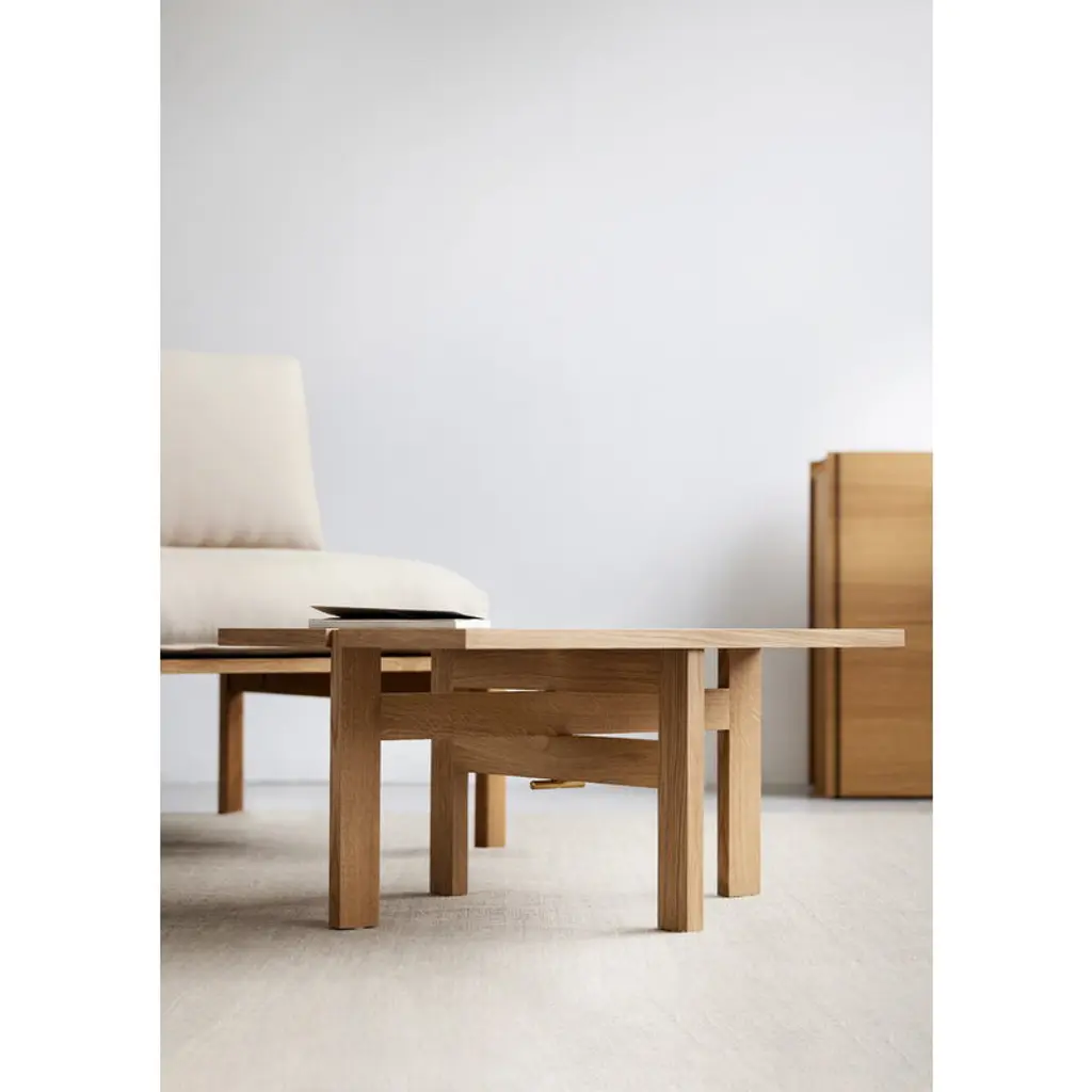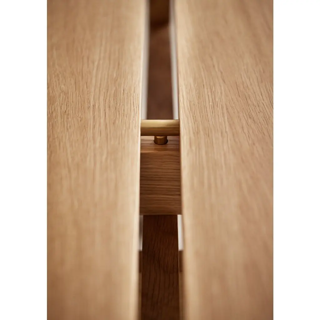 Moebe’s Rectangular coffee table is more than just a beautiful piece of oak furniture, as its intrigue is enhanced further by a distinctive structure. Beneath the minimalist tabletop, the cross-shaped leg frame’s parts meet perfectly in the middle, brought together by a brass screwing mechanism. The one-of-a-kind design gives the corners space to breathe, affording the low-profile Rectangular table an airy and light feel – and potentially even the title of the most captivating item in the living room.