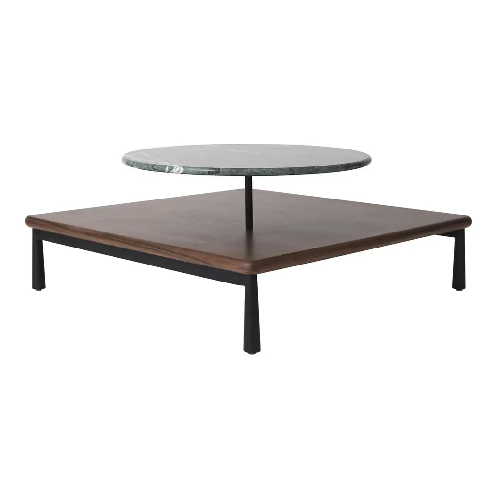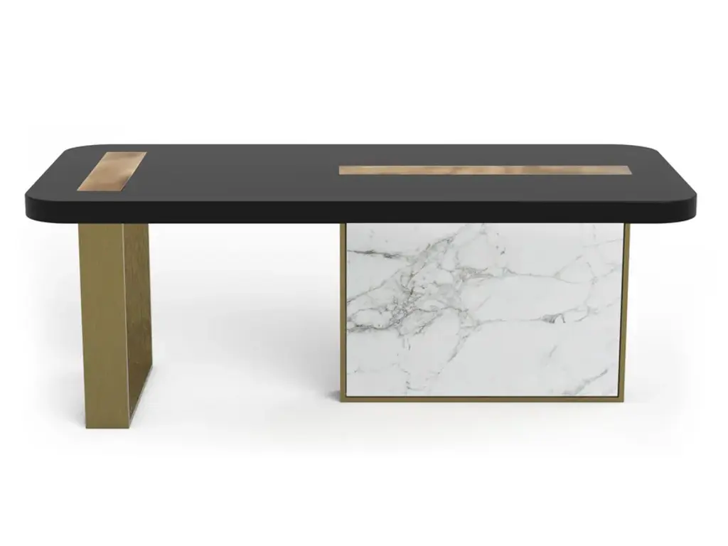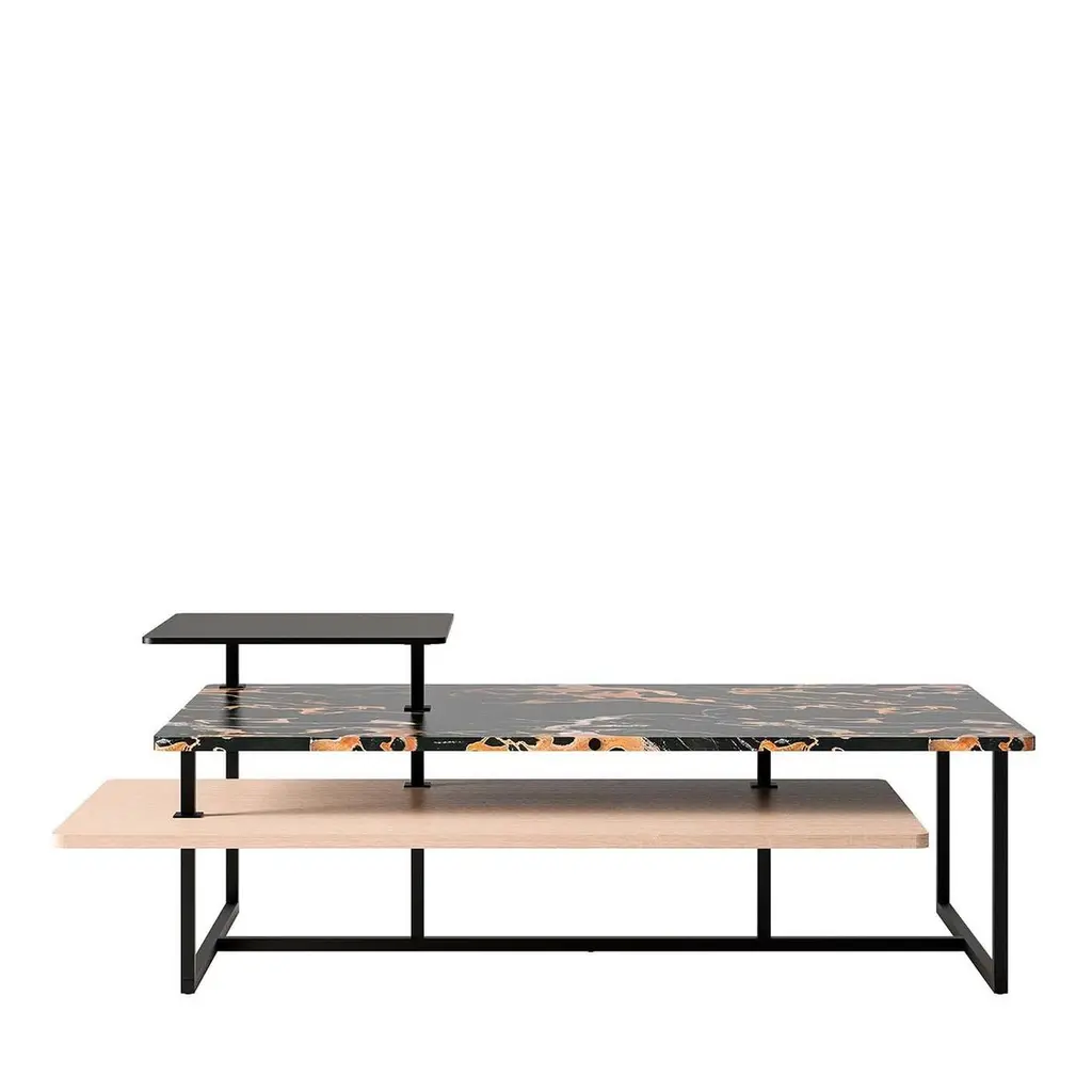 Sleek lines and geometric composition are the hallmarks of this sophisticated coffee table from the Sesto Senso collection. An innovative and unique design that will make a statement in minimalist and contemporary interiors, this coffee table develops on three levels, each defined by a pattern in an interplay of great visual effect. Supported by a trestle base of black-finished metal, the tops are in black-finished metal, black marble with golden-orange veins, and natural veneered wood. Elegant and timeless, this coffee table will be the perfect piece for infusing style into any living room.