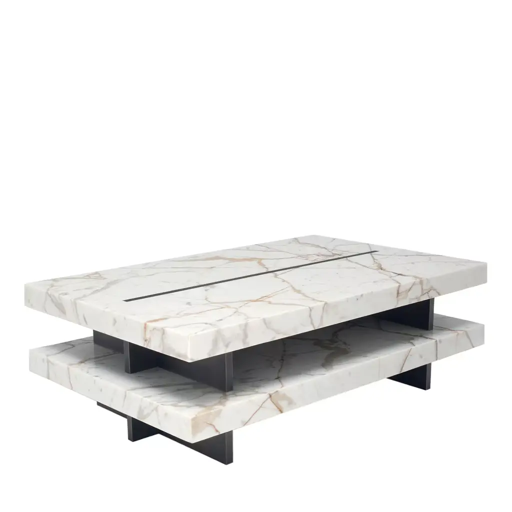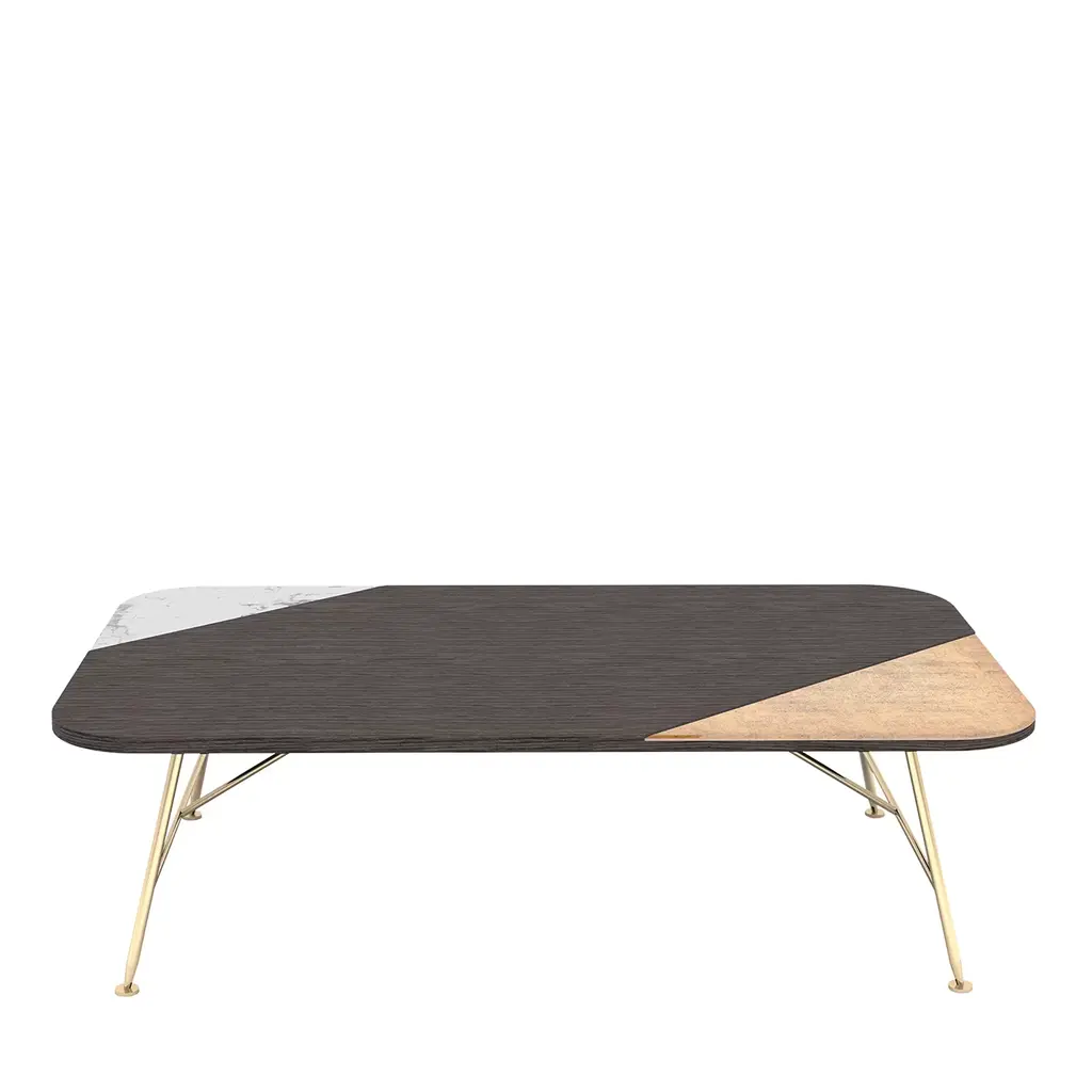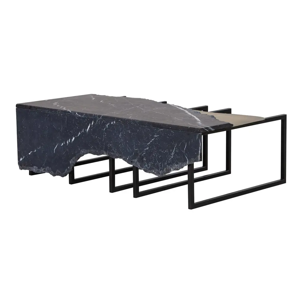 Sleek lines and geometric composition are the hallmarks of this sophisticated coffee table from the Sesto Senso Collection. An innovative and unique design that will make a statement in minimalist and contemporary interiors, this coffee table develops on three levels, each defined by a pattern in an interplay of great visual effect. Supported by a trestle base of black-finished metal, the tops are in black-finished metal, black marble with golden-orange veins, and natural veneered wood. Elegant and timeless, this coffee table will be the perfect piece for infusing style into any living room.