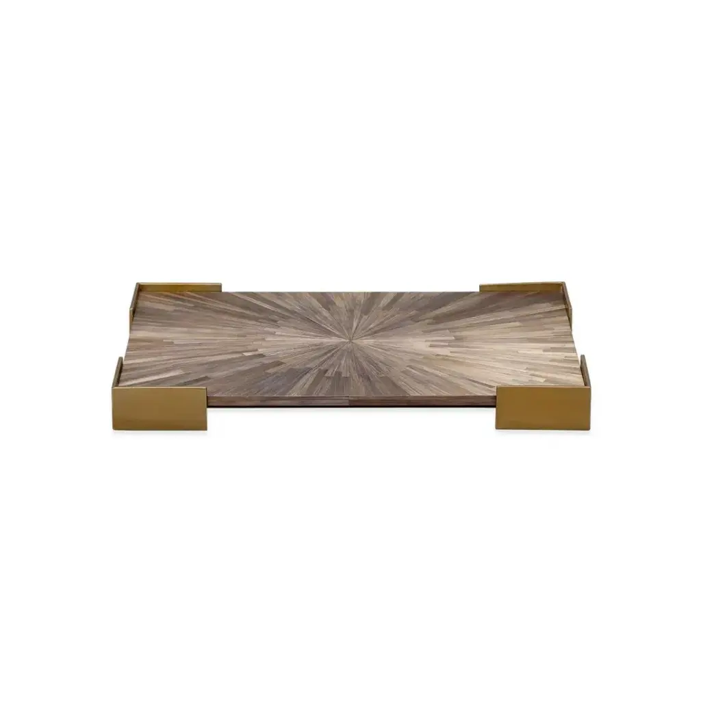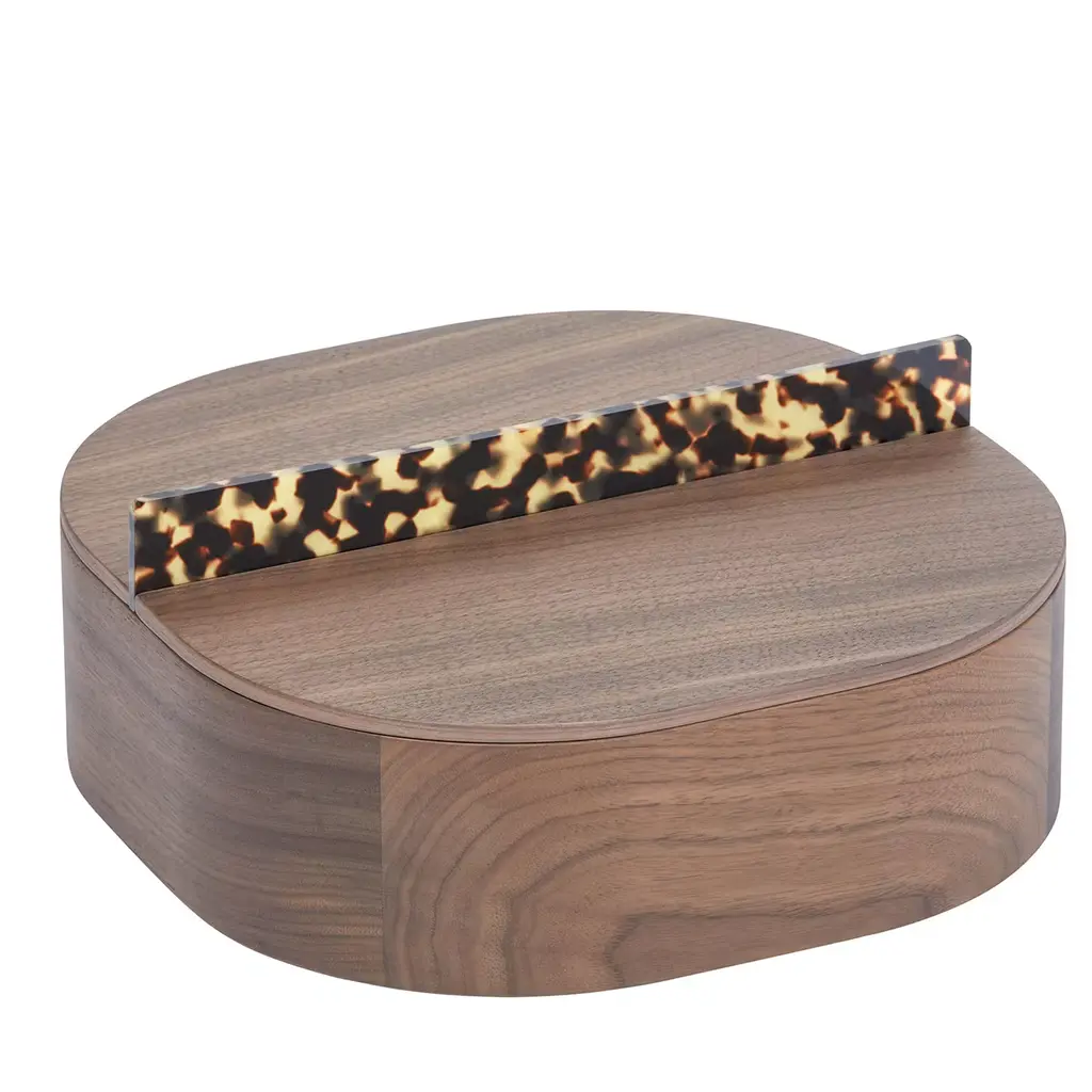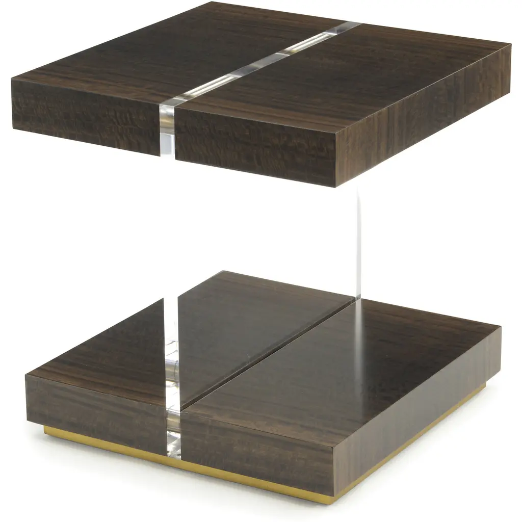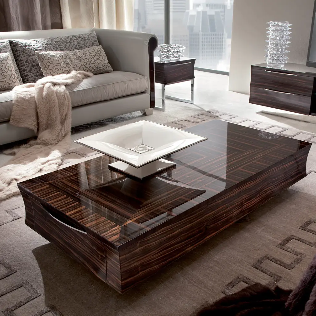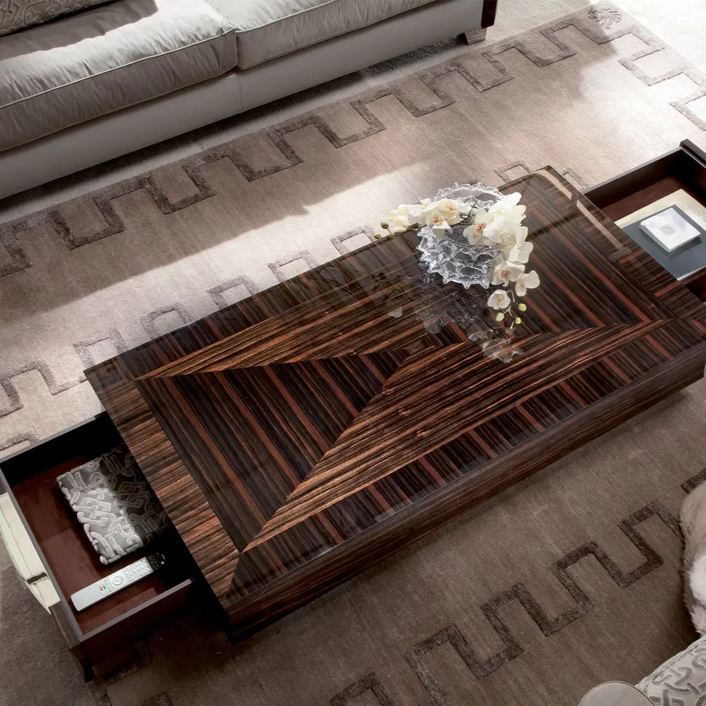 Rectangular wooden cocktail table in Makassar ebony veneer in satin finish. two full extension drawers with a bottom in velvet fabric. Two handles and base in stainless steel.