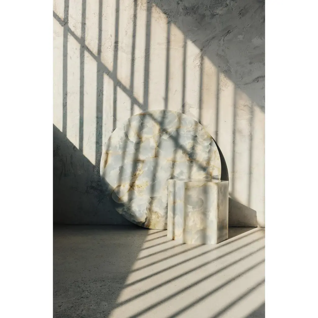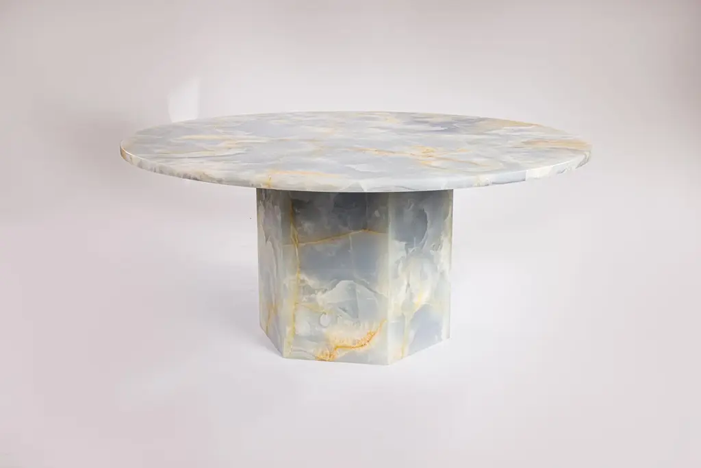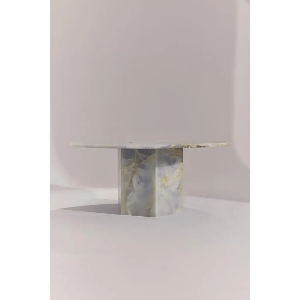 Taffy Blue Onyx Coffee Table by RAFFINATODimensions: Ø 100 x H 38 cm.Materials: Blue onyx.This table is available in different stone options: White Travertine, Calacatta Viola, Rosso Levanto, and white/blue/green/pink Onyx. Please contact us.Taffy brings a fresh perspective to the modern furniture world with its multifaceted design approach. This unique piece combines aesthetics and functionality, transforming into a side table model when its top surface is lifted. Resembling confectionery, the smooth and glossy texture of this top surface also serves as a visual feast akin to a painting within interior spaces. Thus, three distinct designs converge into a single object. Taffy adds a dynamic and timeless allure to any space with its variety of color options.RAFFINATO is a design brand specializing in natural stone. Inspired by the mystic nature of marbling art and the intercontinental spirit of Istanbul, designer Dicle Varsak transforms precious natural stones into outstanding design objects.RAFFINATO was created as an appreciation of the hidden gems of nature, such as marble, onyx, and travertine. The trace of time, infinite color and texture combinations, and fluid, dynamic creation are characteristic features of natural stone that ensure each design piece is unique and personalized.Our mission is to create functional and sculptural designs that enable users to establish a strong connection with the concept of beauty. Each design is the result of a refined combination of geometry, color, and texture.At the center of our work is a deep passion for design, producing high-end furniture, respecting natural stone, and revealing the unique pieces hidden within the stone.
