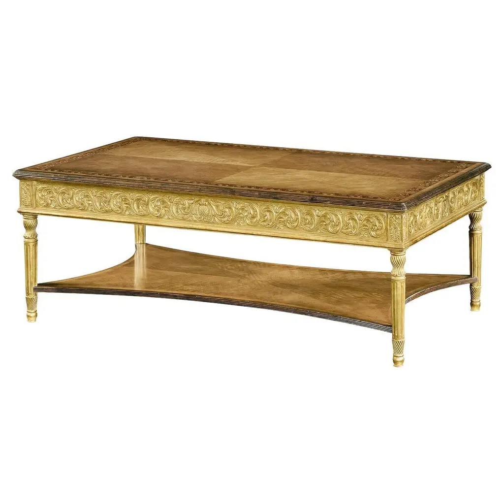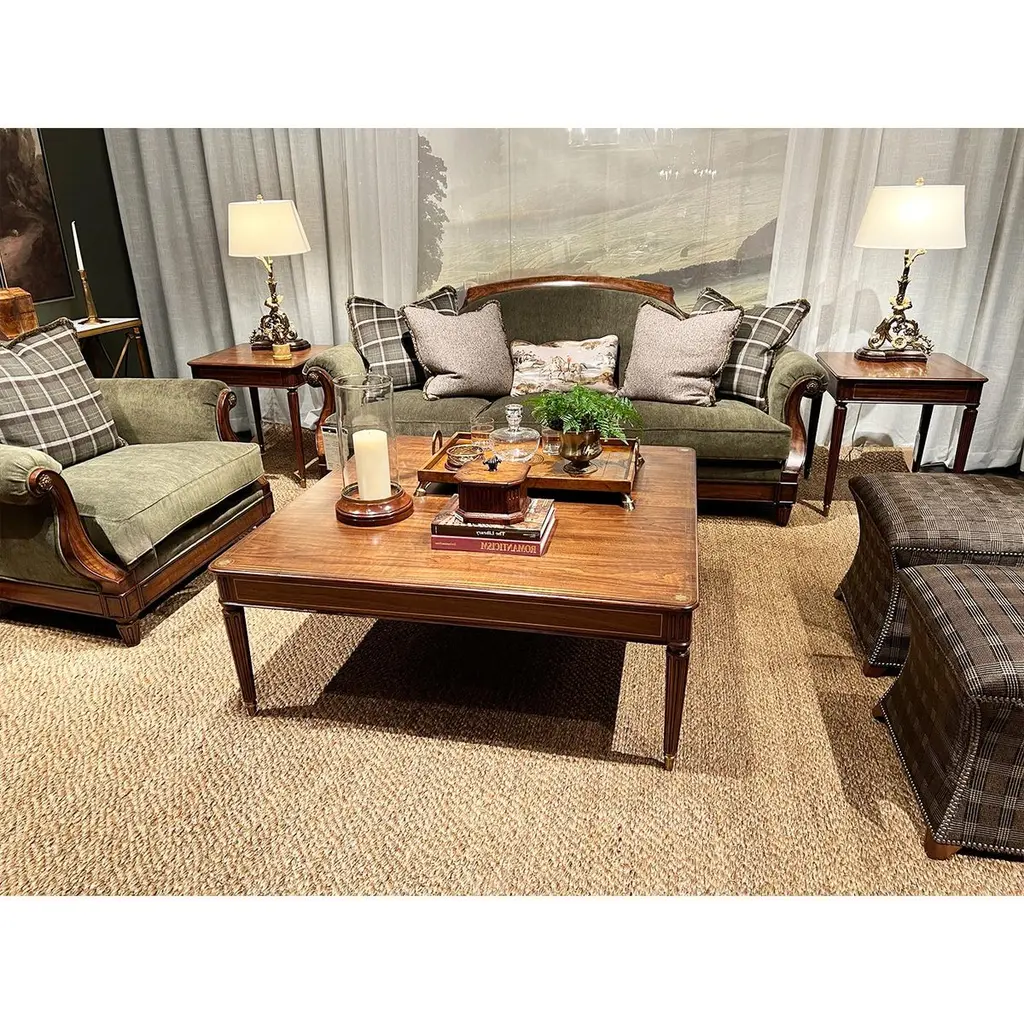 Bring classical sophistication and architectural grace to the heart of any living space. Crafted in a warm walnut finish, its generously scaled square top is accented with fine brass inlays, adding a subtle gleam to the richly figured wood grain.Tapered, reeded legs with brass-capped feet anchor the piece in neoclassical tradition, drawing from early 19th-century English design. The table’s balanced proportions and decorative restraint make it a commanding centerpiece, equally suited to formal seating areas and curated transitional interiors.Dimensions: 52" W x 52" D x 20" H