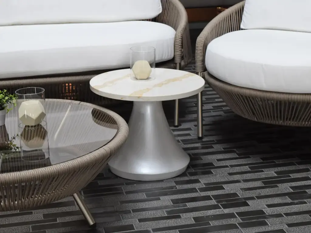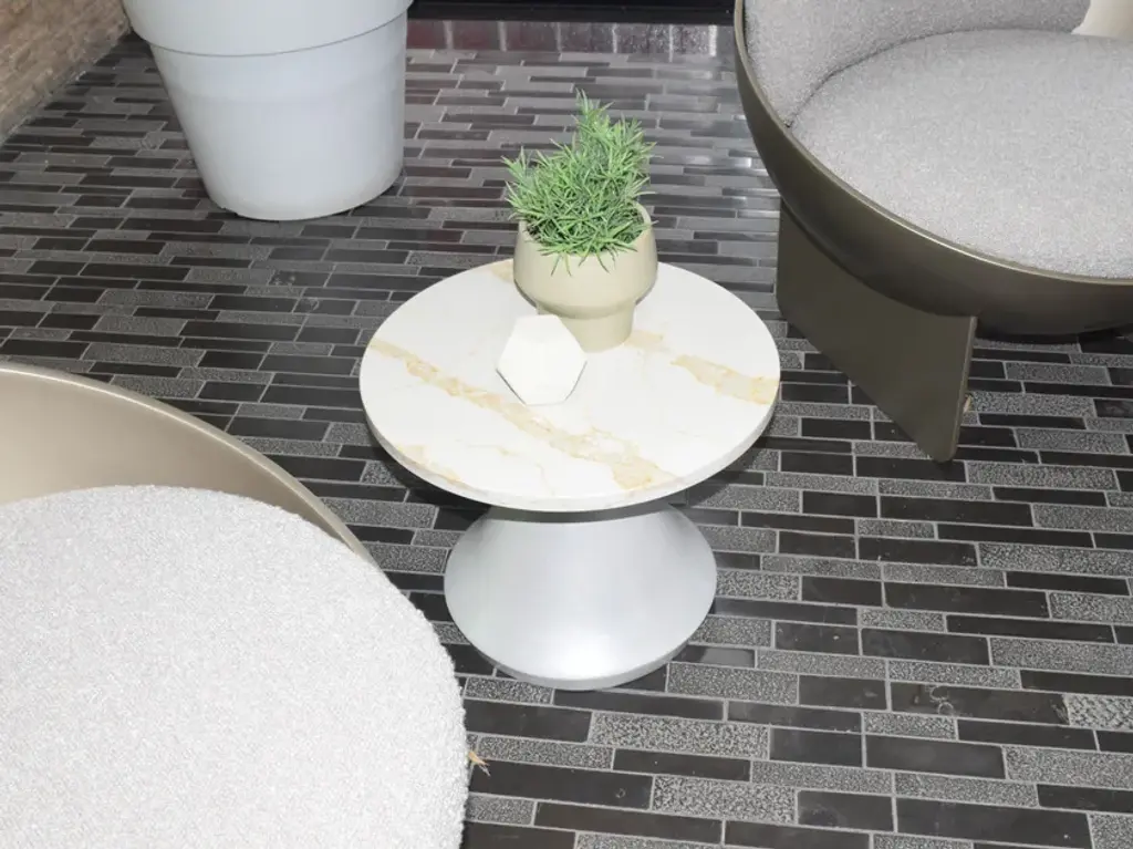 REIMS is a round table, iconic with a modern touch.Its distinctive design and silhouette are paired with an organic shape, making it a standout element.Characterized by clean lines and a modern aesthetic, it will brighten your coffee space. Additionally, it is functional in any room of the home or business. A geometrically simple play that transitions from a square shape to a circular one, bringing us back to our roots.Top: marbleBase Structure: resin