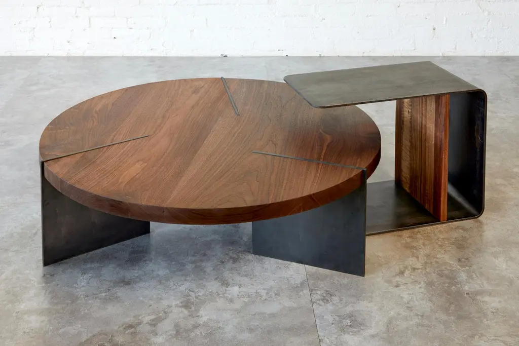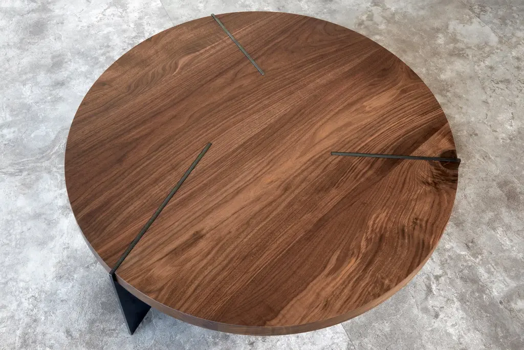 The Reina round coffee table in whitened Western Maple wood is striking and dramatic with meticulous craftsmanship. The tabletop sits on three asymmetrical blackened steel legs that have been carefully inset into the tabletop to create interest and add levity.The modern industrial design by Kirk Van Ludwig combines these elements to create a contemporary coffee table. Sustainably crafted piece of furniture made to last a lifetime. "Subtle differences in the leg size create tension to the already substantial intrigue of this piece, it's often the smallest things for which adds the most drama."60" D x 16.5" H.Shown in Whitened Western Maple with oil and wax finish. Customizable options for wood species: Whitened Ash, Black Walnut, White Oak and Torched Oak.Features:Solid walnut tabletop with asymmetrical blackened steel legsDesigned by award-winning designer Kirk Van LudwigSustainably crafted to last a lifetimeReina Walnut table shown paired with the Shape of Weight side table, available separately.
