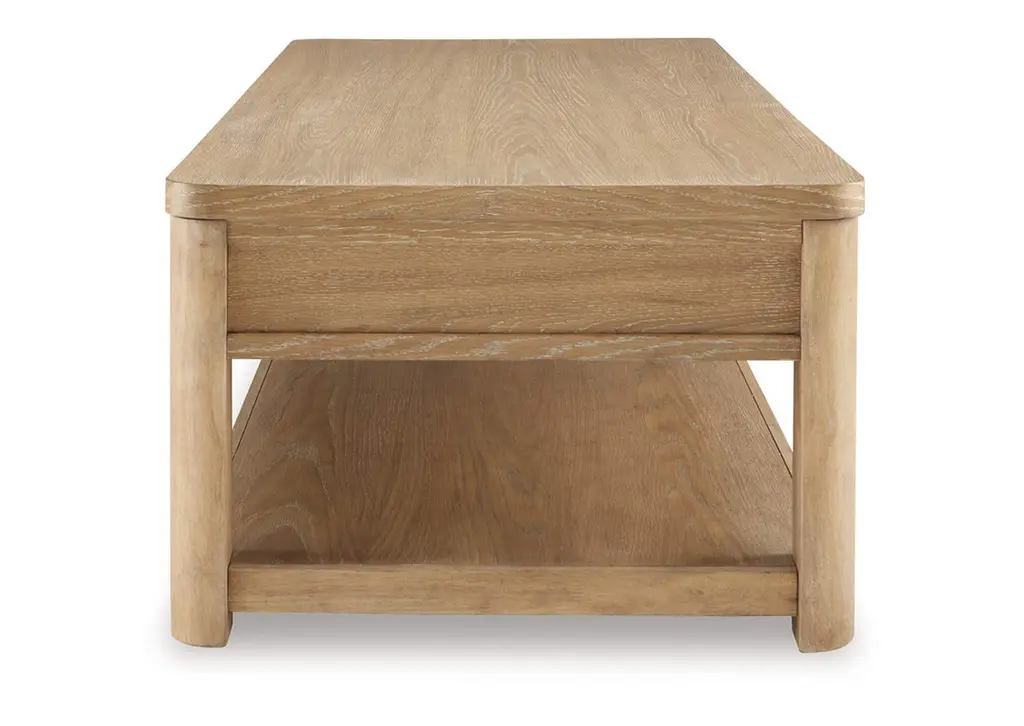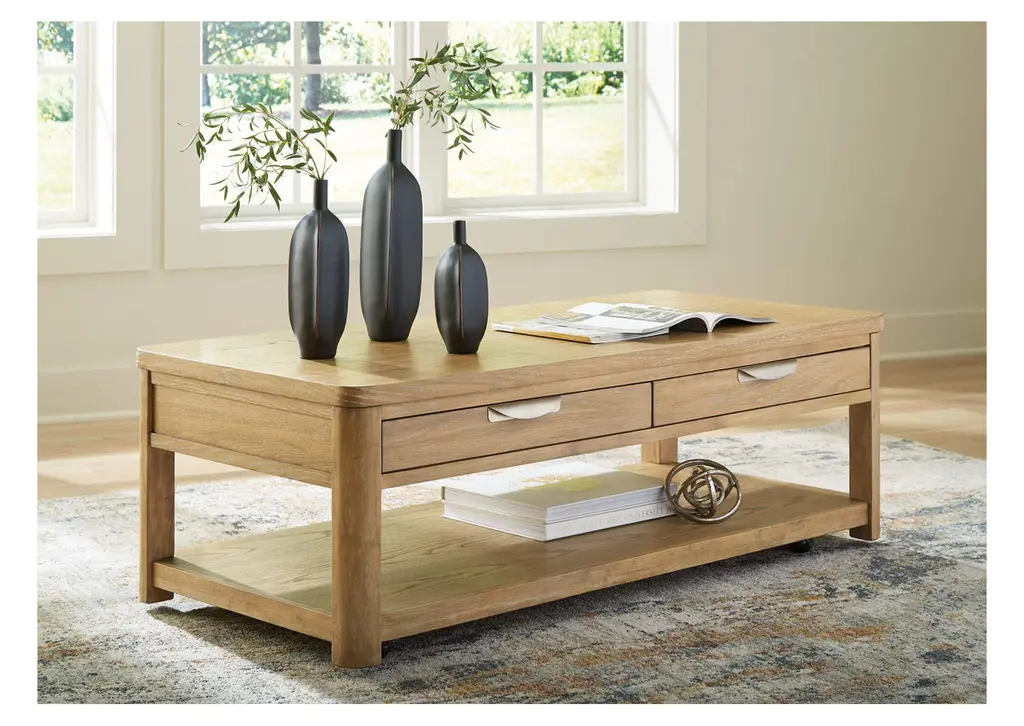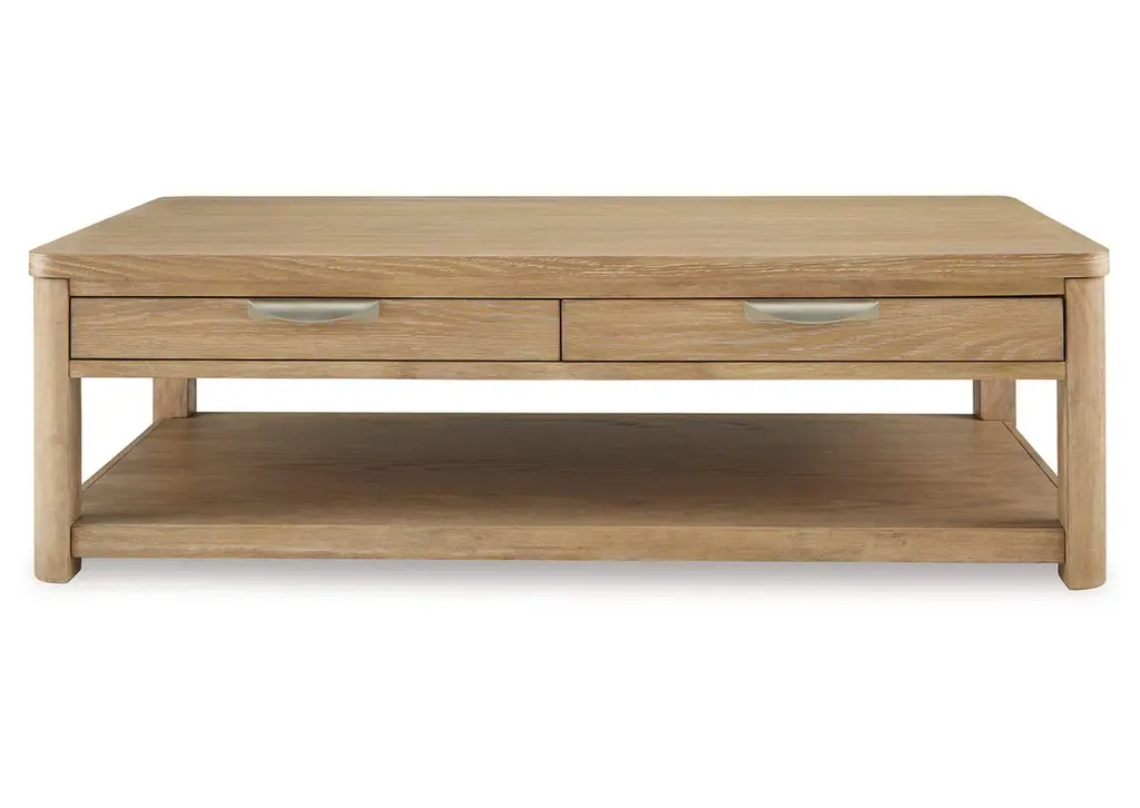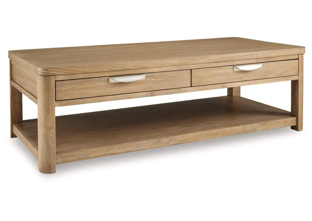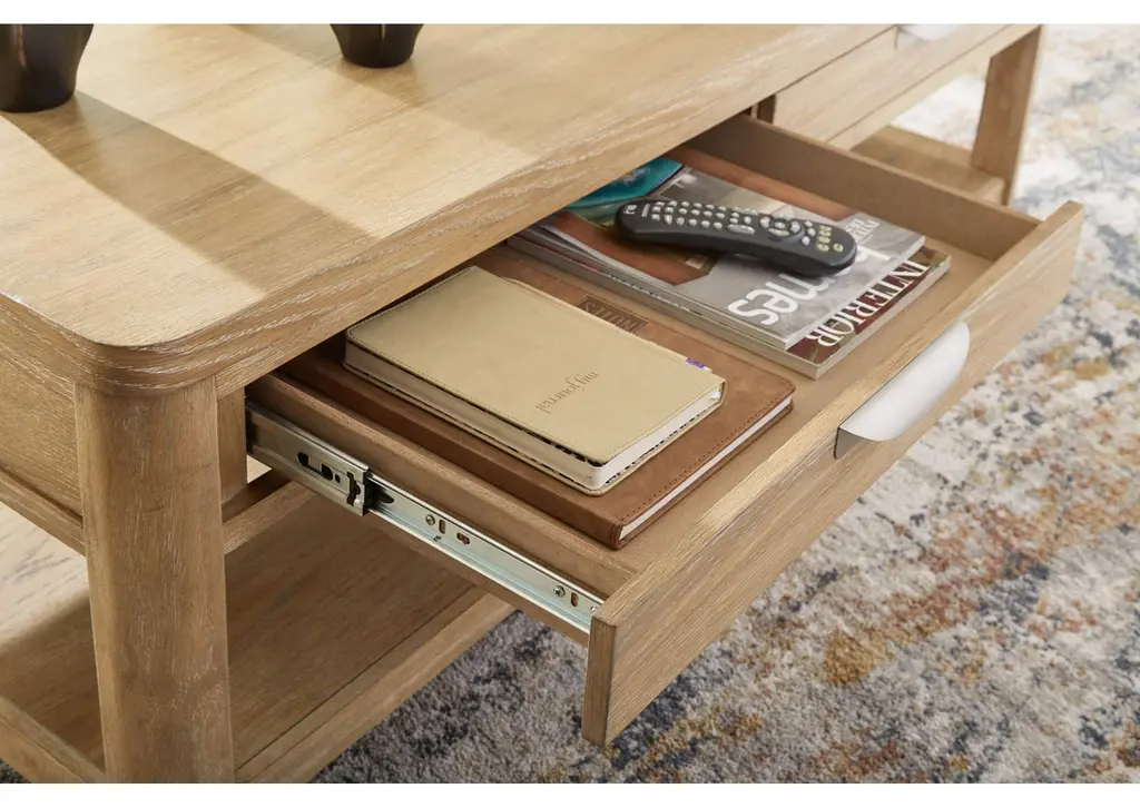 The Rencott coffee table's classic yet contemporary good looks are hard to deny. Softly shaped posts with a light oak finish and wire-brushed wood grain texture lend an organic appeal to your soothing space. Roomy drawers cater to additional storage needs while keeping clutter at bay. Plus there's plenty of display space on the lower shelf for, ahem, coffee table books. Weight 103.000 lbs. (46.35kgs.)